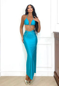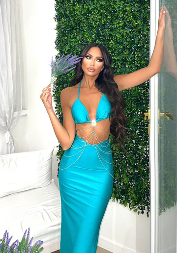 Scintilla di sensualità e stile con Midnight Chains, l’abito nero pensato per non passare inosservata. Il top a triangolo valorizza il décolleté , mentre le catene gioiello che abbracciano il punto vita creano un effetto scenografico audace ma raffinato. La gonna lunga con spacco laterale slancia la figura e aggiunge un tocco di femminilità irresistibile.
