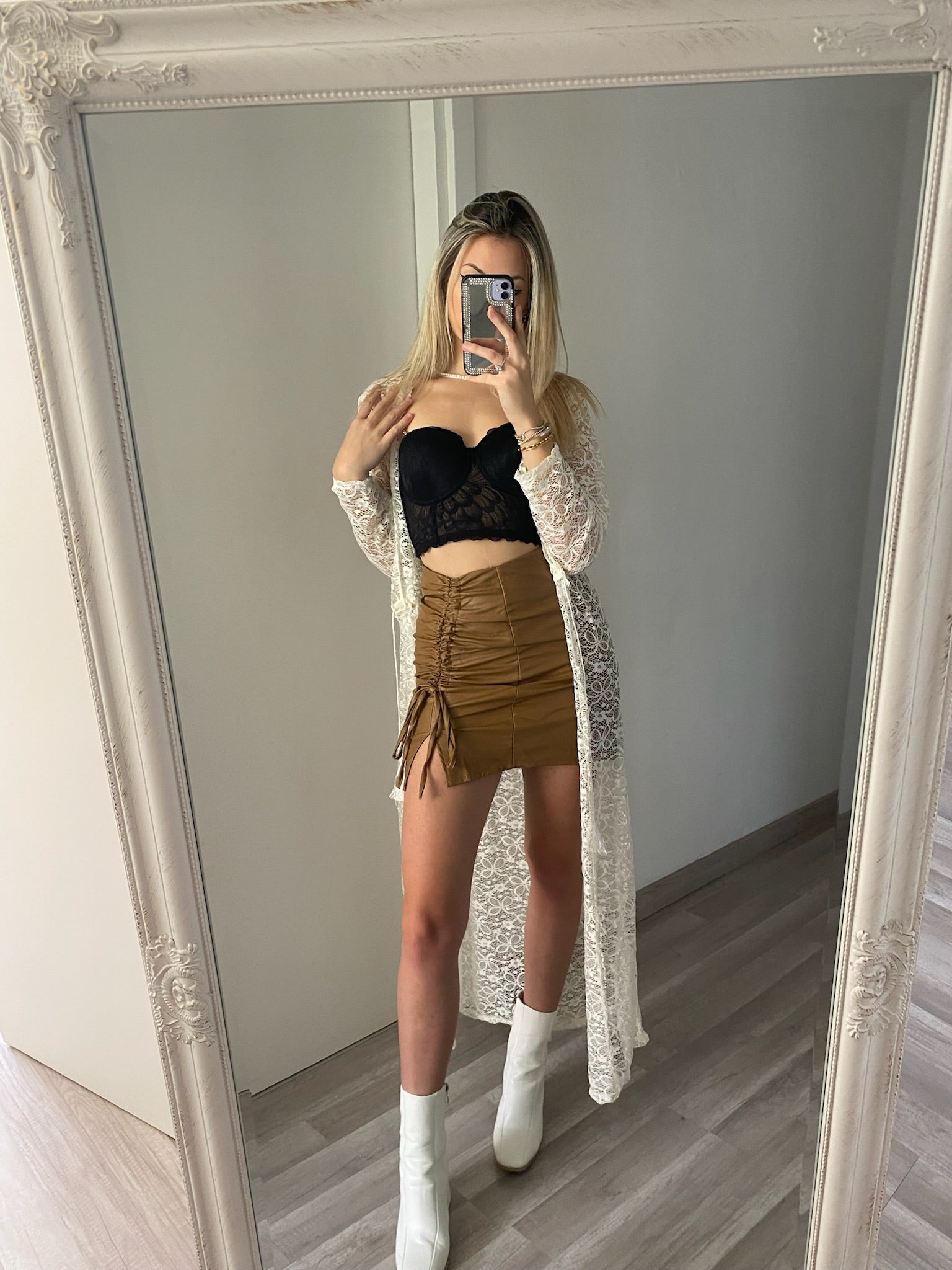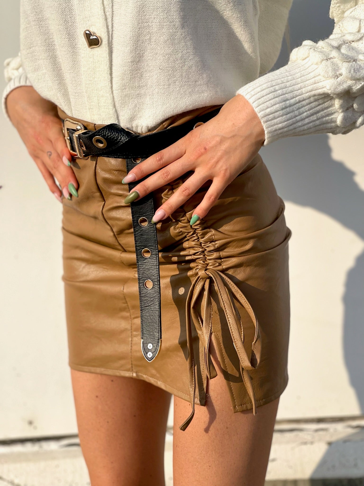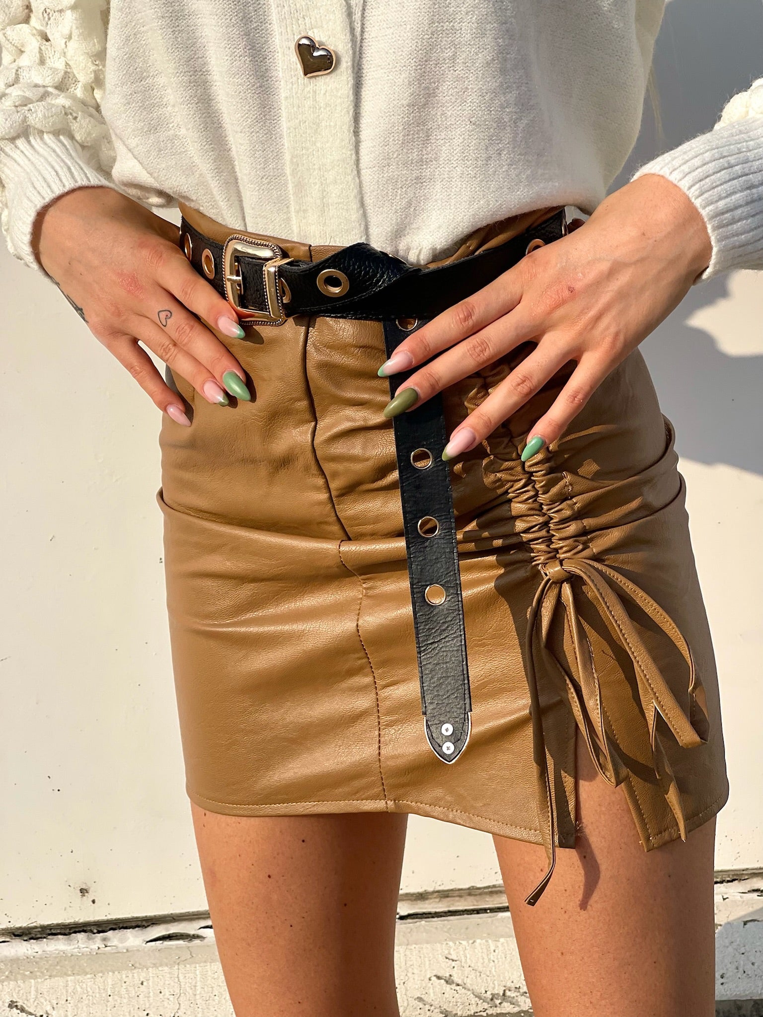 Kamelfarbener Kunstlederrock mit seitlicher Drapierung
