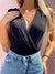 Black body in stretch fabric with gold buttons on the shoulder straps and adjustable chain.