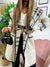 Beige check coat with belt and pockets, contrasting internal texture and hood.