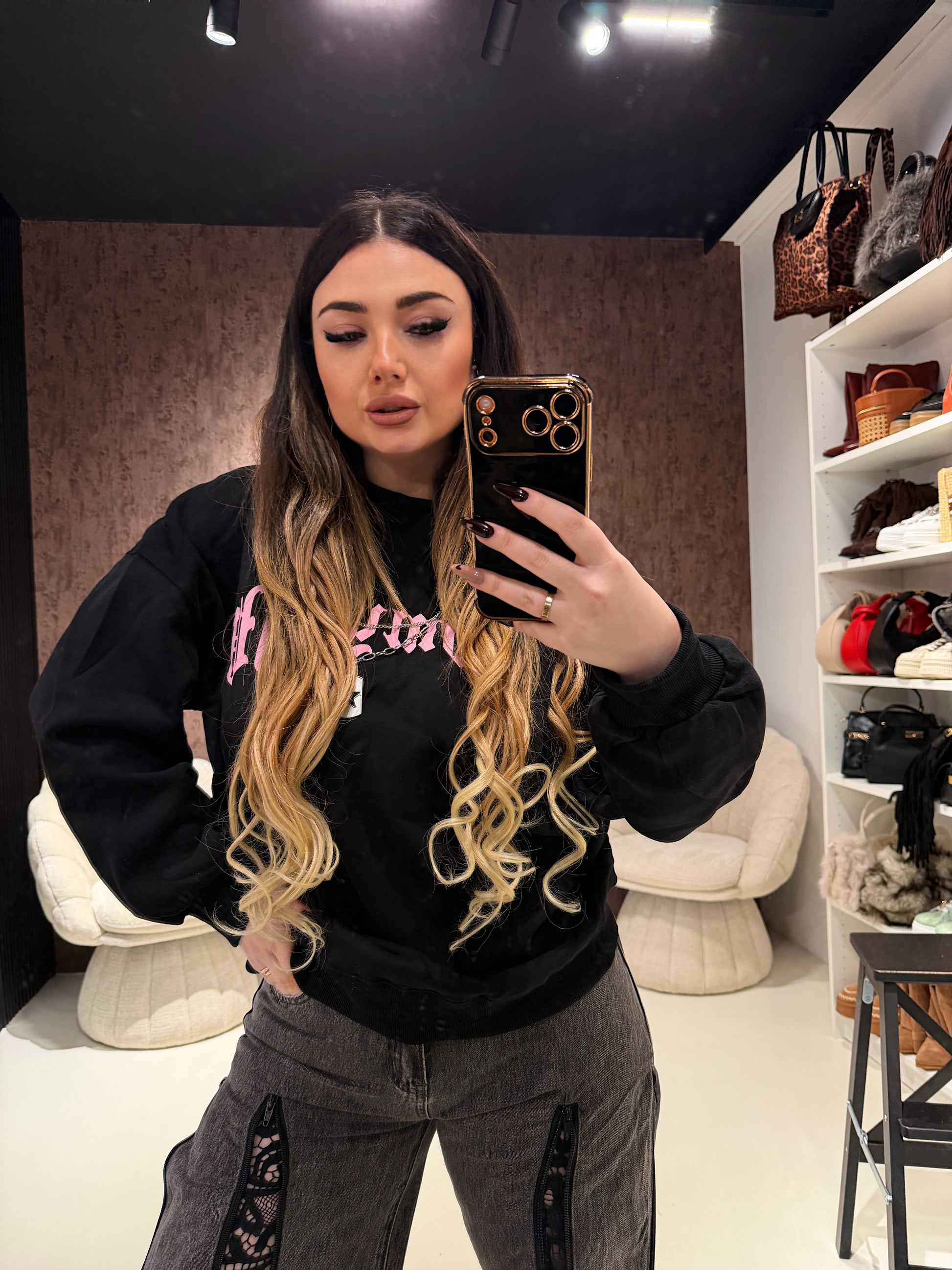 Felpa oversize dal mood street–glam, caratterizzata dalla stampa Komylaih frontale con catena gioiello applicata e dalla maxi stella grafica sul retro, per un effetto super wow.