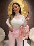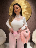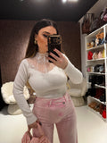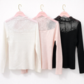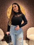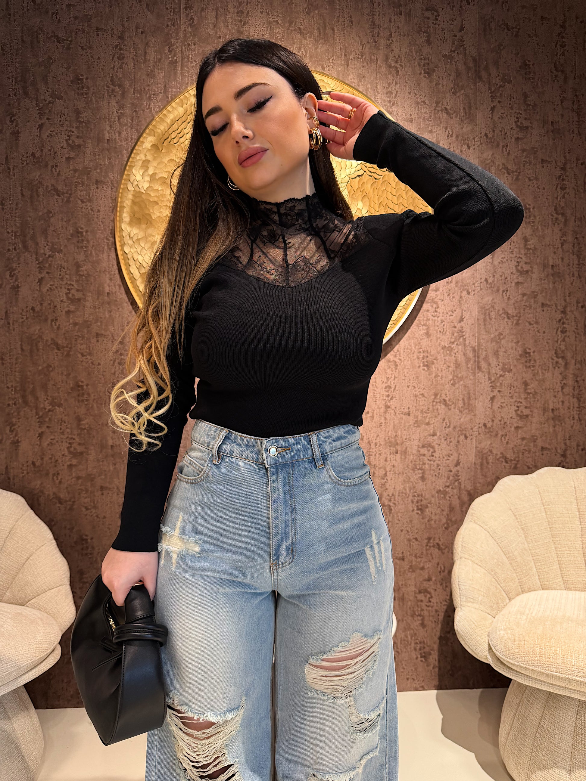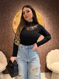 Maglia a manica lunga dal design elegante e femminile, impreziosita da un raffinato inserto in pizzo trasparente sulla parte superiore che valorizza spalle e décolleté con delicatezza. Il tessuto è morbido ed elasticizzato, avvolge la silhouette senza costringere, rendendola perfetta sia per l’uso quotidiano che per occasioni più ricercate.