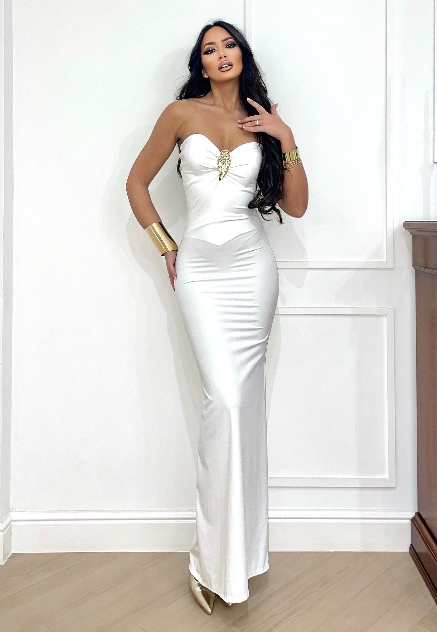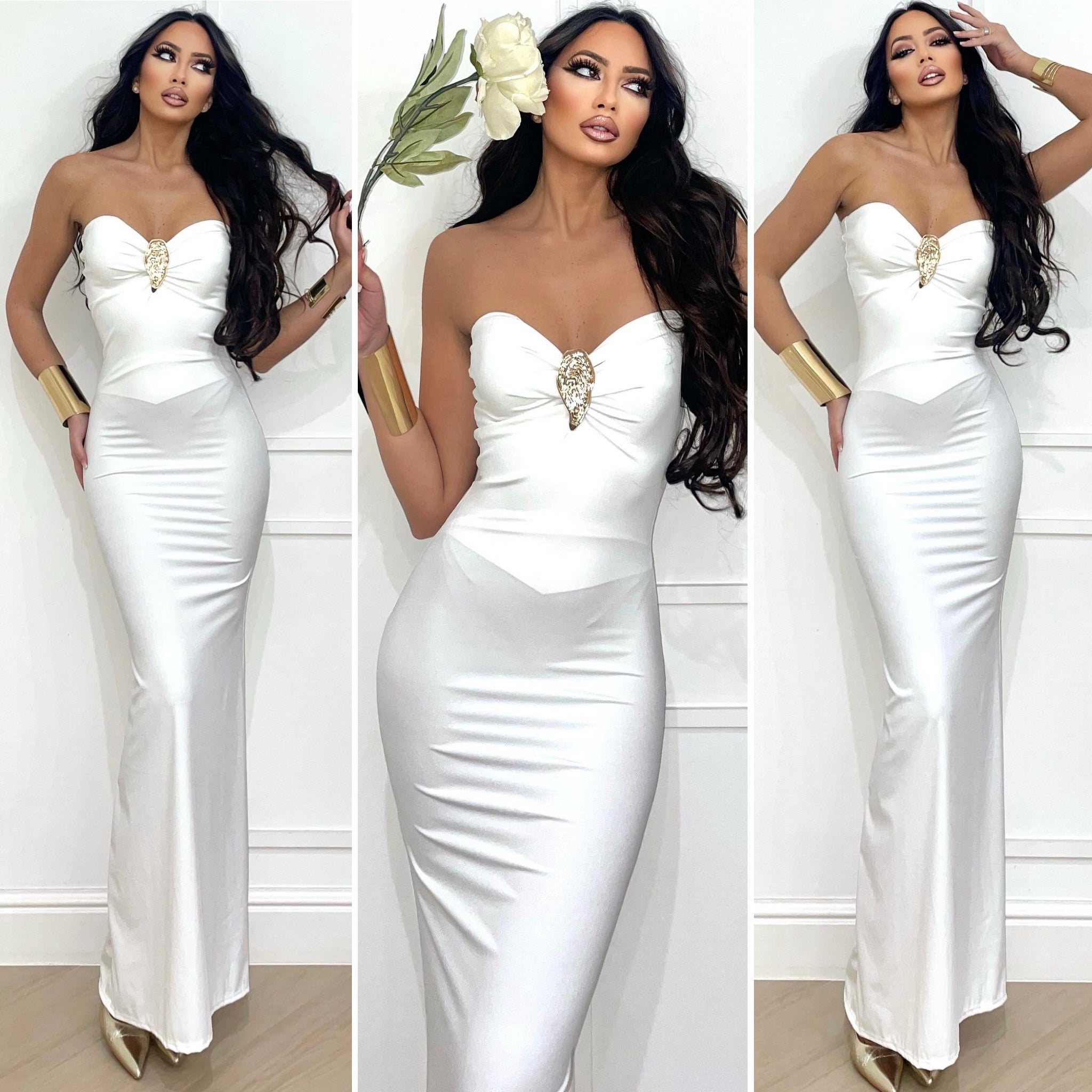 Vestido largo con forro ajustado de licra elástica. Con copas y joya dorada.