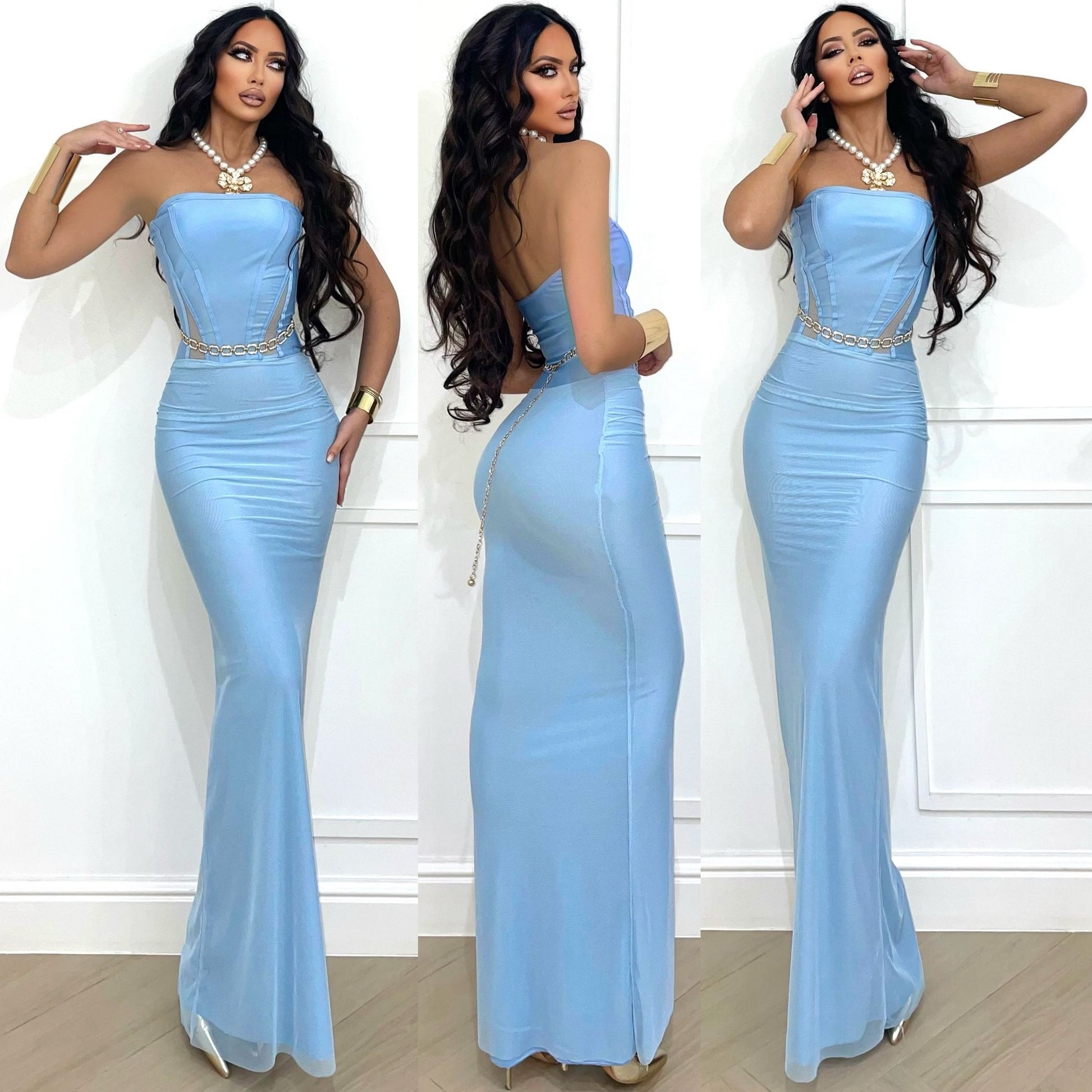 Vestido bandeau de efecto envolvente con detalle de ballenas delanteras. Falda de tul. Tejido ajustado y elástico.