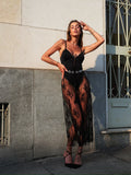 Vestido blanco con cuerpo de tirantes ajustables y maxi falda en encaje bordado tono sobre tono.