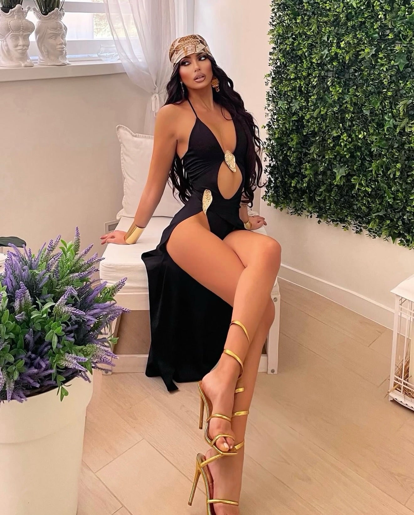 Bikini de dos piezas con joya en la parte delantera, cuerpo ajustable, pierna alta y falda elástica.