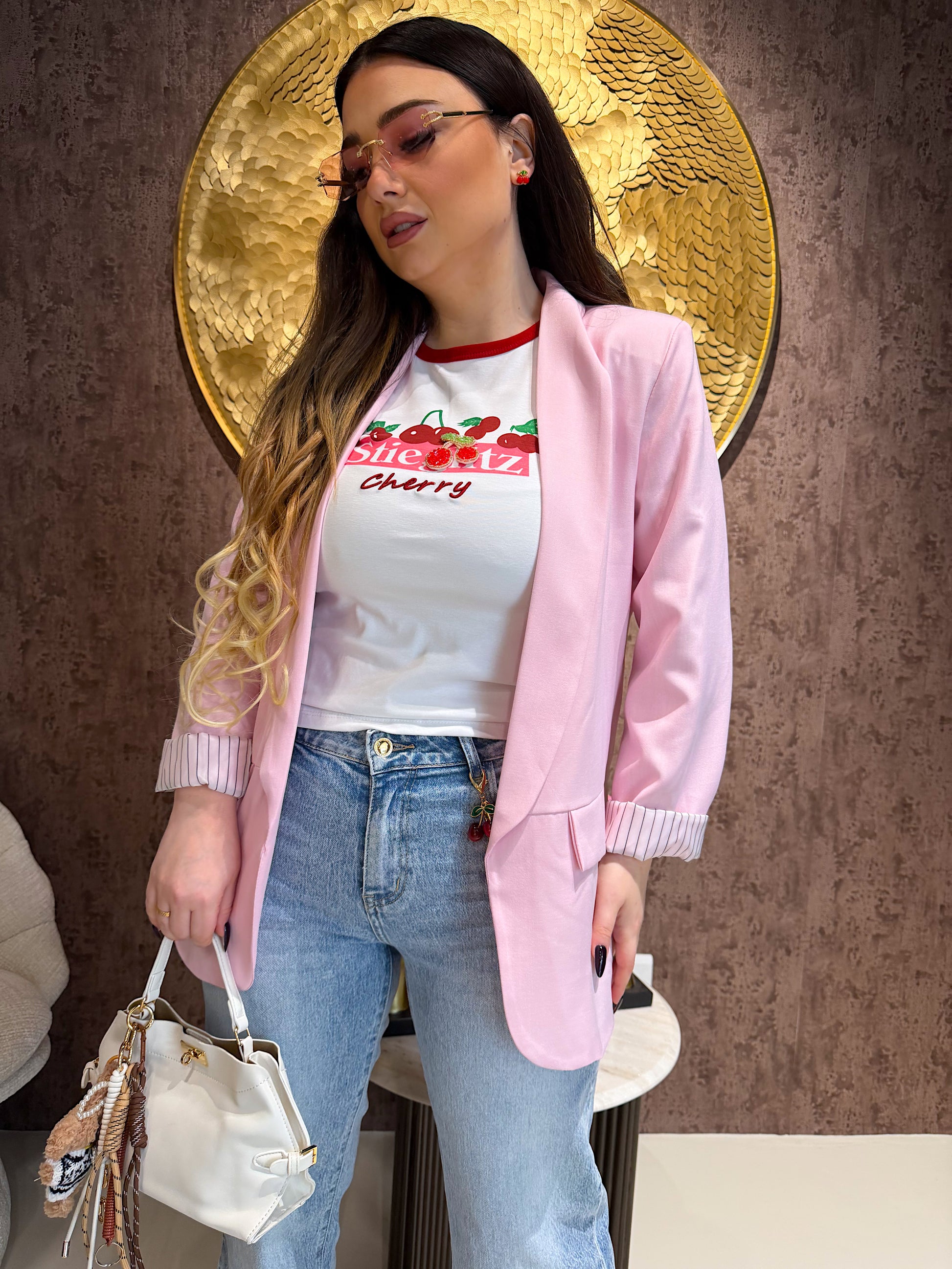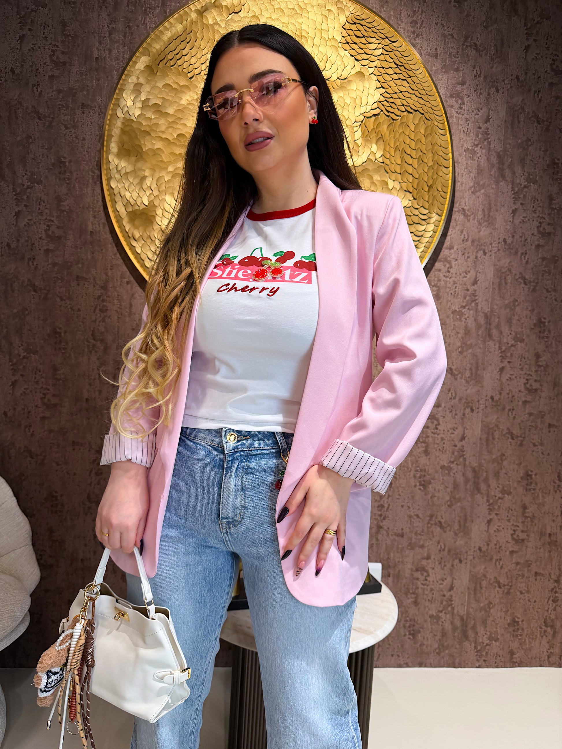 Il design minimal con maniche risvoltate e interno rigato dona un tocco raffinato e contemporaneo. Facile da abbinare con jeans, pantaloni eleganti o abiti, è il blazer must-have di stagione per un outfit sempre impeccabile.