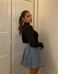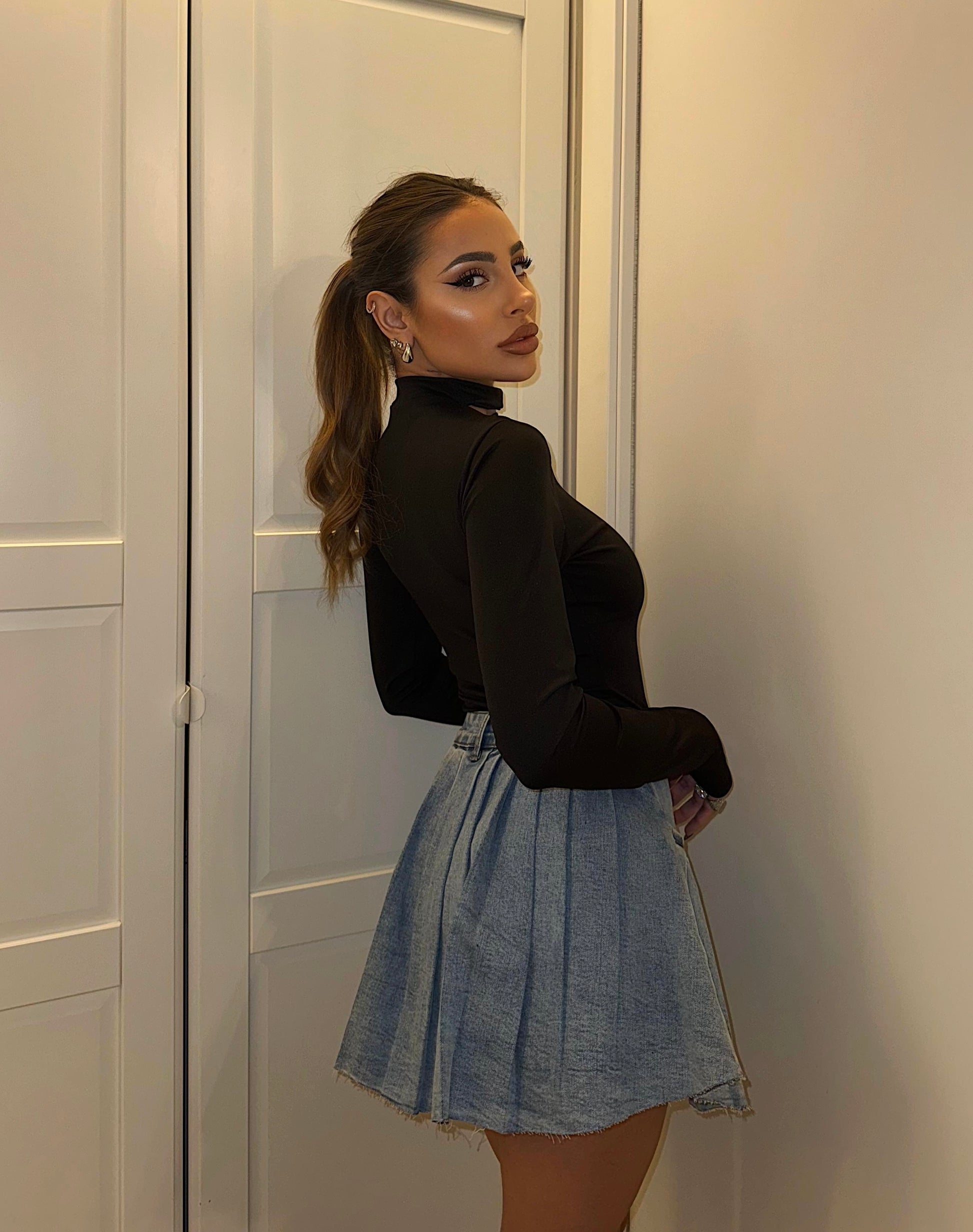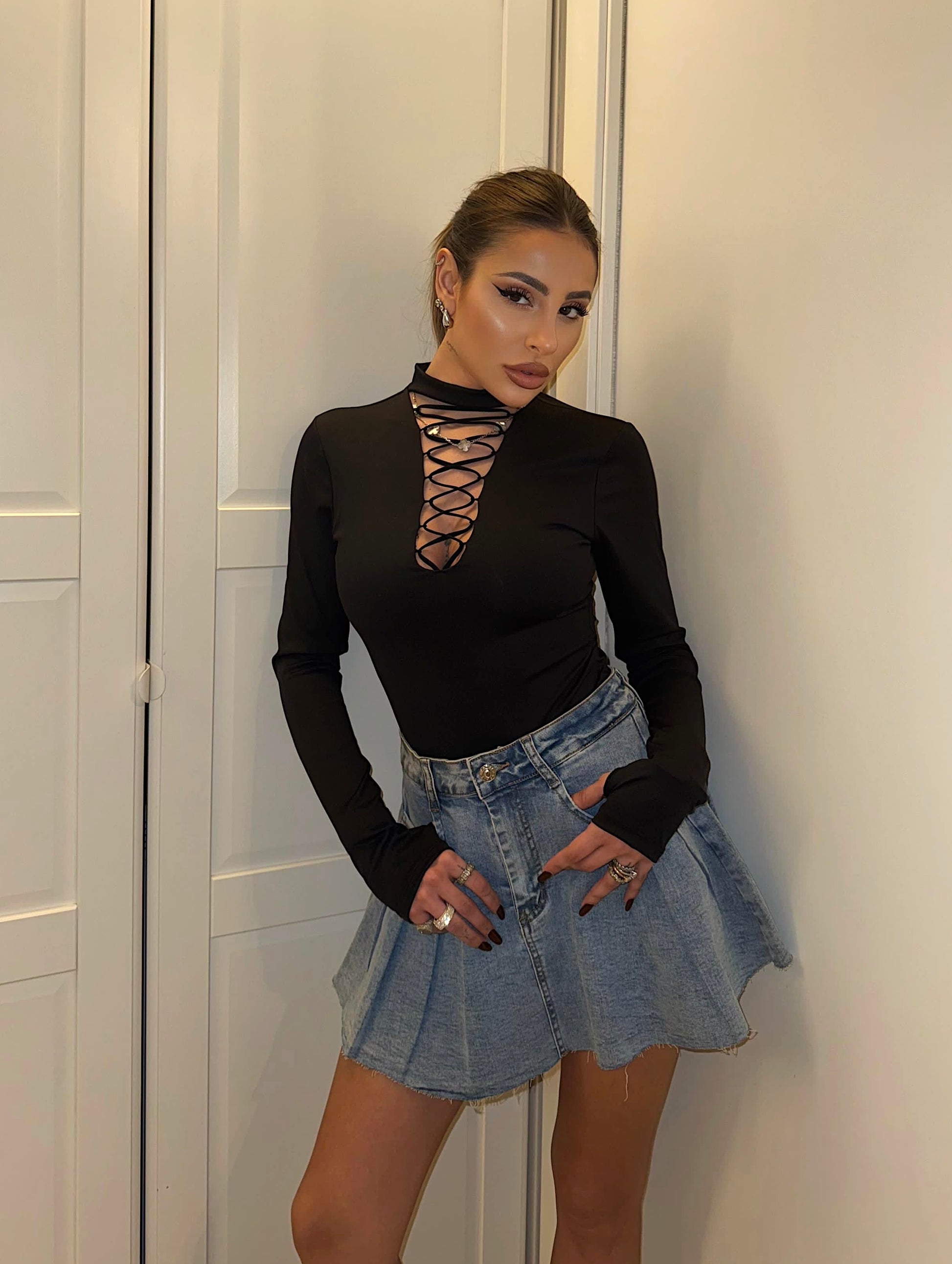Body negro en lycra ajustada y elástica sin copas con cordones en la parte delantera.