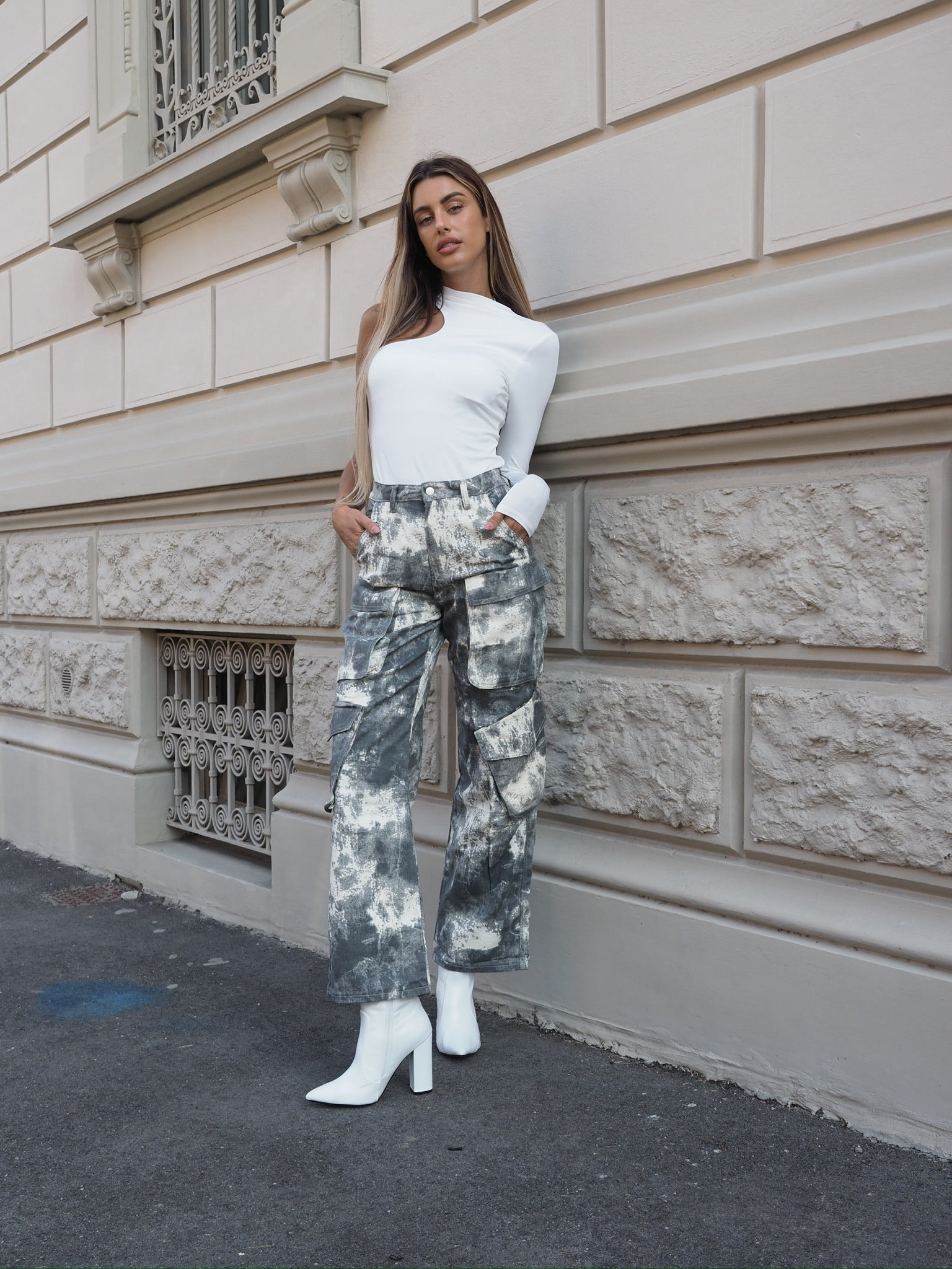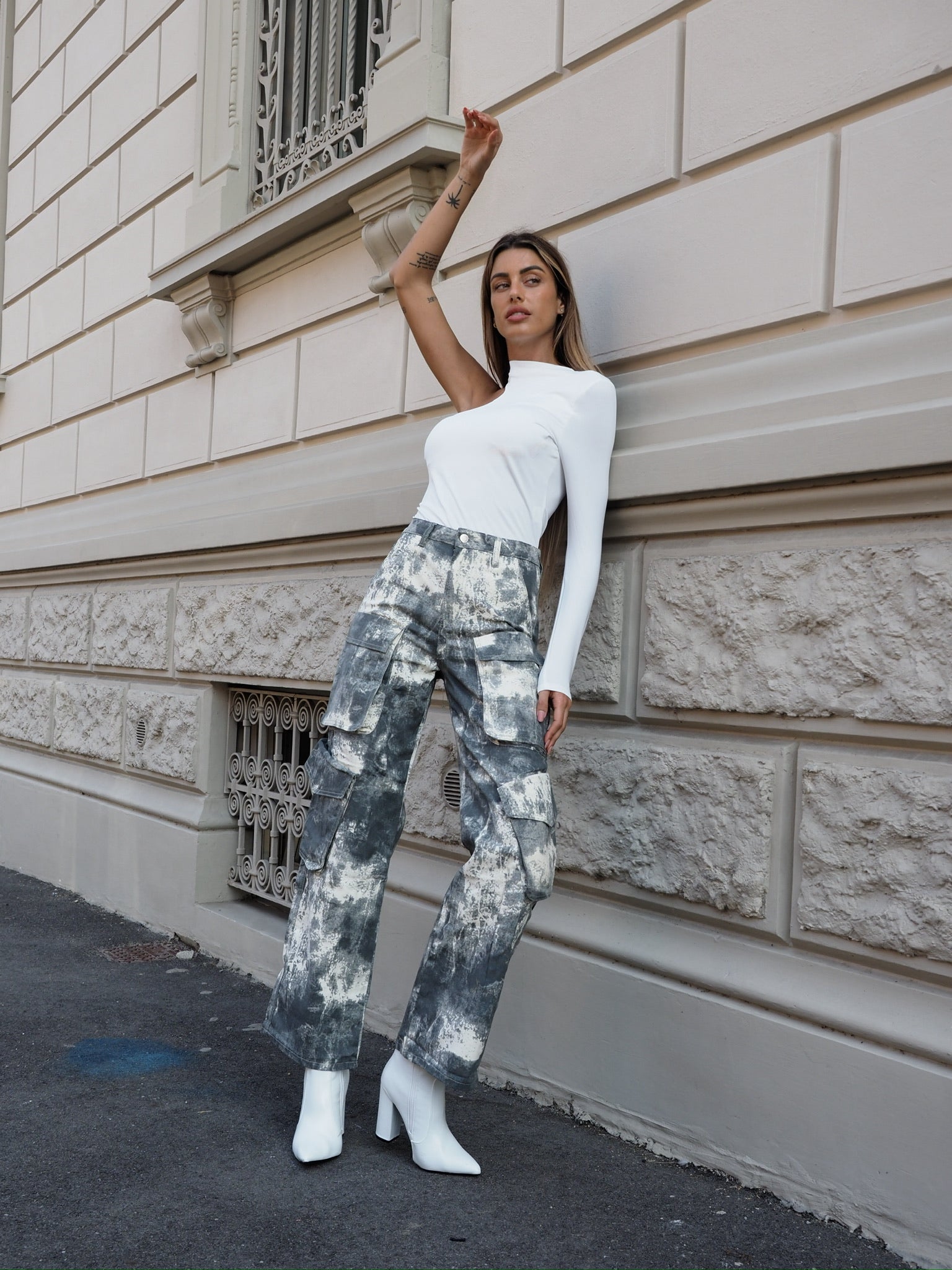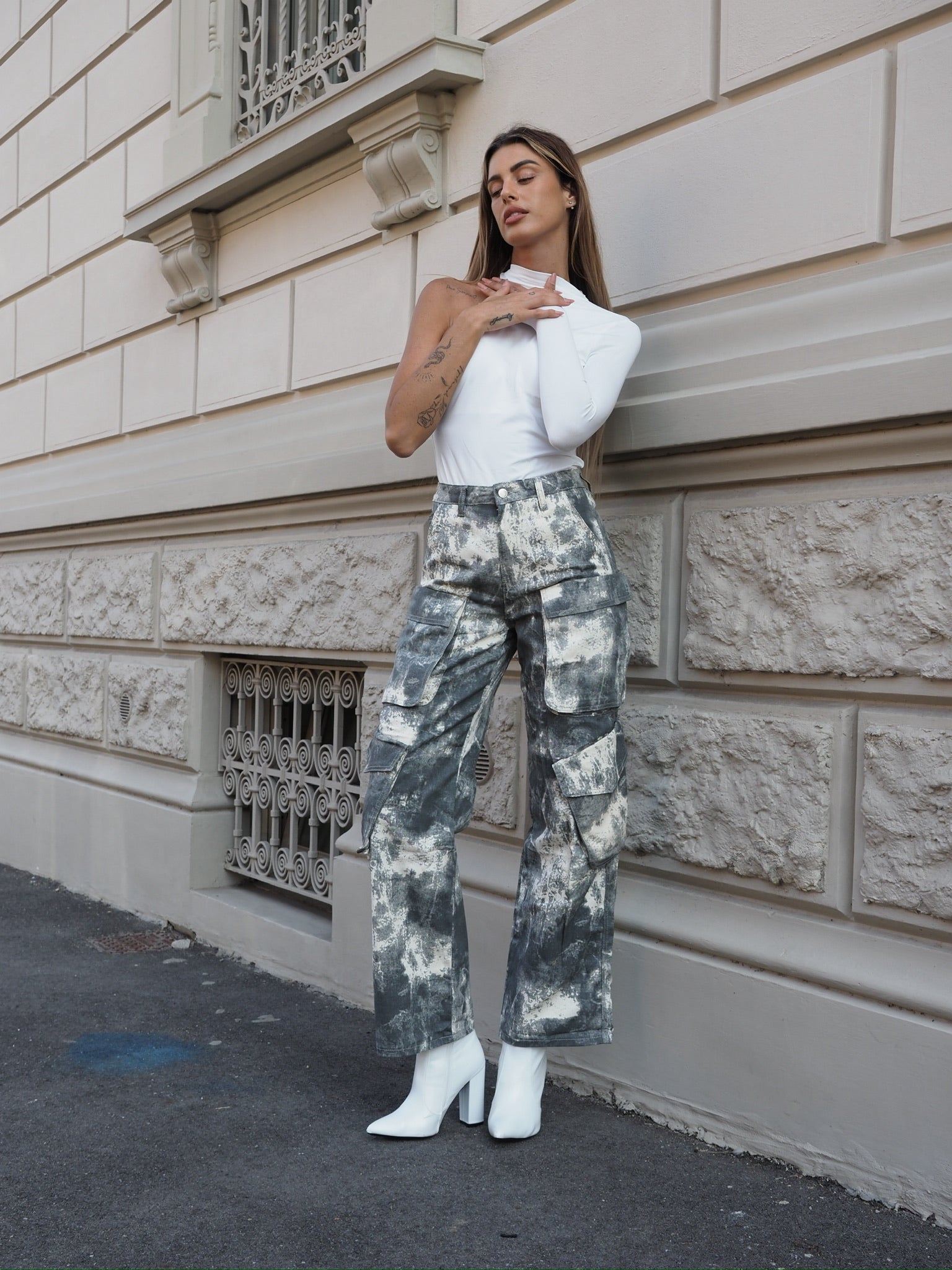 Cargo en tejido no elástico. Maxi bolsillos y pernera ancha.