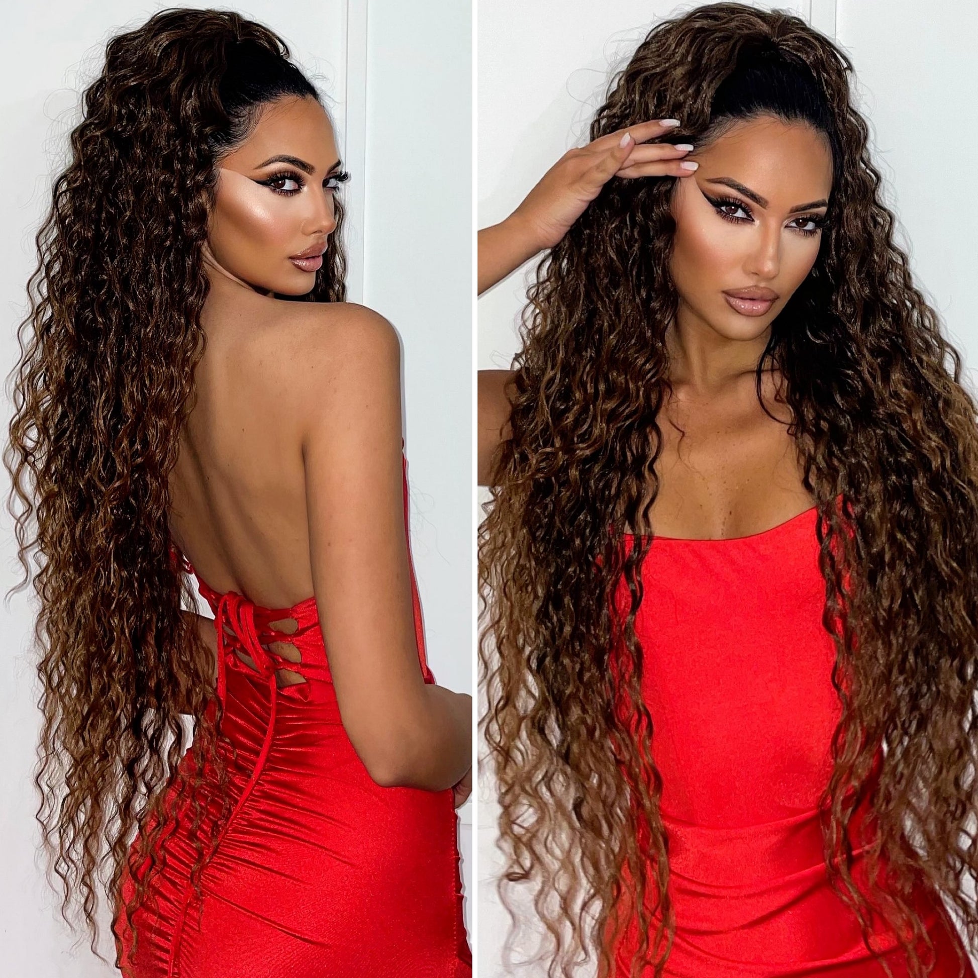 #T1b/30 Cola de caballo rizada con cordón marrón degradado 90 cm