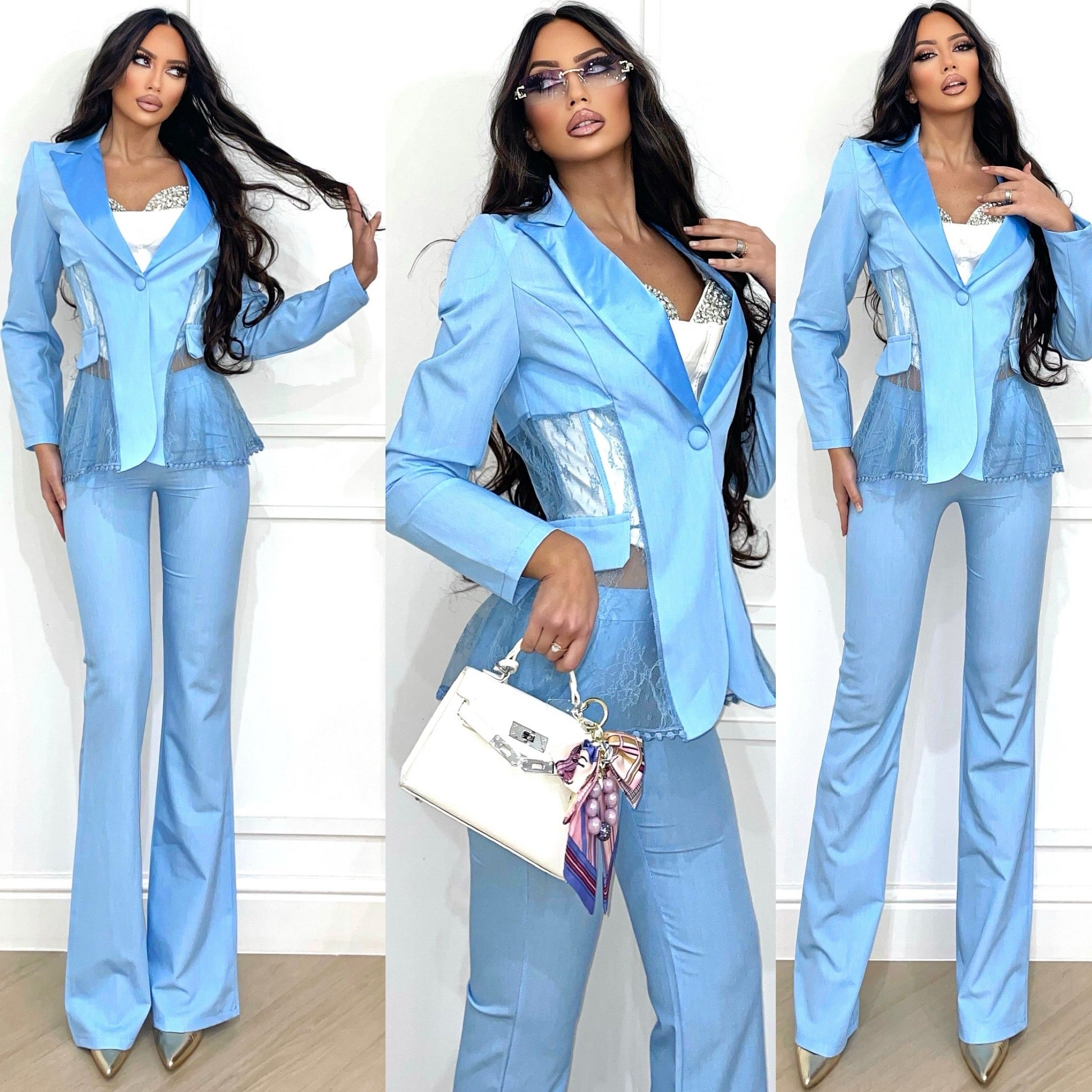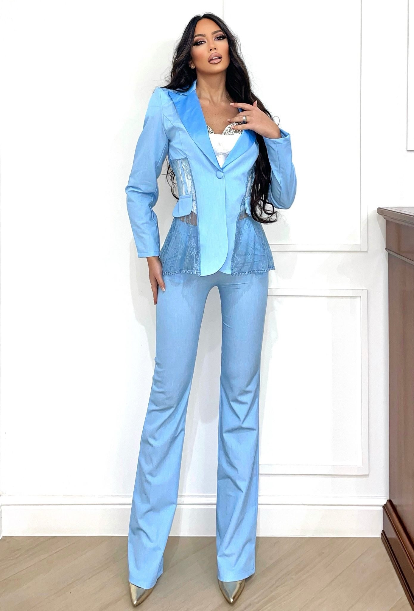 Conjunto completo compuesto por chaqueta efecto bustier con detalles de encaje, cierre de botones y cuello de raso.