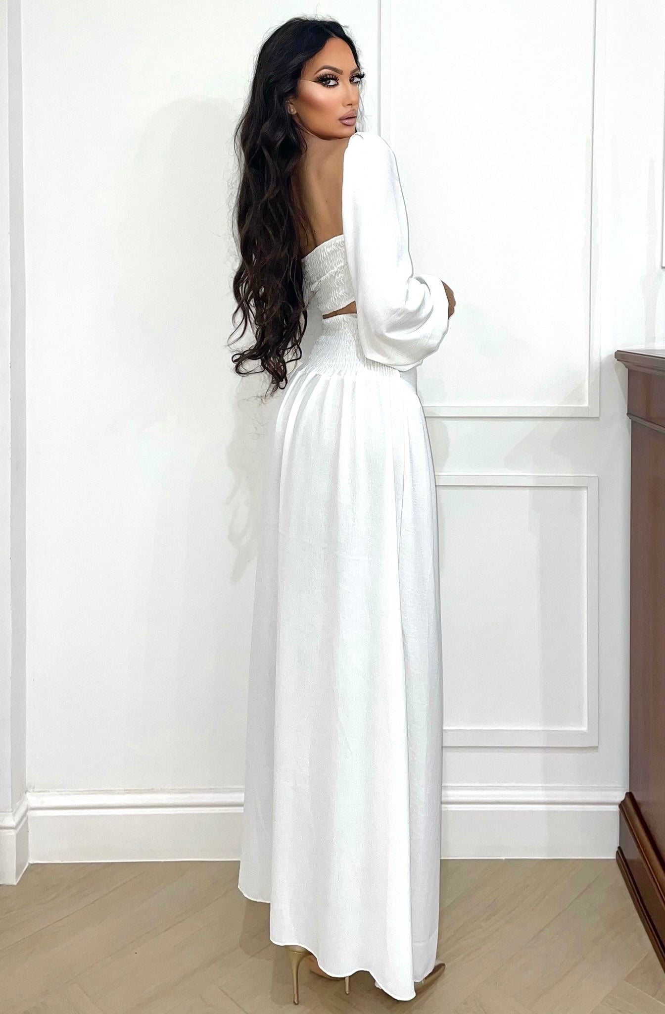 Conjunto de dos piezas compuesto por top con copas y mangas con elástico en la espalda y joya en la parte delantera. Falda con elástico y joya con maxi abertura