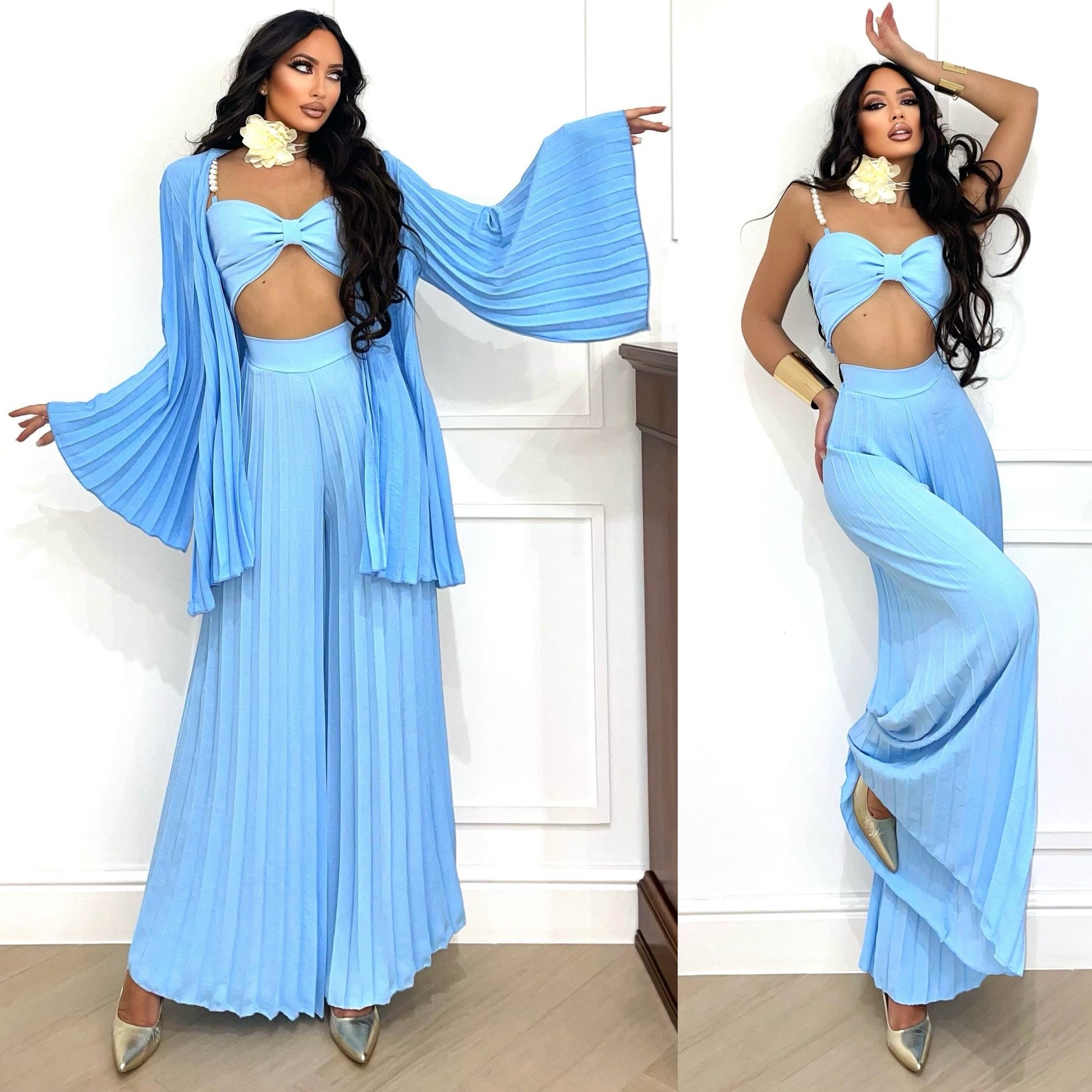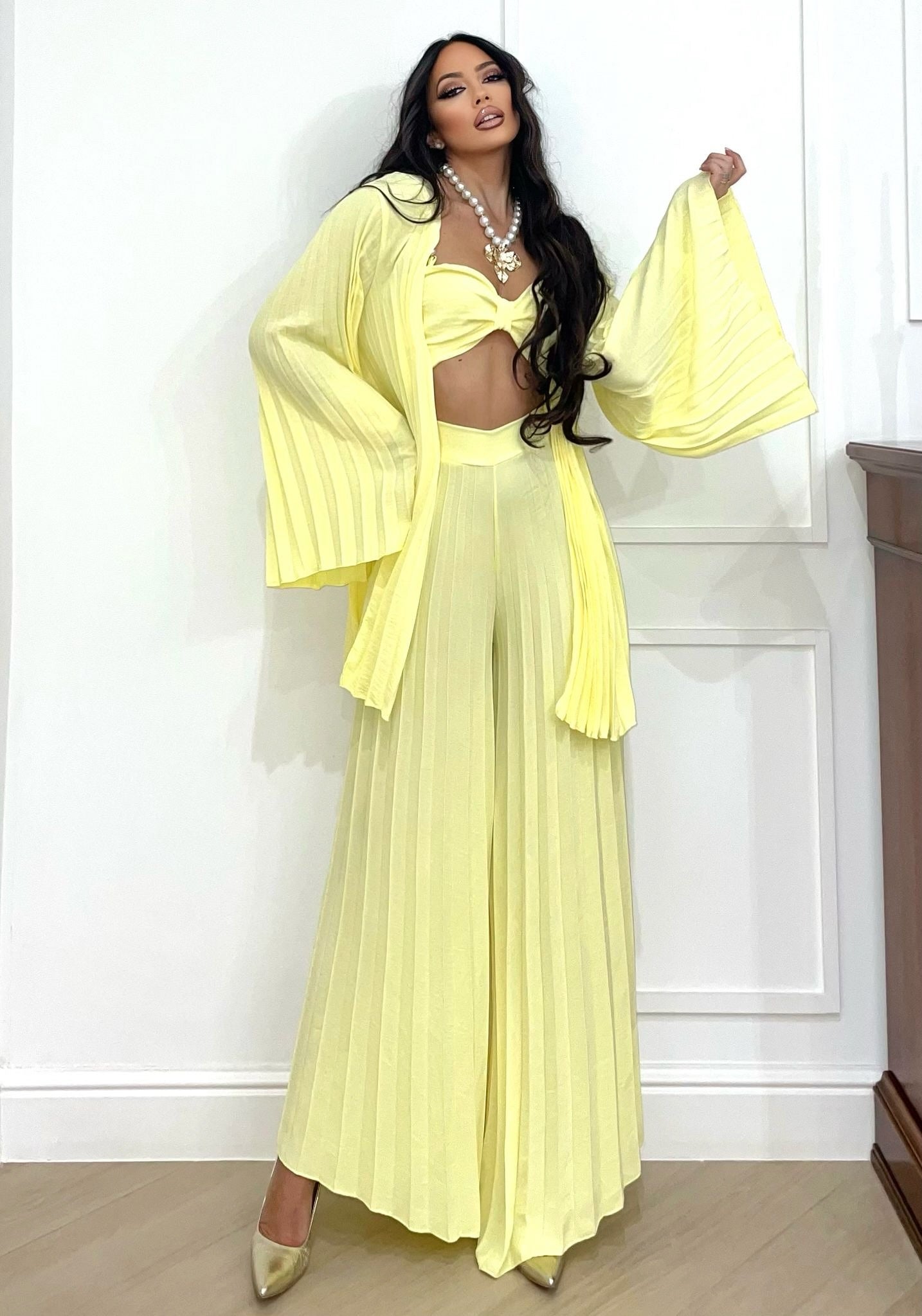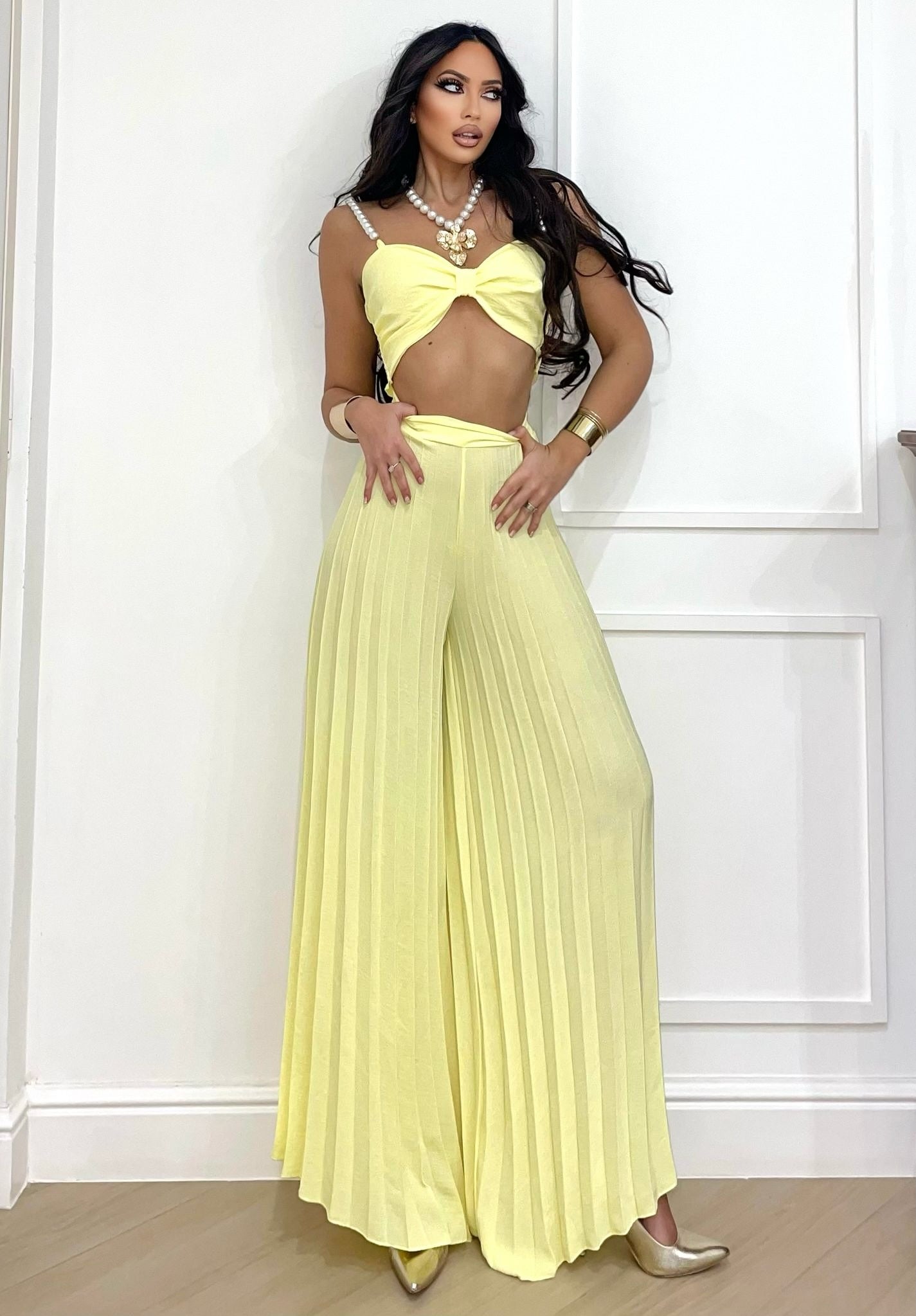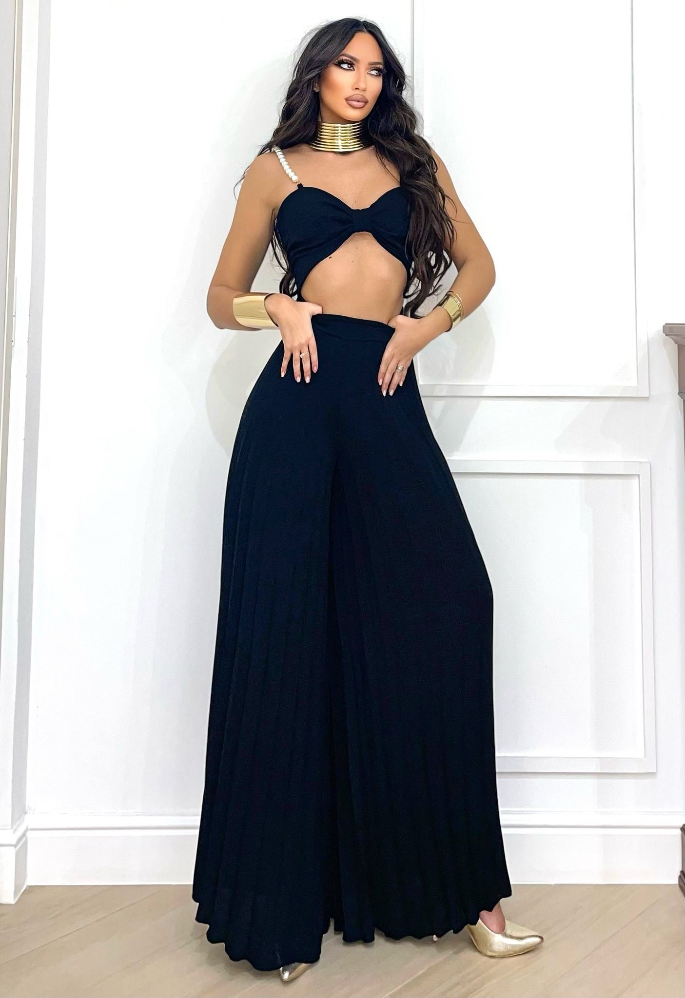 - pantalones acampanados con pliegues elásticos