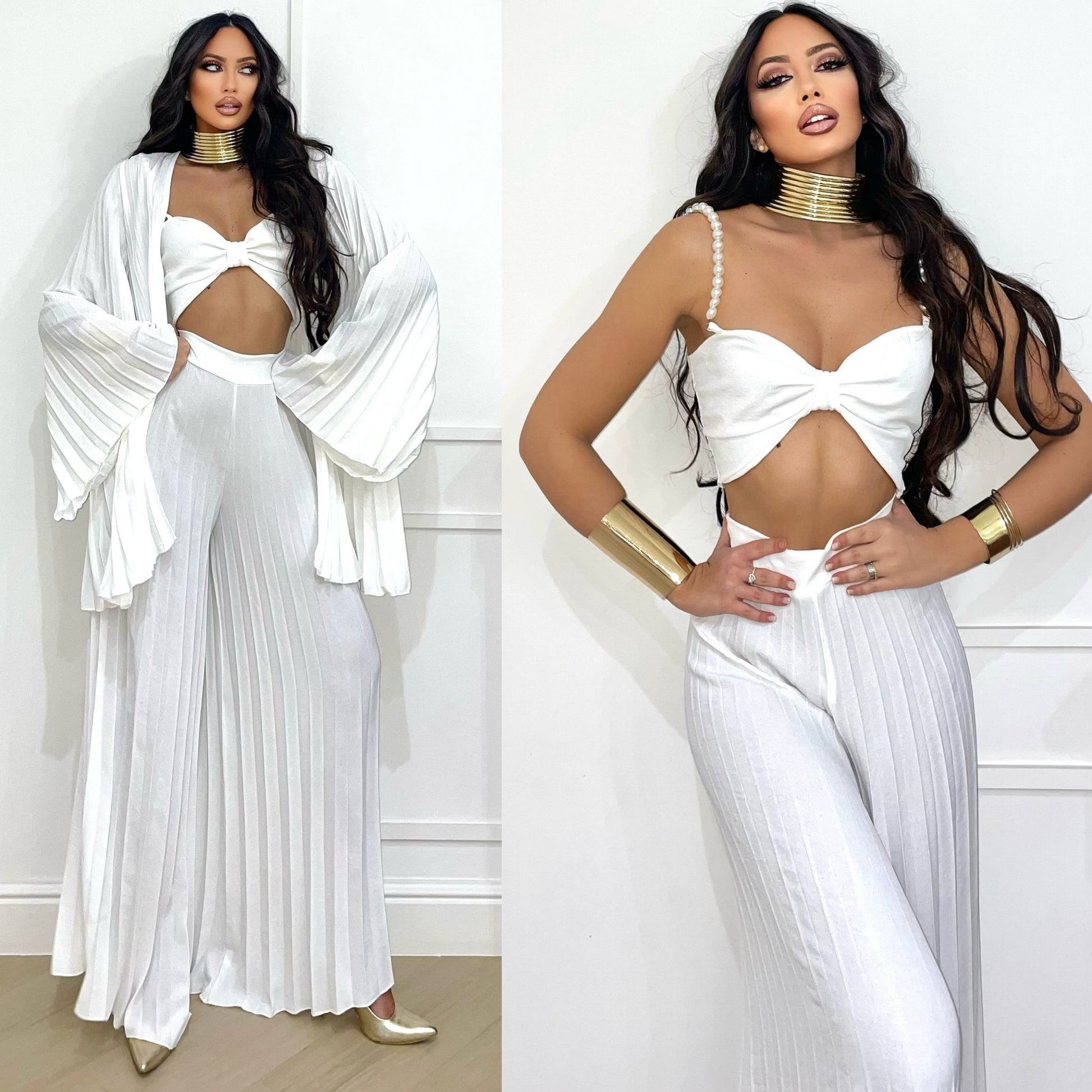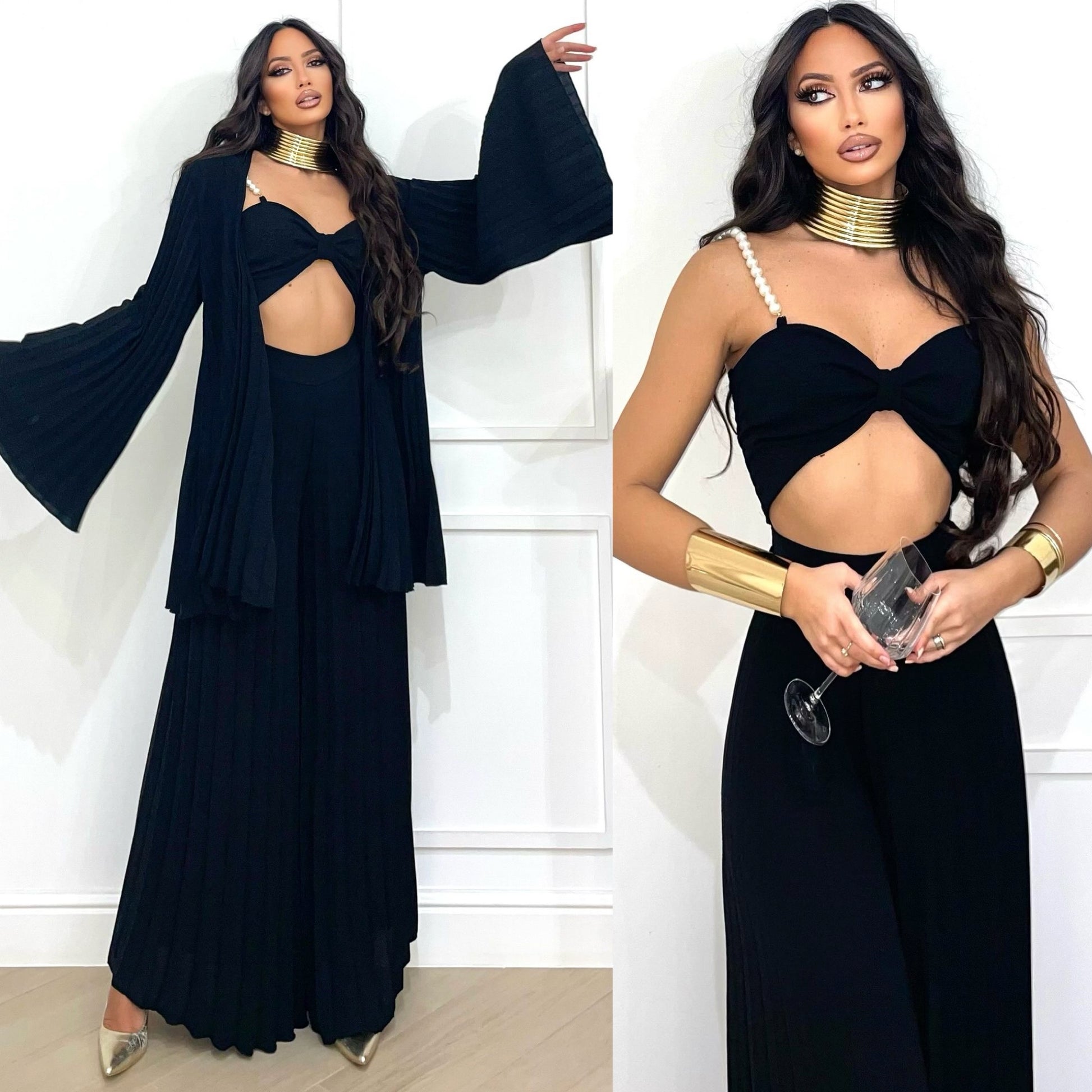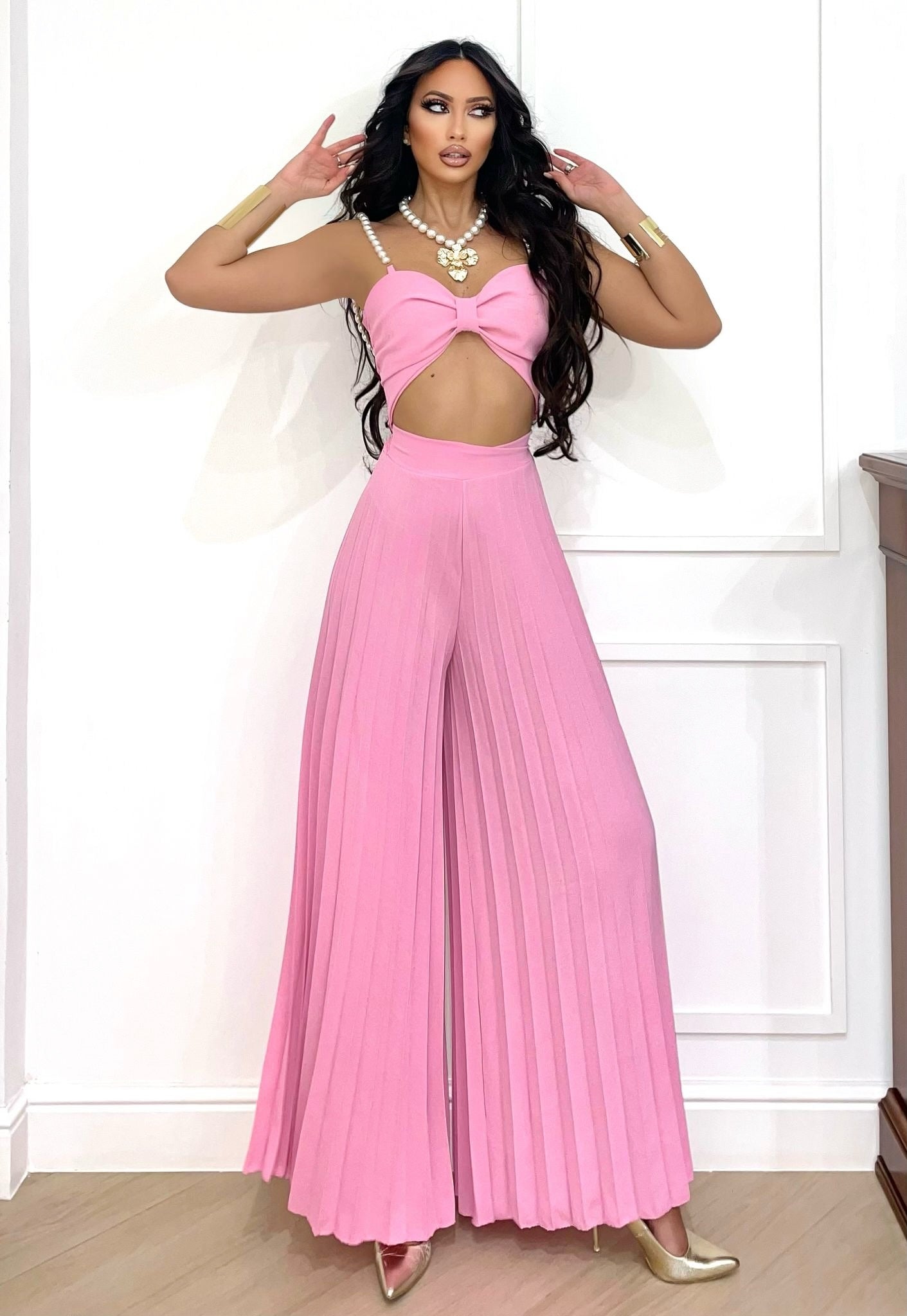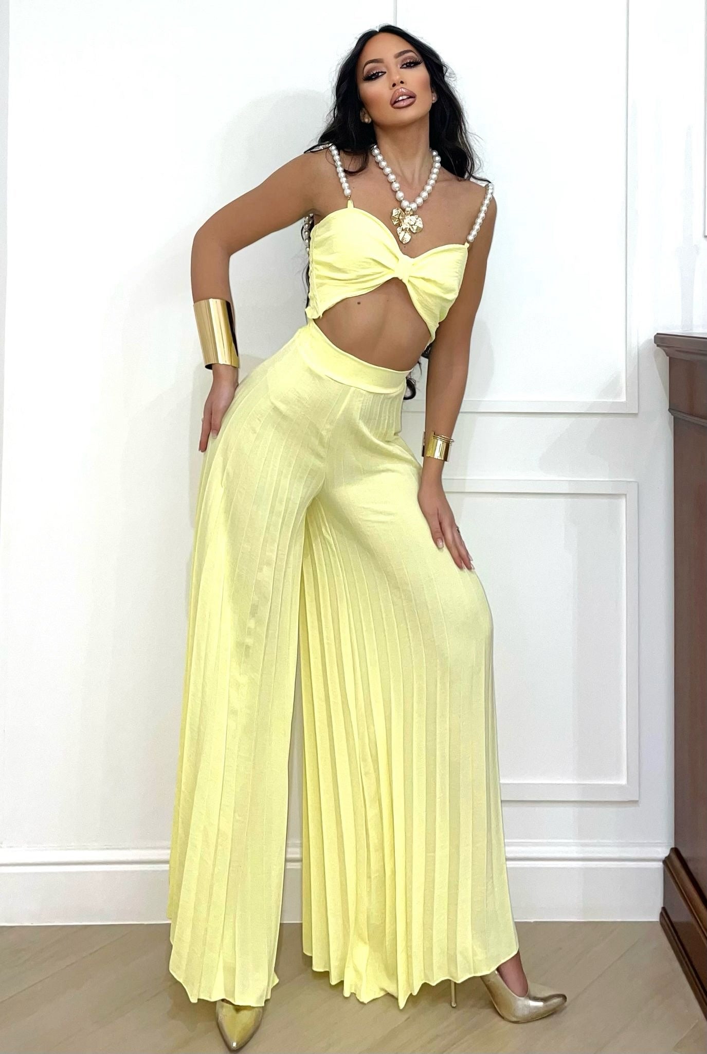 - pantalones acampanados con pliegues elásticos