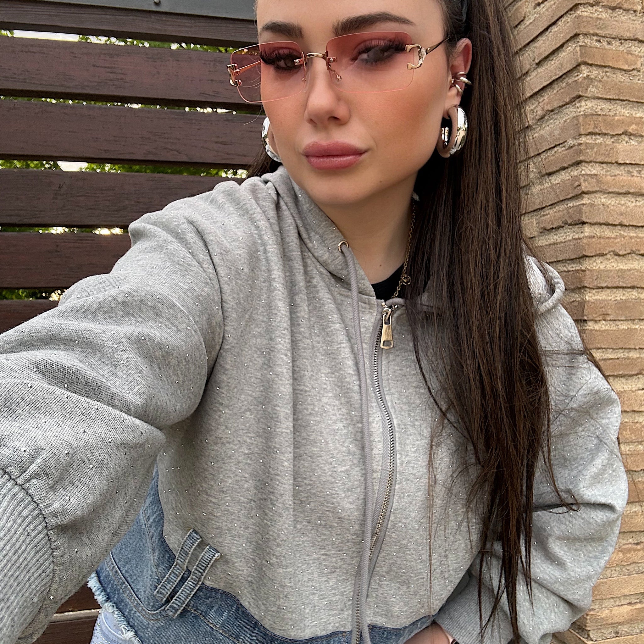Sudadera ligera cepillada con corte oversize, pedrería y detalle en denim.