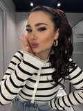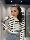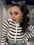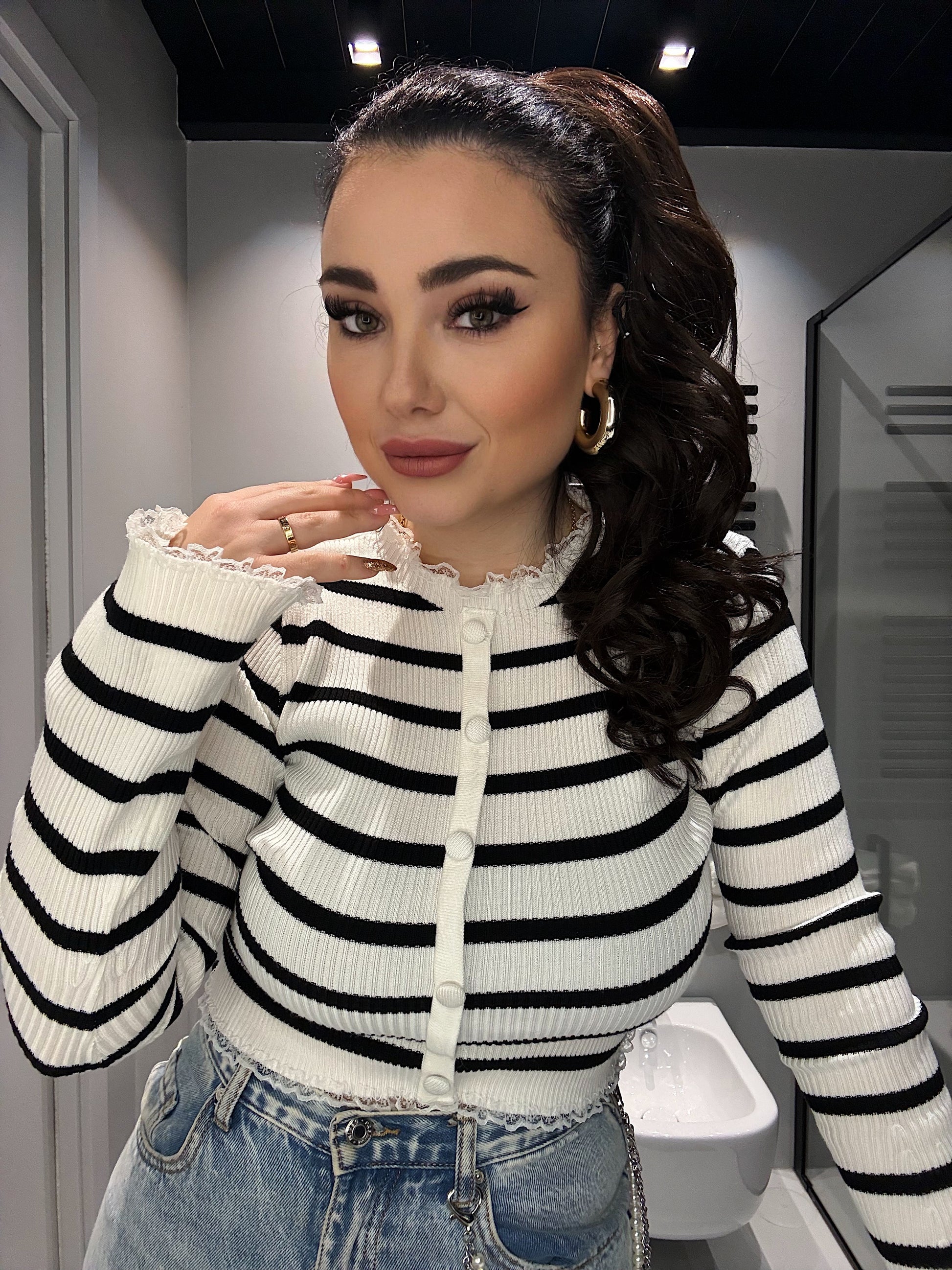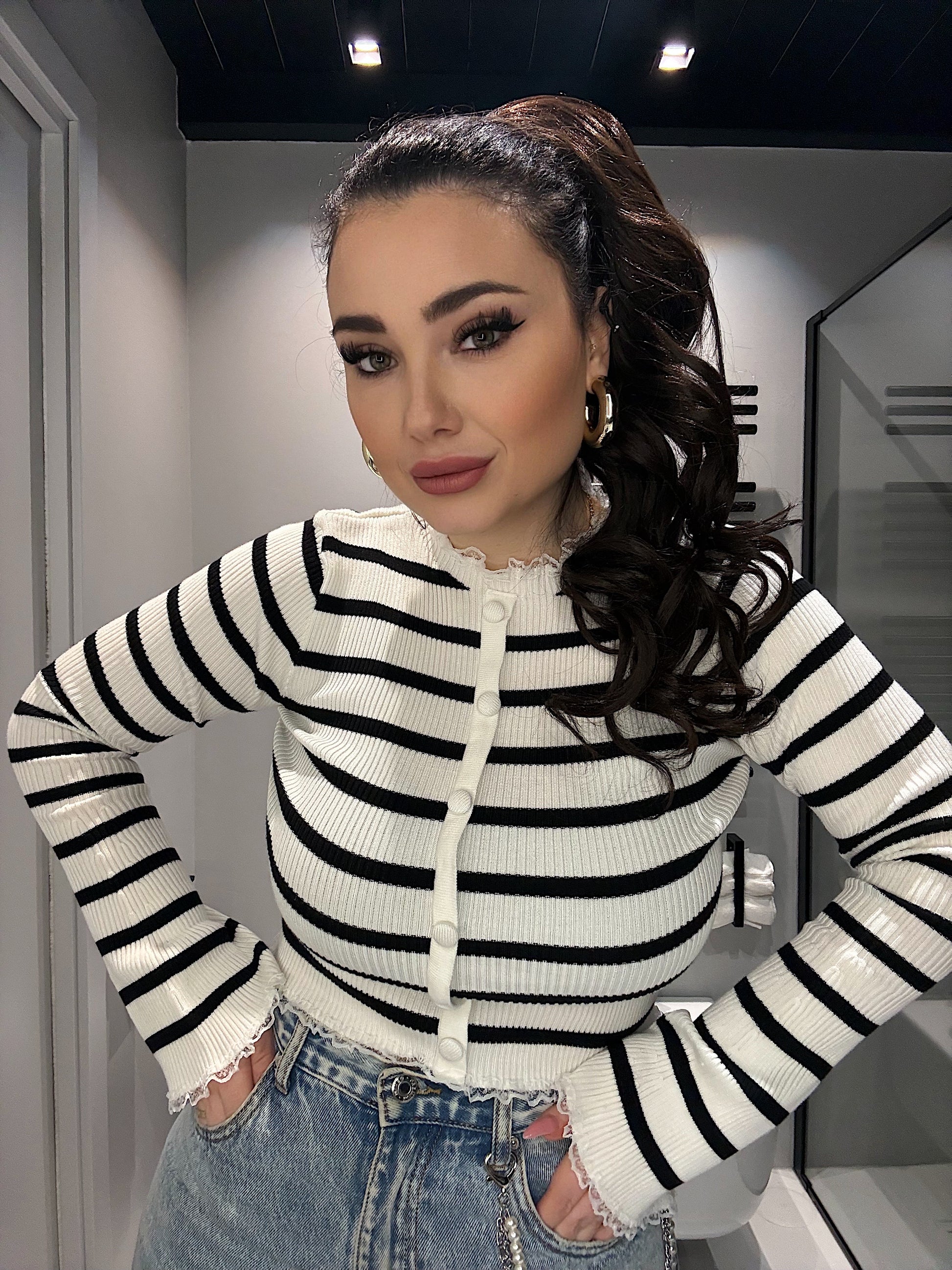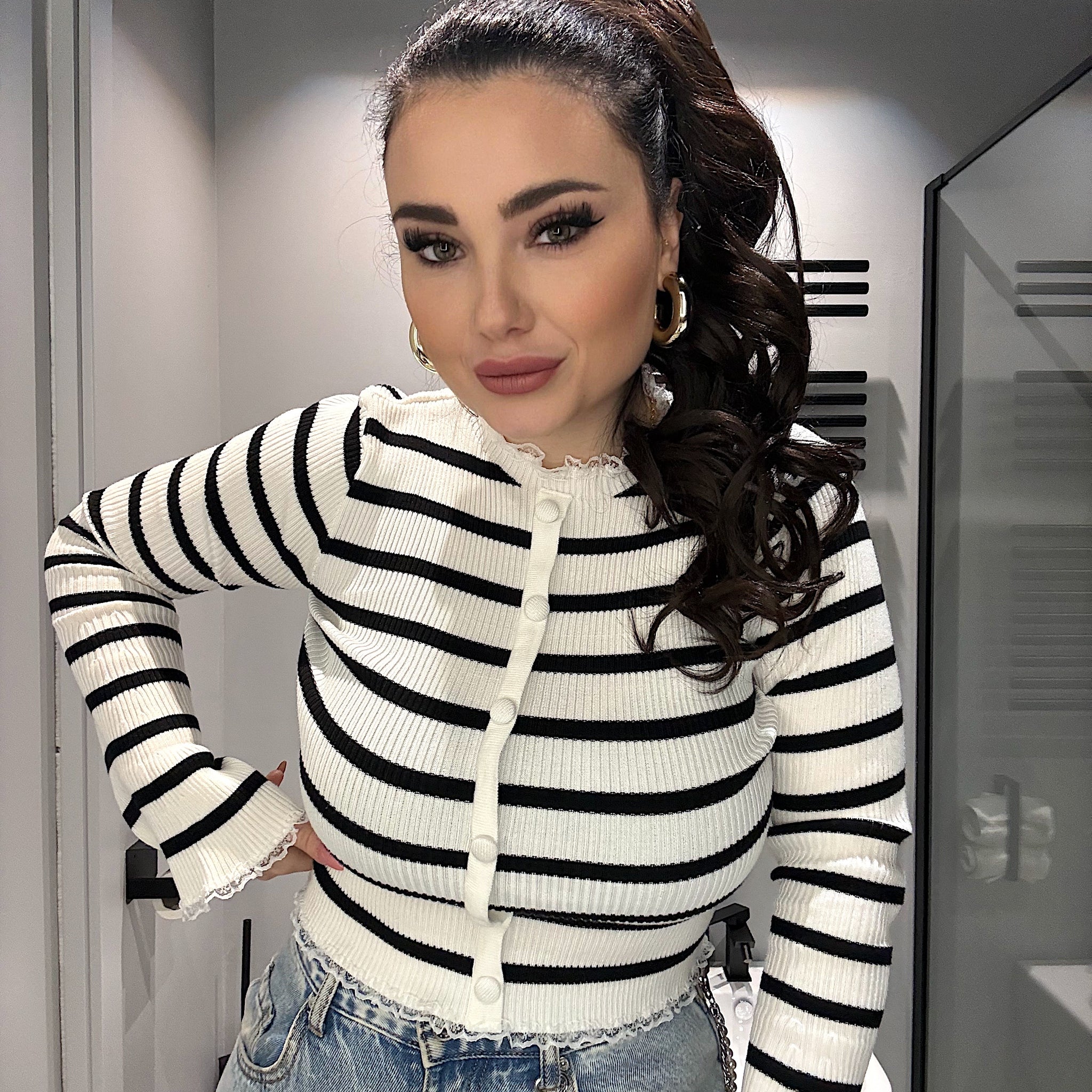 Jersey de rayas en tejido muy elástico con botones en la parte delantera y encaje en cuello, mangas y bajo.