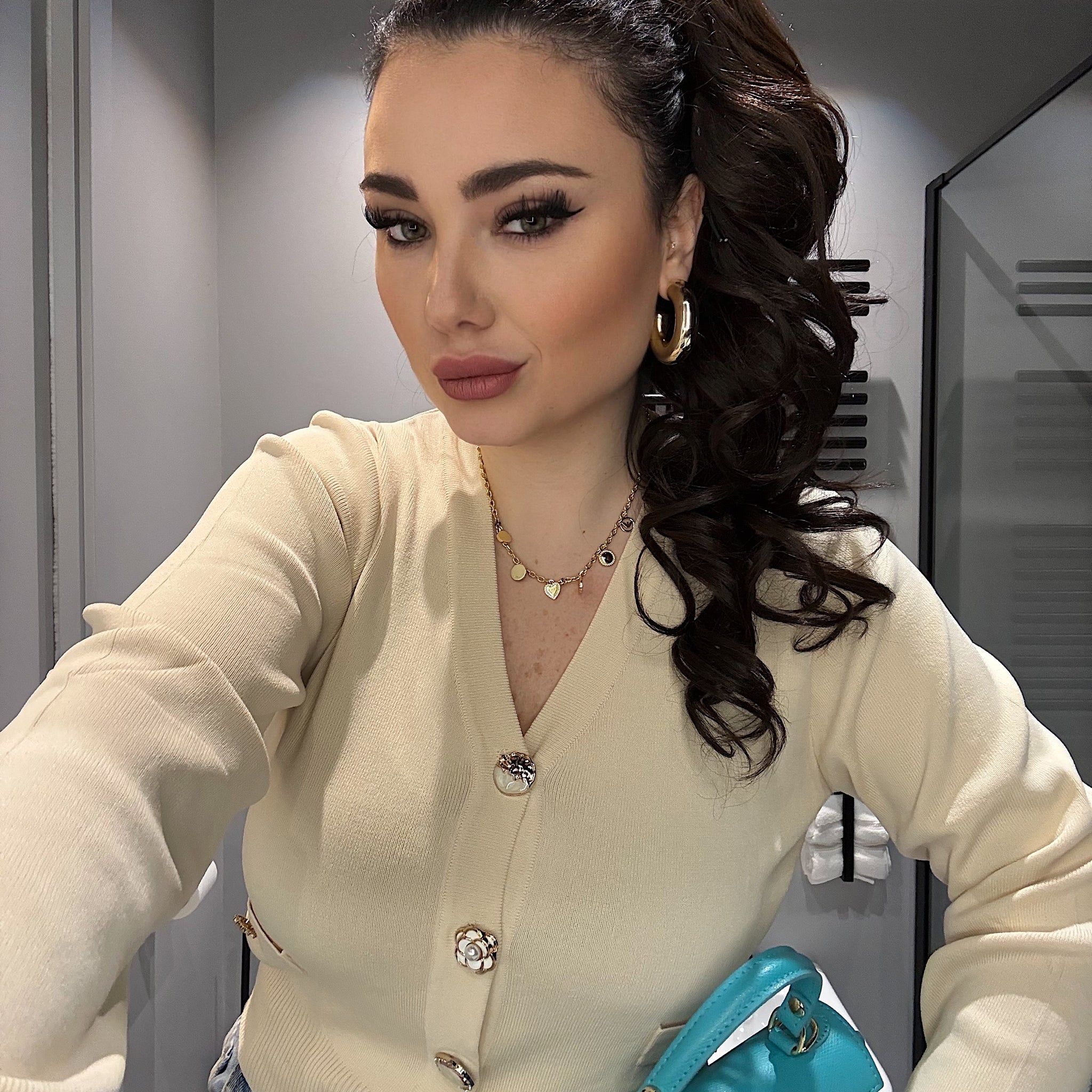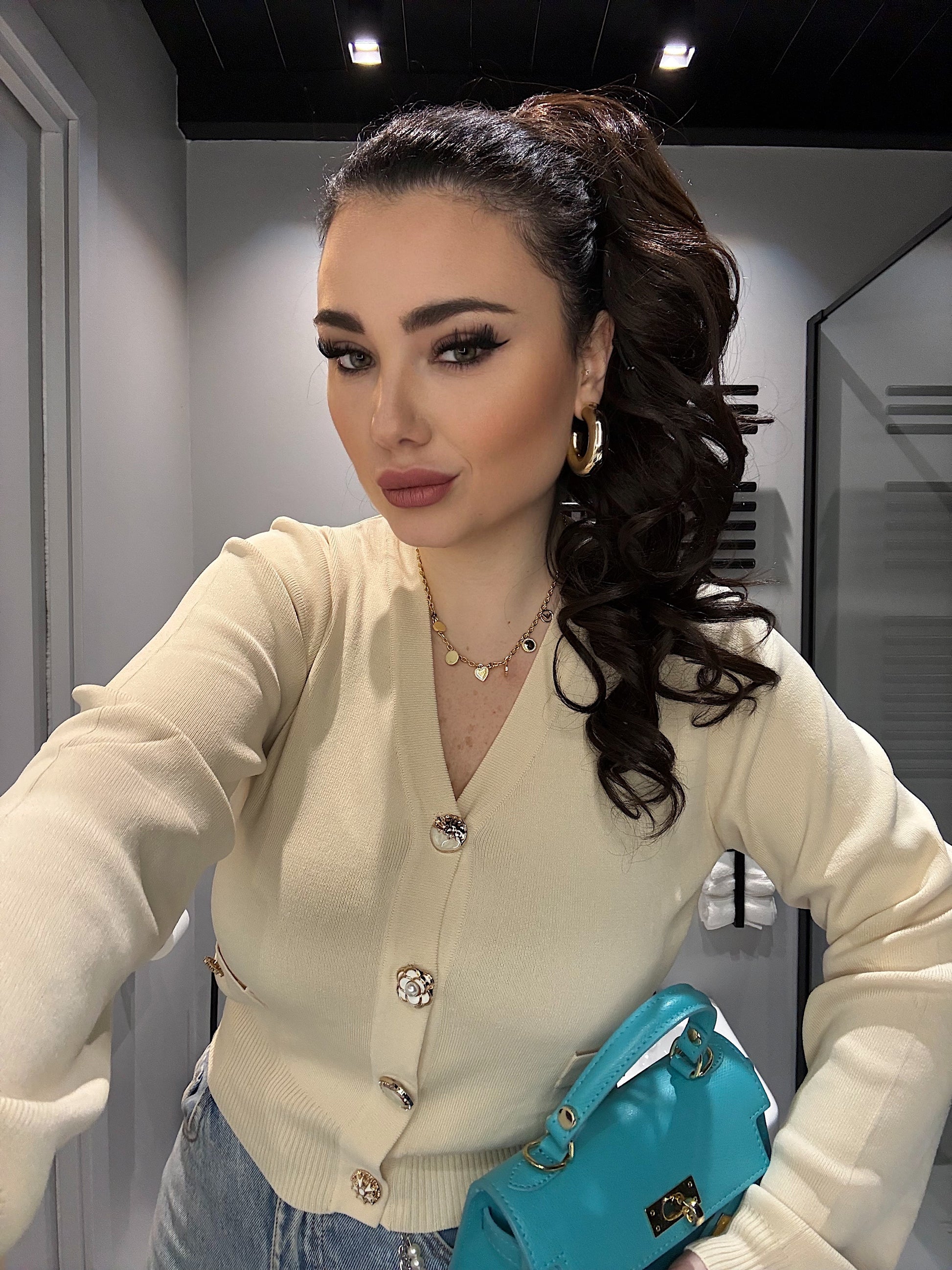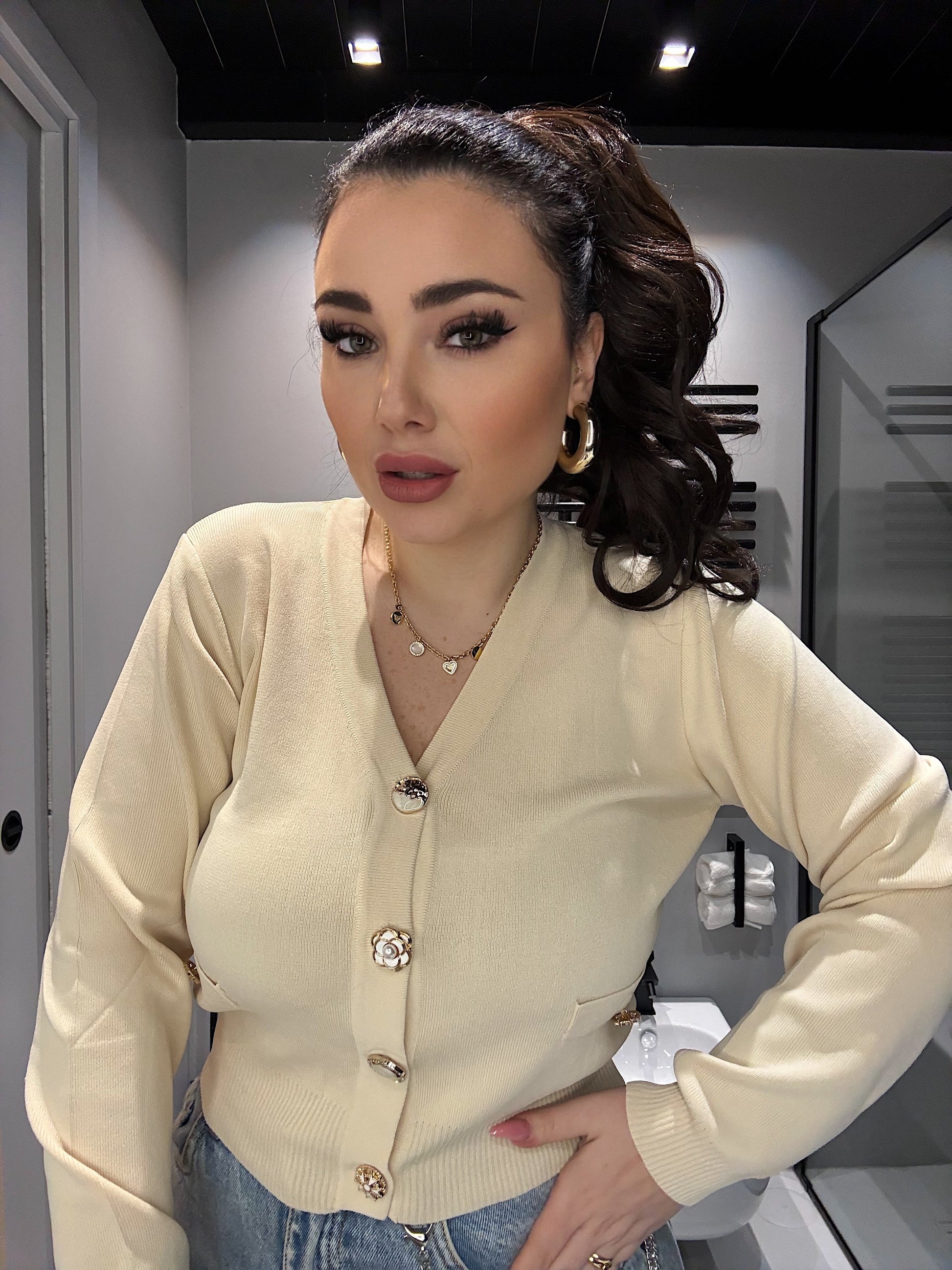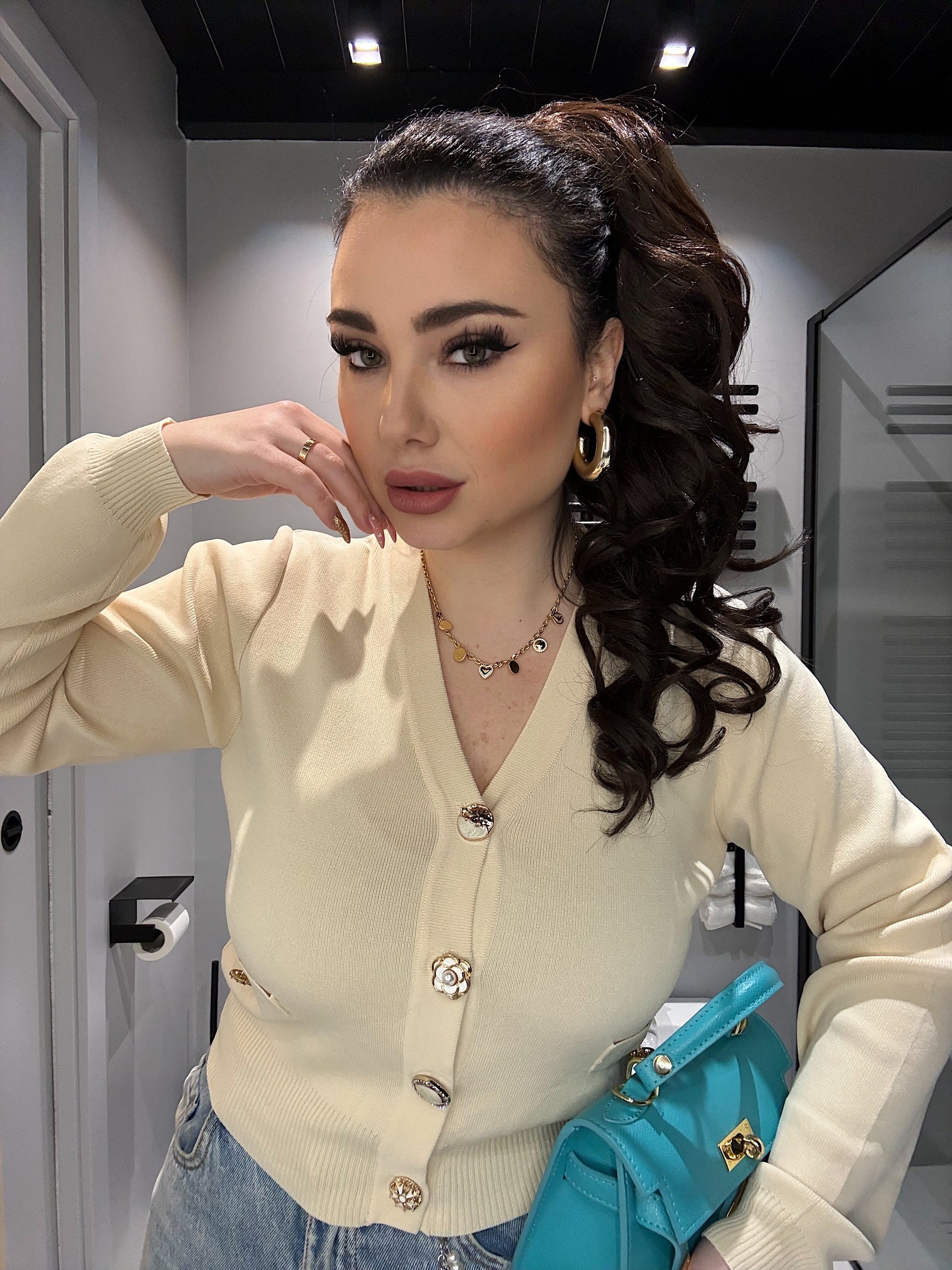 Suéter de cuello en V de alta calidad con botones joya, tejido elástico.
