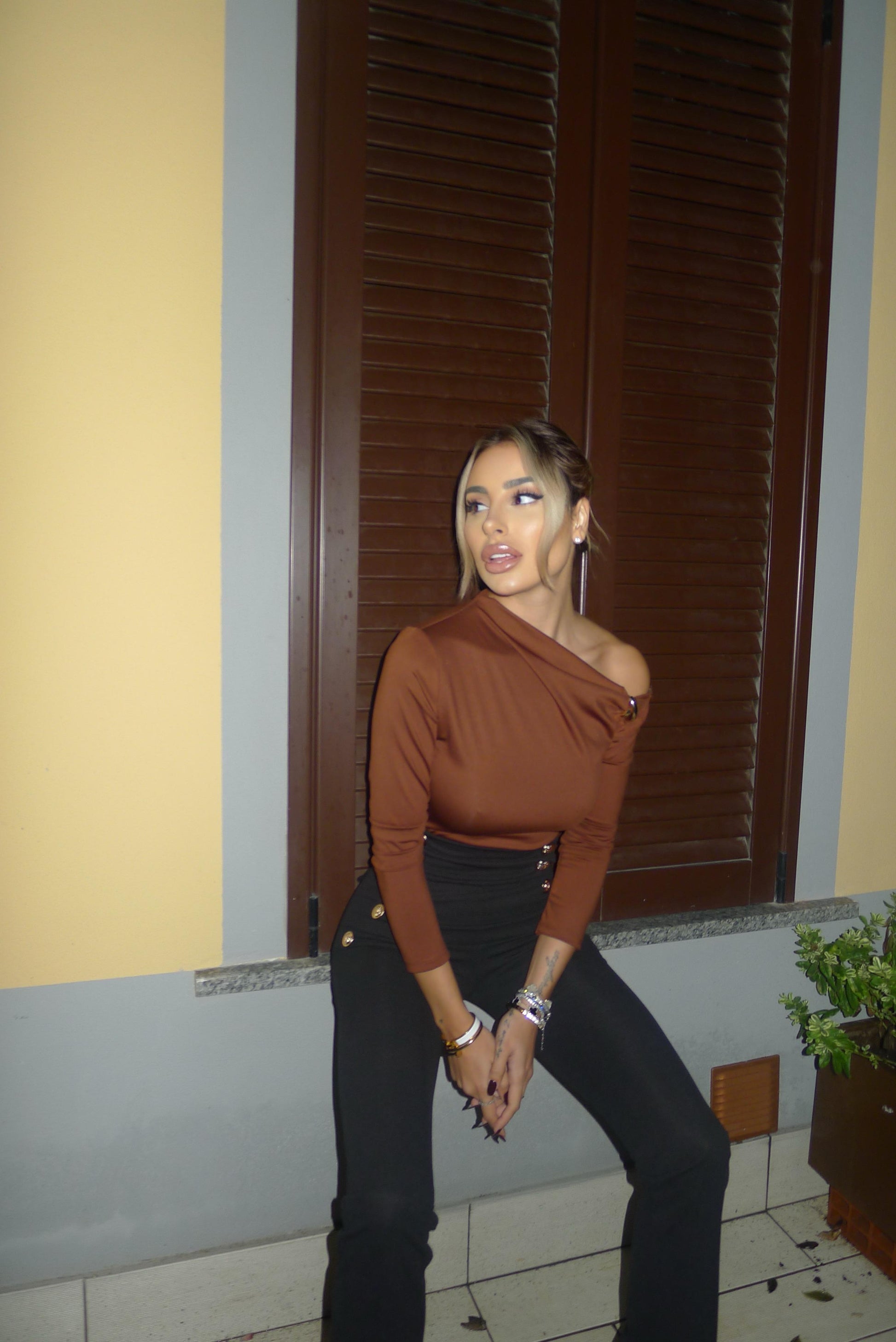 Pantalón palazzo de cintura muy alta con cremallera y botones dorados. Ajuste pequeño. En foto tamaño XS
