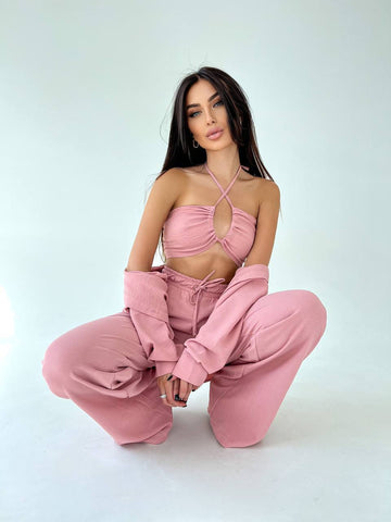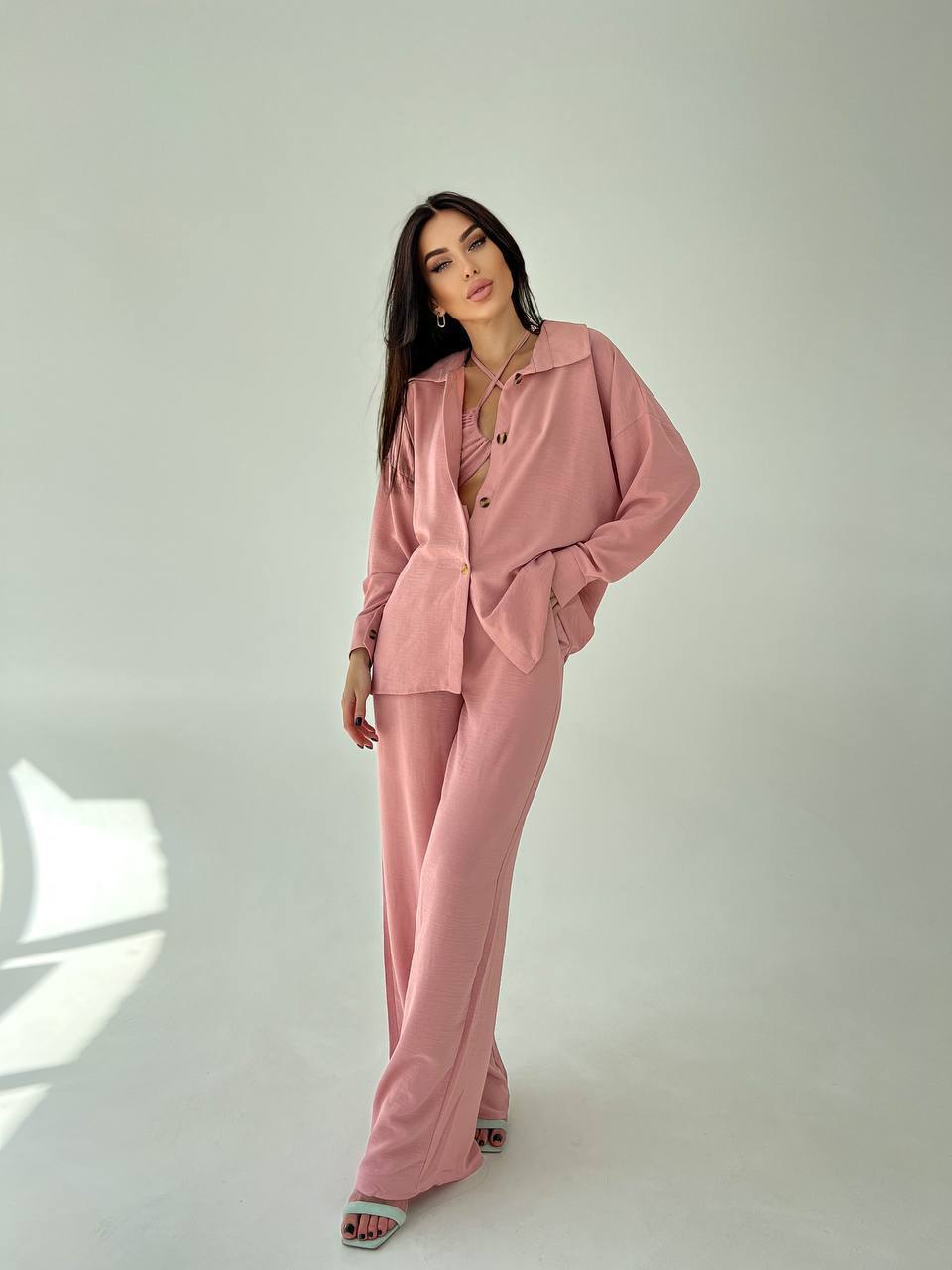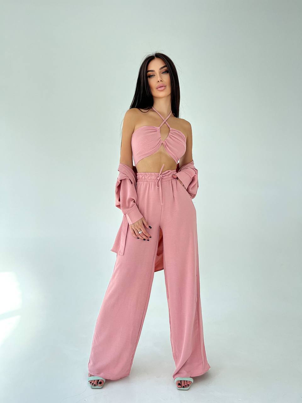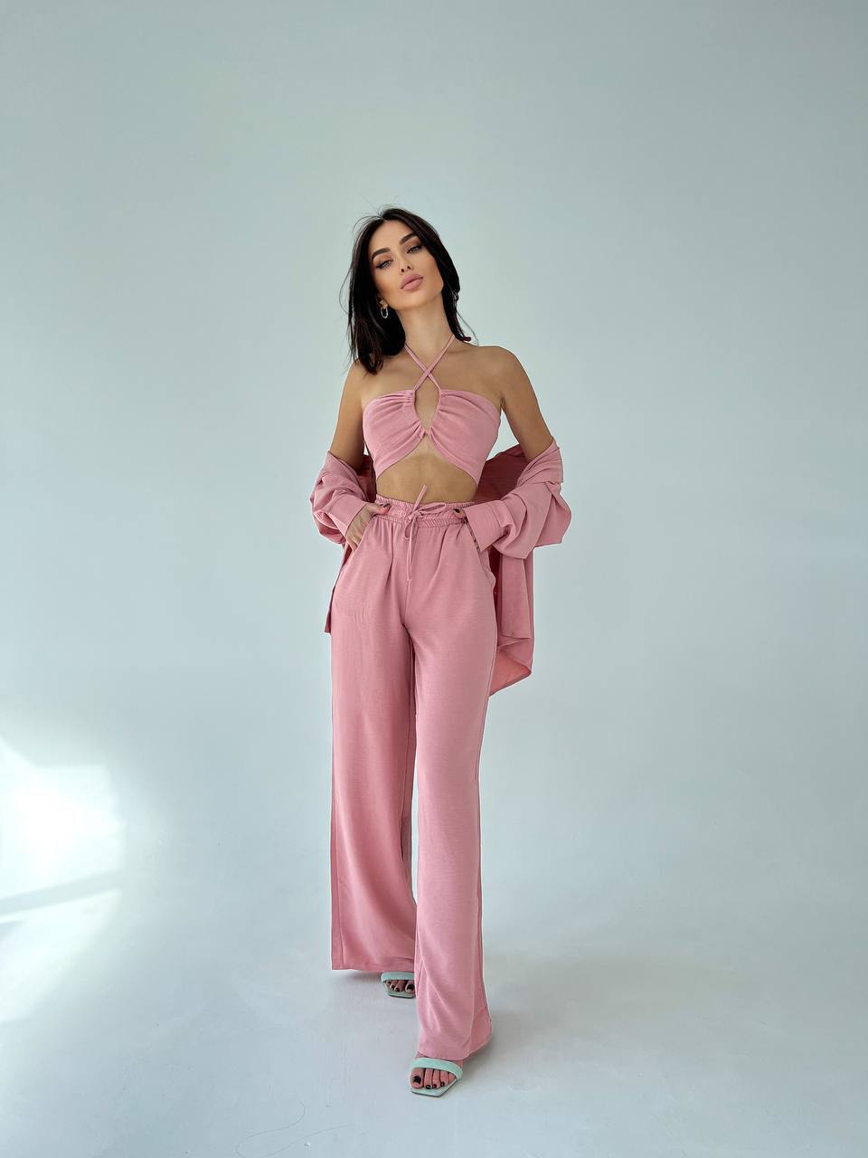 Conjunto tres piezas, camisa, top y pantalón rosa