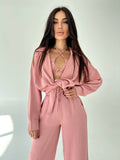 Conjunto de tres piezas que se vende individualmente compuesto por camisa, top y pantalón en tejido fresco y ligero.