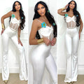 Mono bustier con copas y cruzado en la parte delantera y cremallera en la espalda, pantalón acampanado.