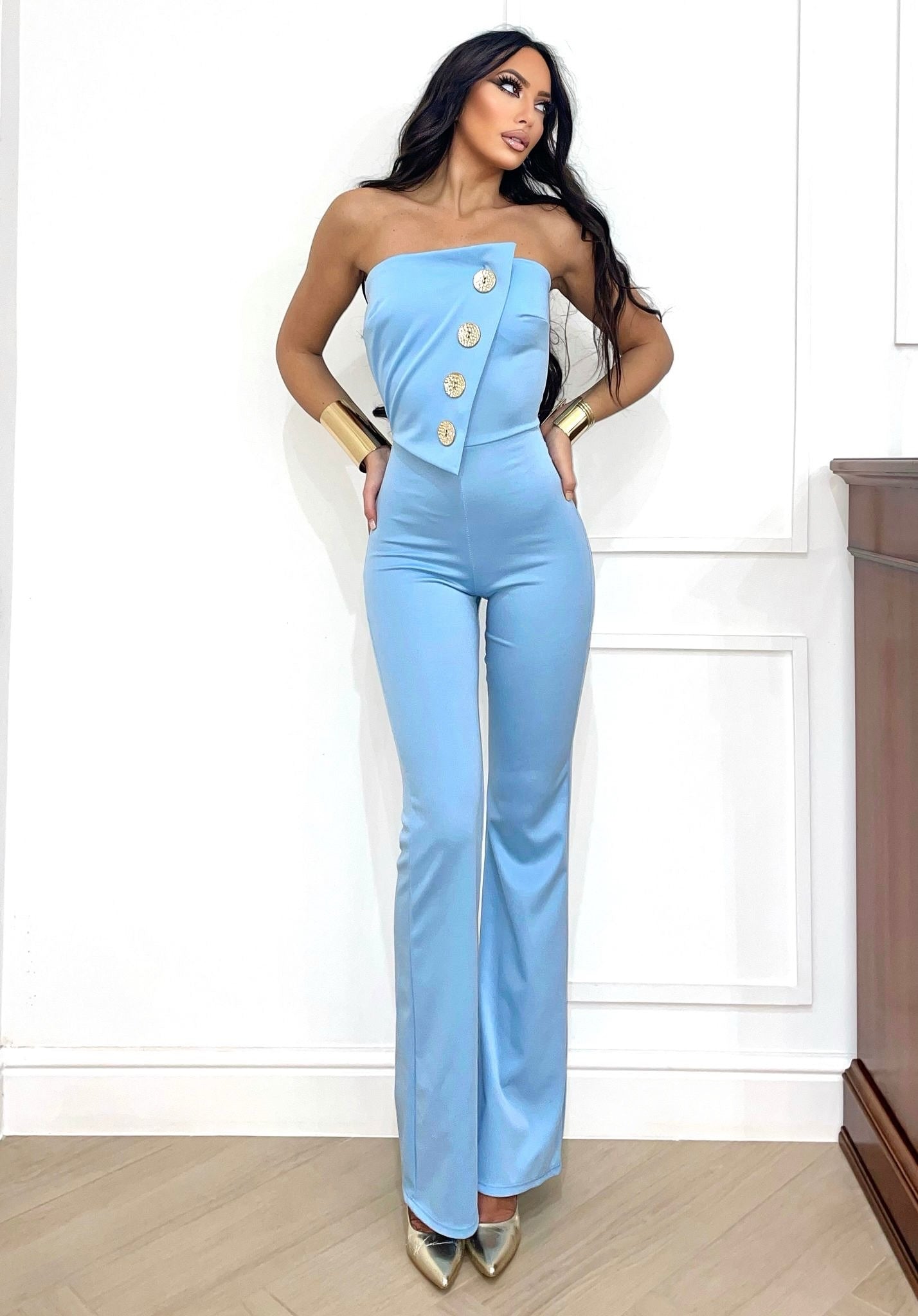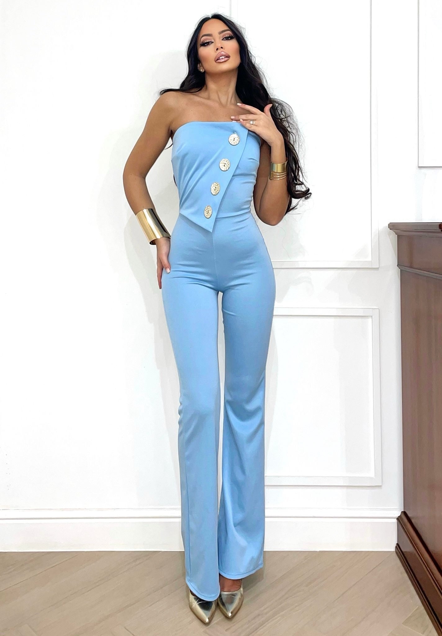 Mono bandeau con cuerpo y copas, corte oblicuo y cremallera. Pantalones palazzo. Botones dorados