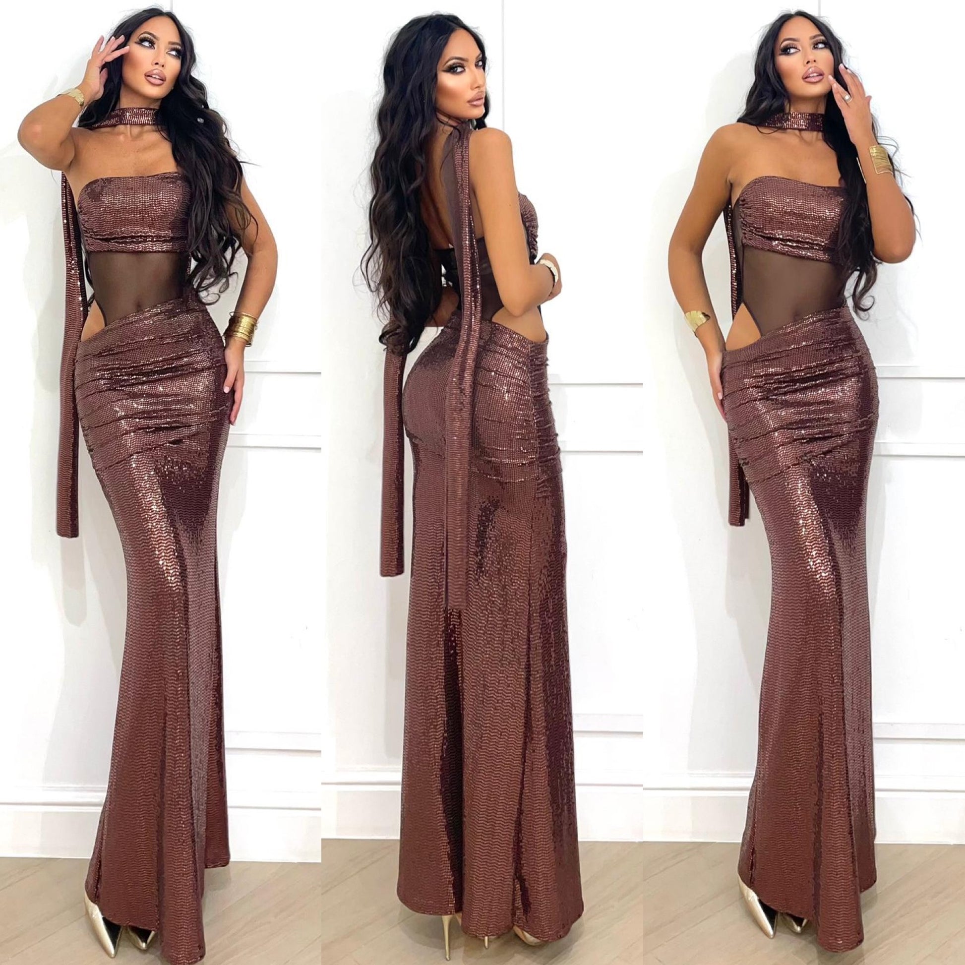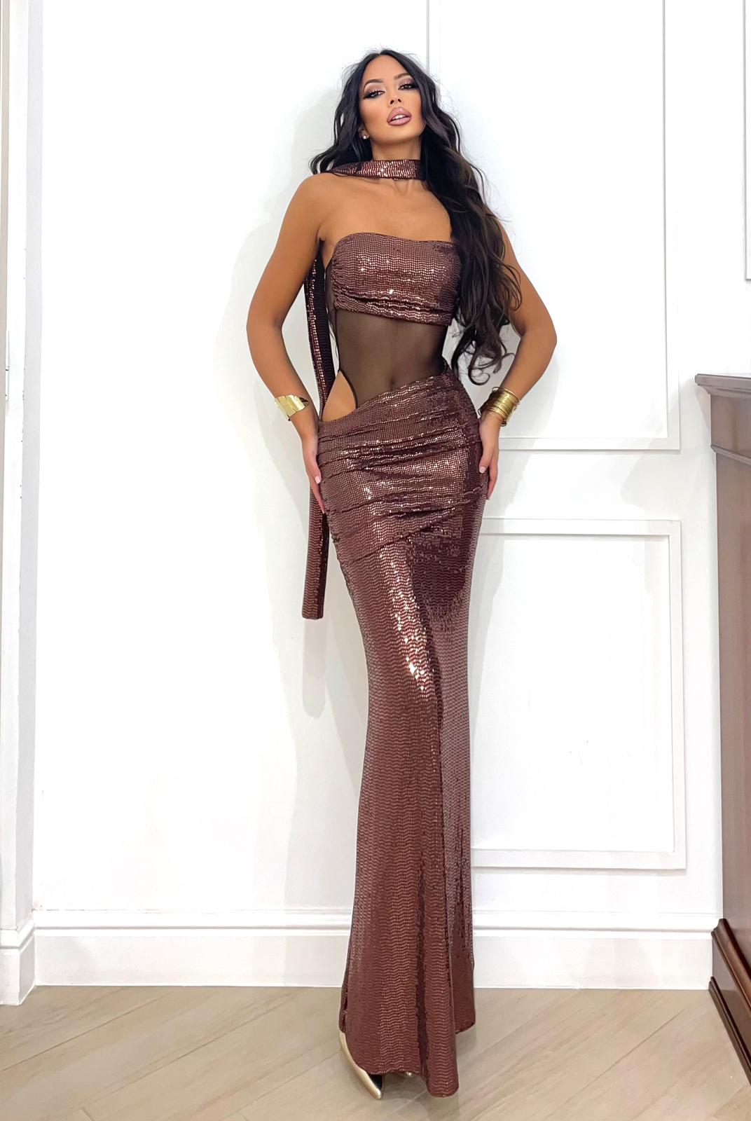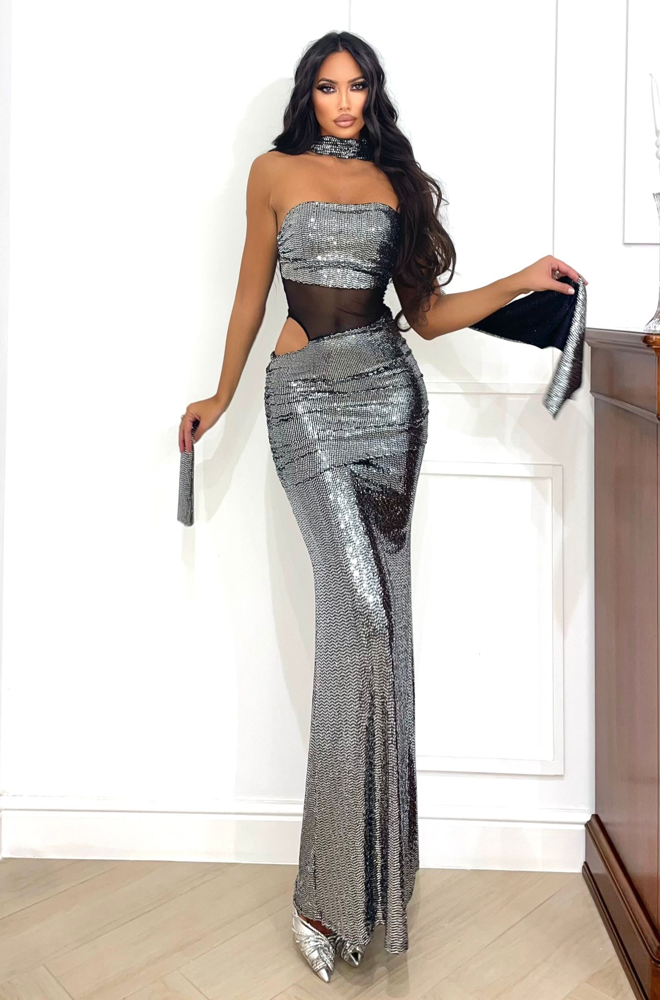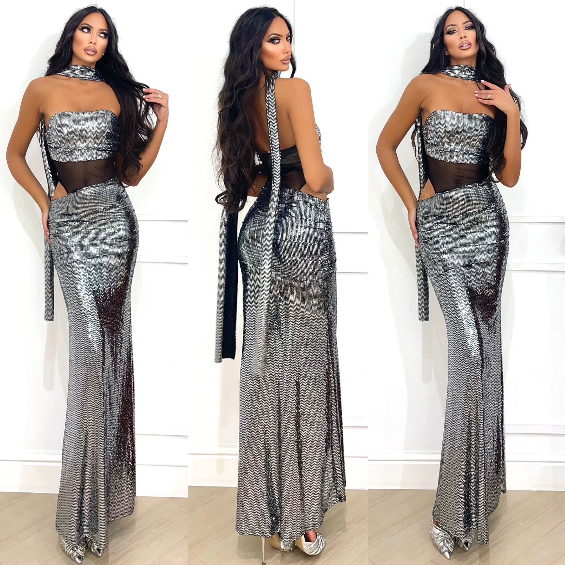 Lasciati conquistare dal fascino magnetico dello Starlight Dress, un abito lungo interamente ricoperto di paillettes che illumina ogni tuo movimento.