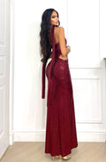 Il design sensuale con tagli laterali velati e schiena scoperta valorizza la silhouette, mentre il collo a sciarpa aggiunge un tocco sofisticato e glamour.