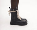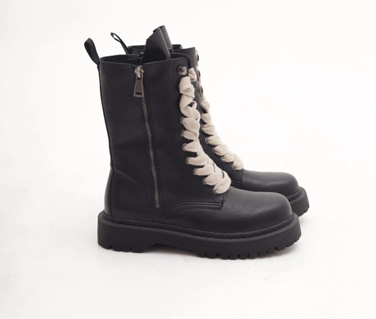 Anfibio in ecopelle nera con maxi suola chunky e lacci a contrasto color panna per un look deciso ma super fashion. Chiusura laterale con zip per una calzata comoda e pratica.