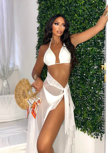 Bikini tre pezzi, top con coppe e gonna in velo, dietro sgambato