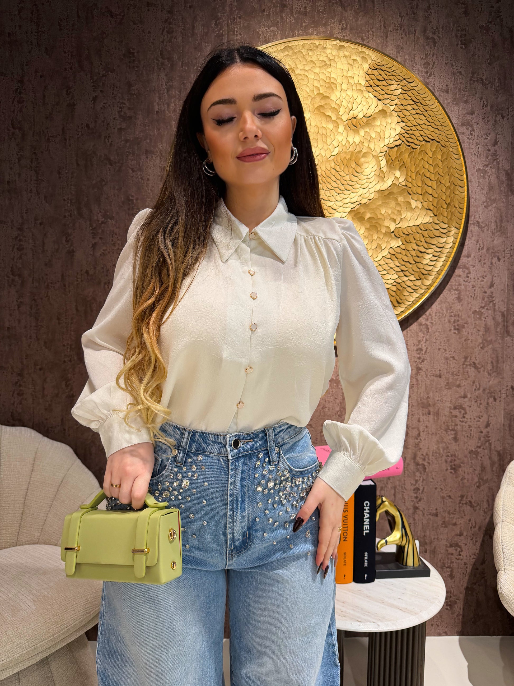 Il colletto importante e le maniche leggermente a sbuffo aggiungono un tocco romantico e di tendenza, mentre i bottoni gioiello rendono questo capo unico e super femminile. Ideale per ufficio, eventi o occasioni speciali.