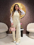 Un set chic e luminoso che valorizza la silhouette grazie al top strutturato e al pantalone a gamba larga super slanciante.