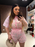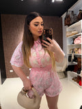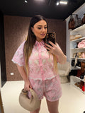 Completo estivo elegante e raffinato composto da camicia crop e shorts coordinati in tessuto ricamato traforato con dettagli gioiello sul colletto. Un look fresco e luminoso perfetto per la stagione estiva, ideale sia per il giorno che per le serate casual chic.
