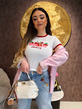 Maglia con ciliegie stampate e scritta.
