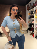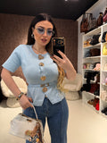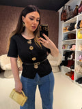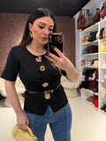 Il design strutturato con punto vita evidenziato slancia la figura, mentre i bottoni gioiello dorati donano un tocco glamour e luminoso. Ideale per outfit da ufficio, eventi o occasioni speciali.