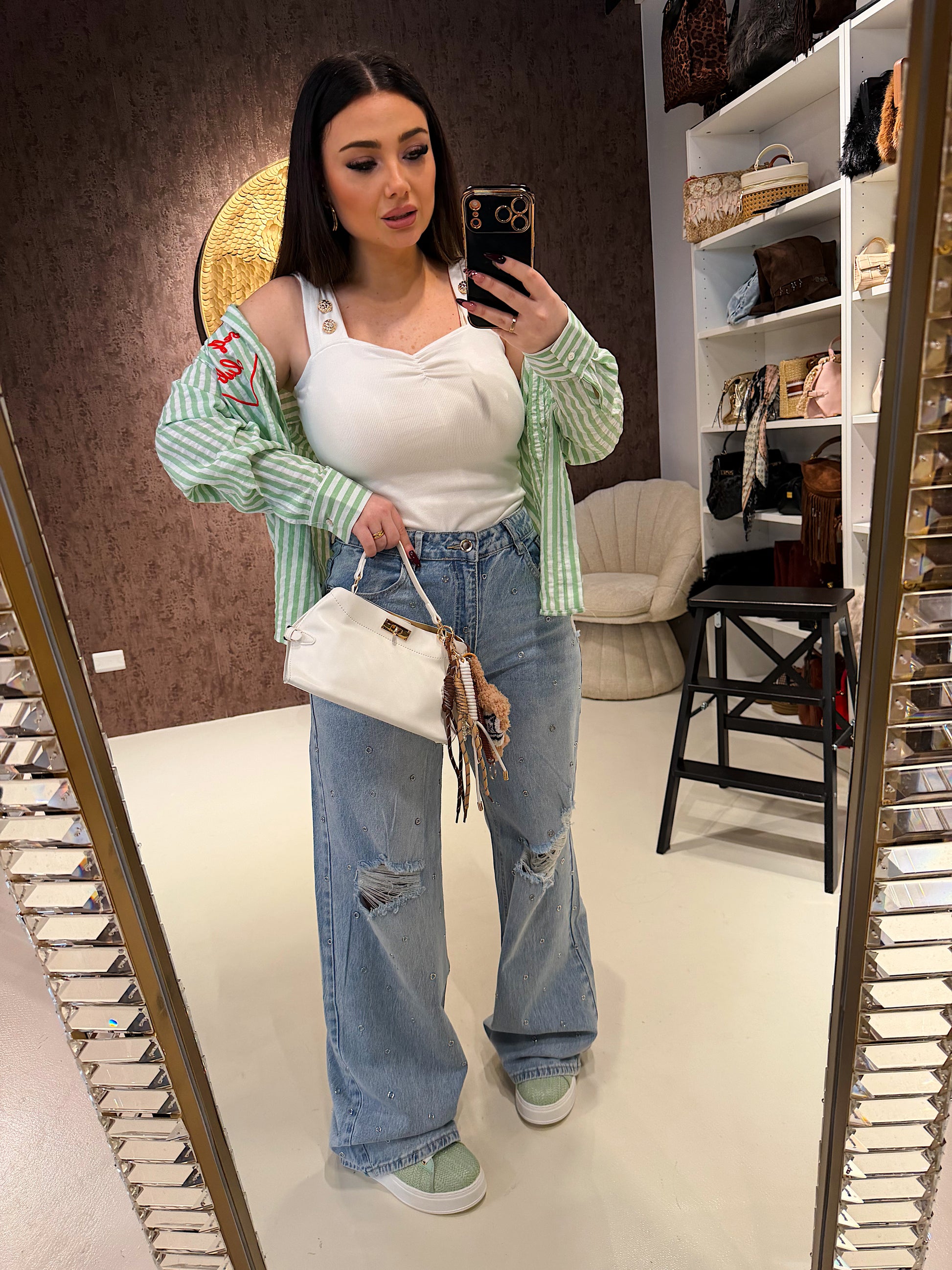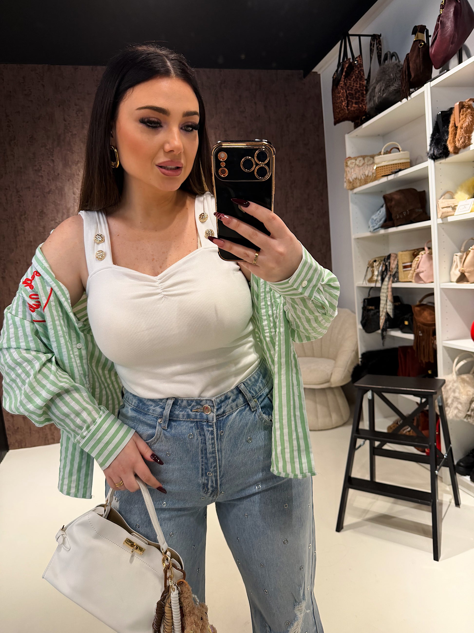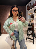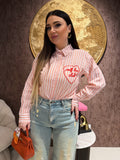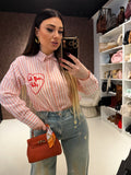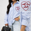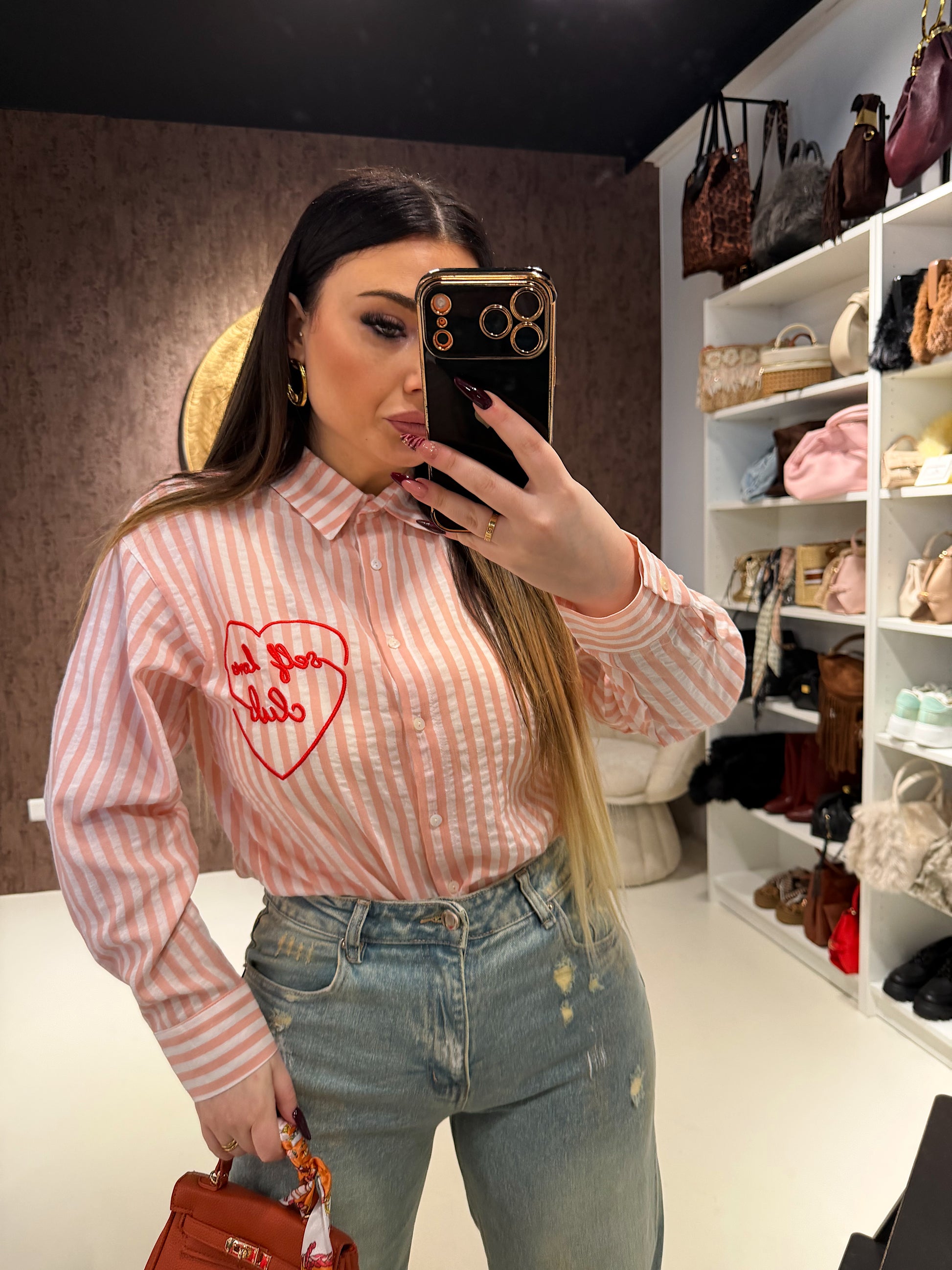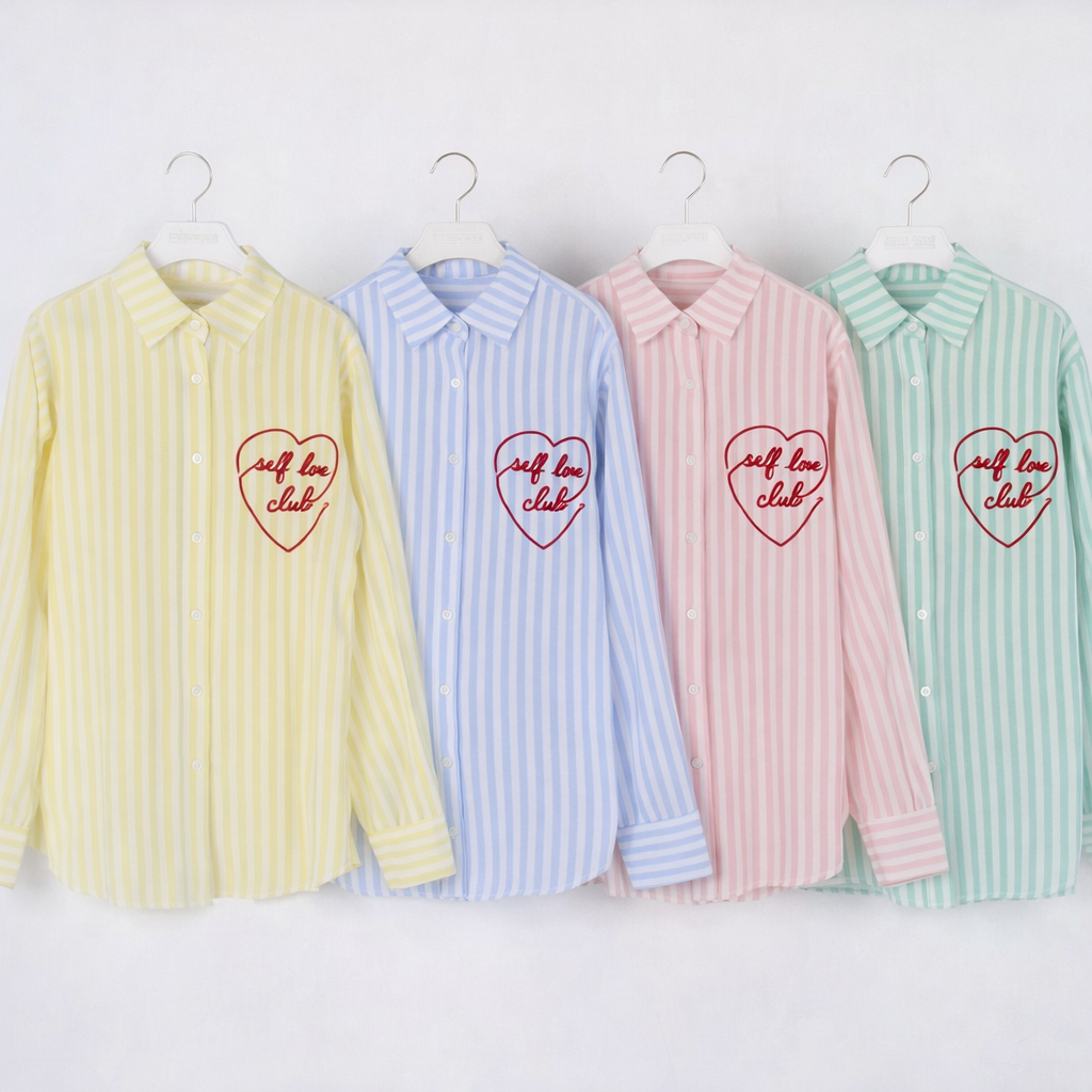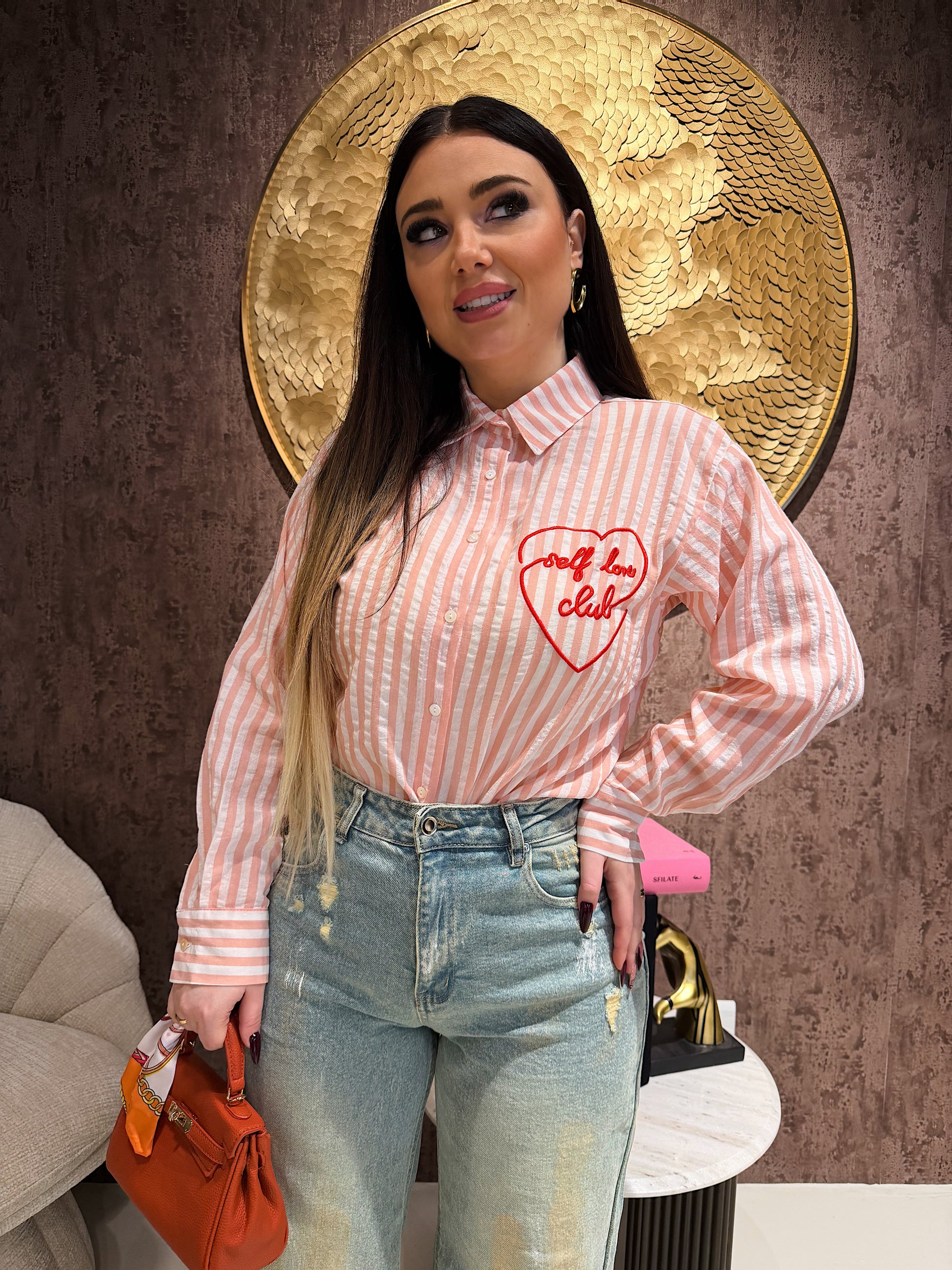 La camicia "Self Love Club" presenta un design a righe distintivo, caratterizzato da una scritta all'interno di un cuore. Questa camicia non solo offre un'estetica moderna, ma promuove anche un messaggio di positività e accettazione di sé. Realizzata in tessuti di alta qualità, garantisce comfort e durata.