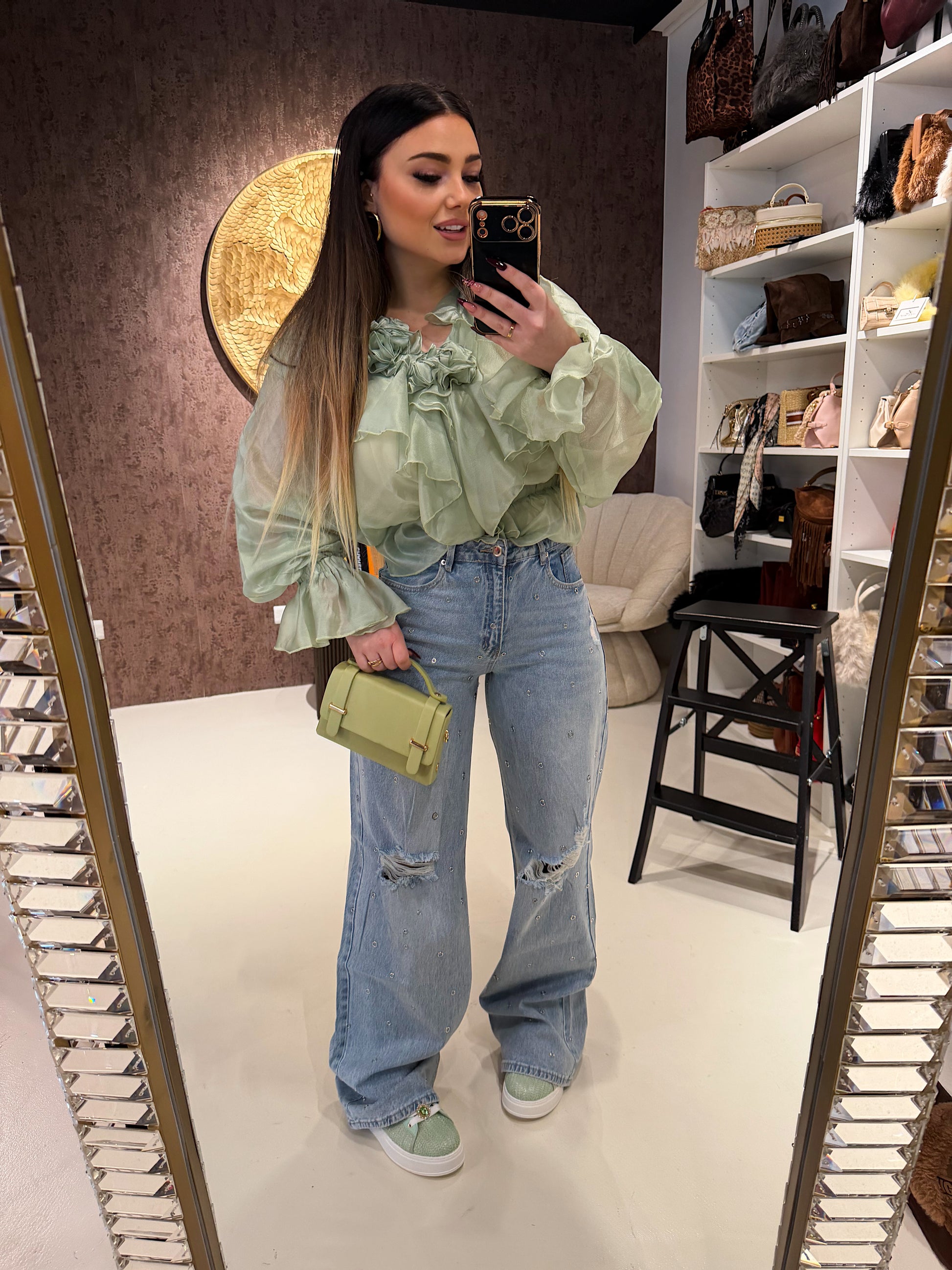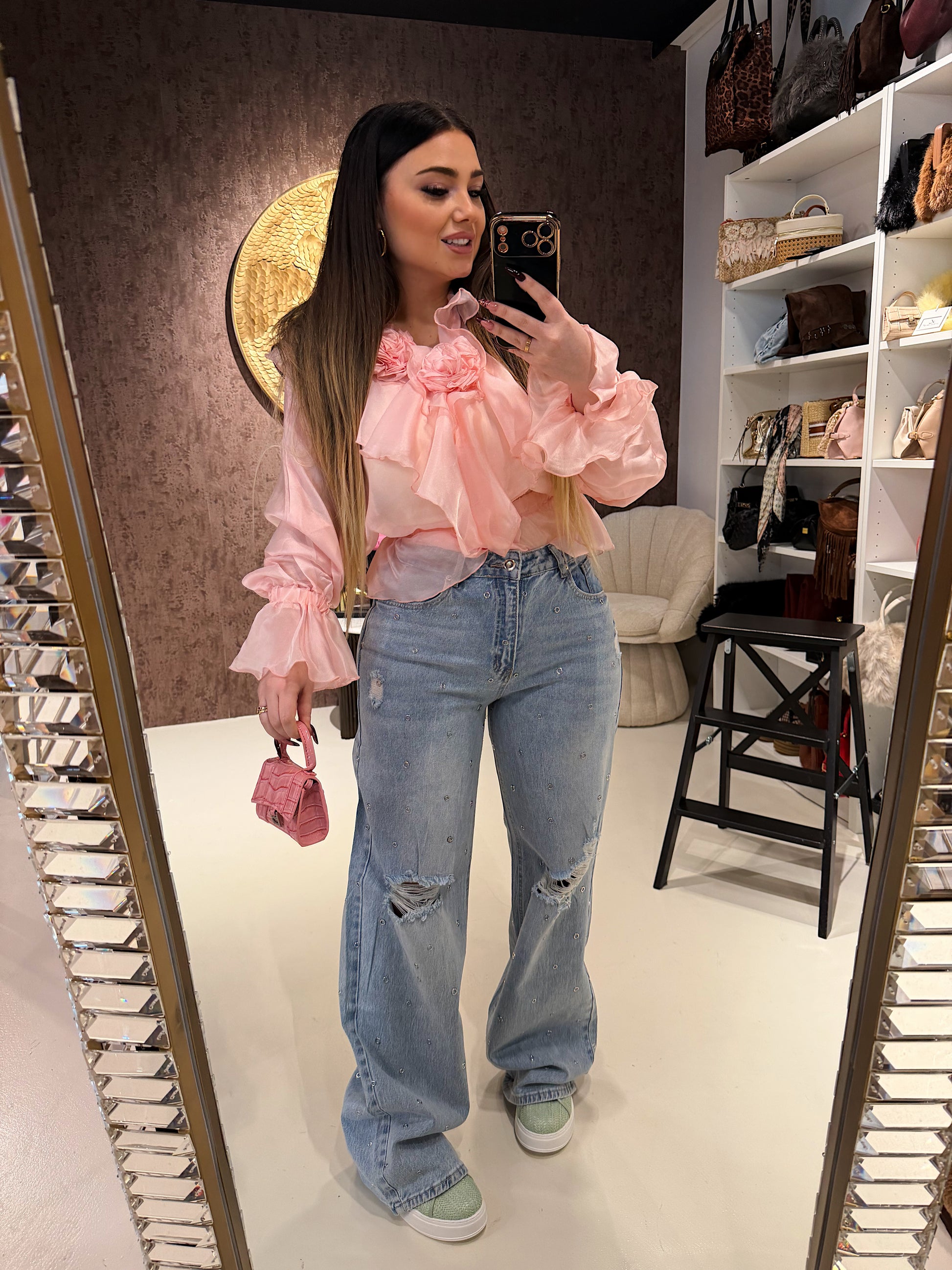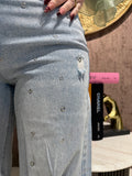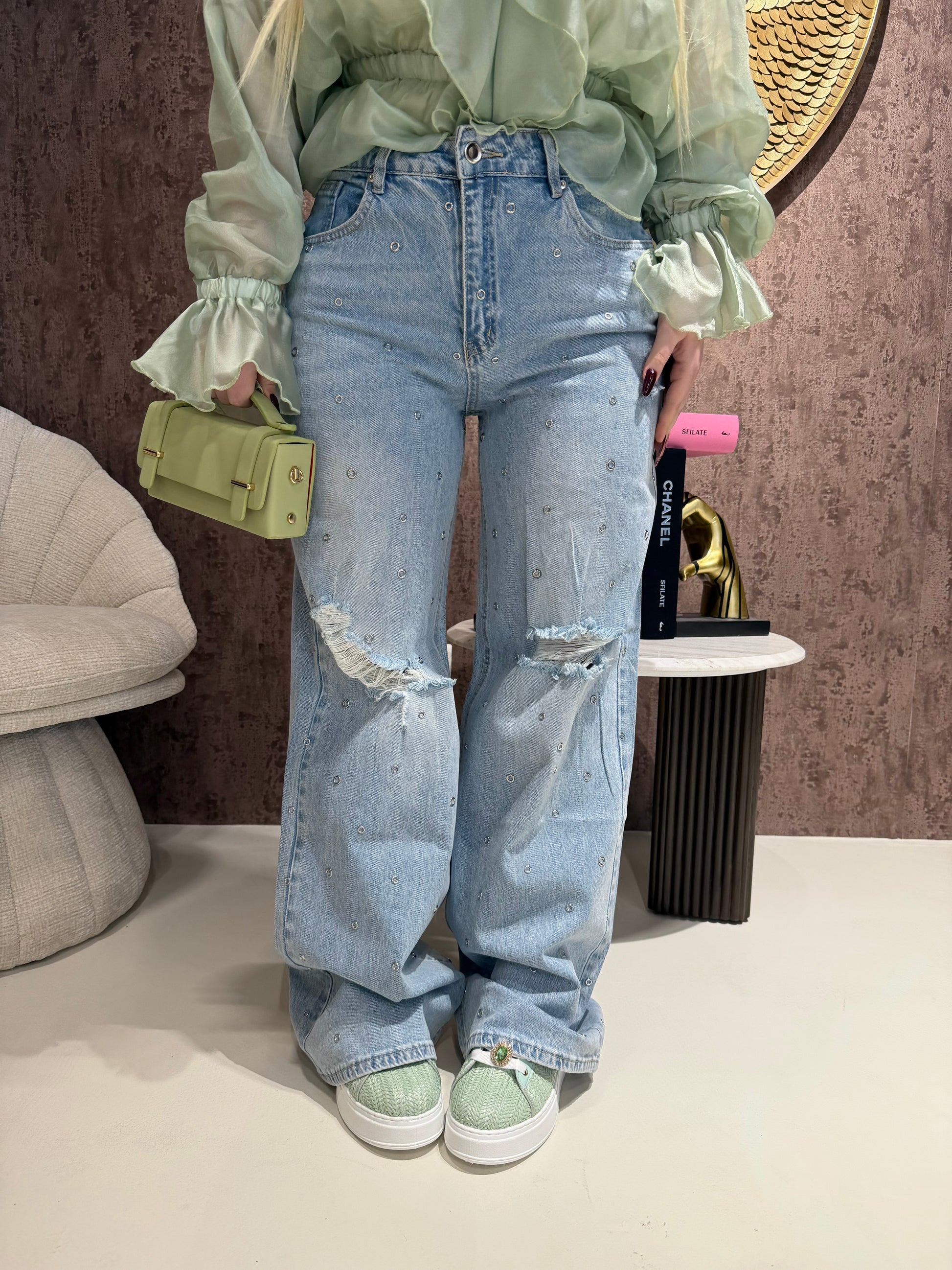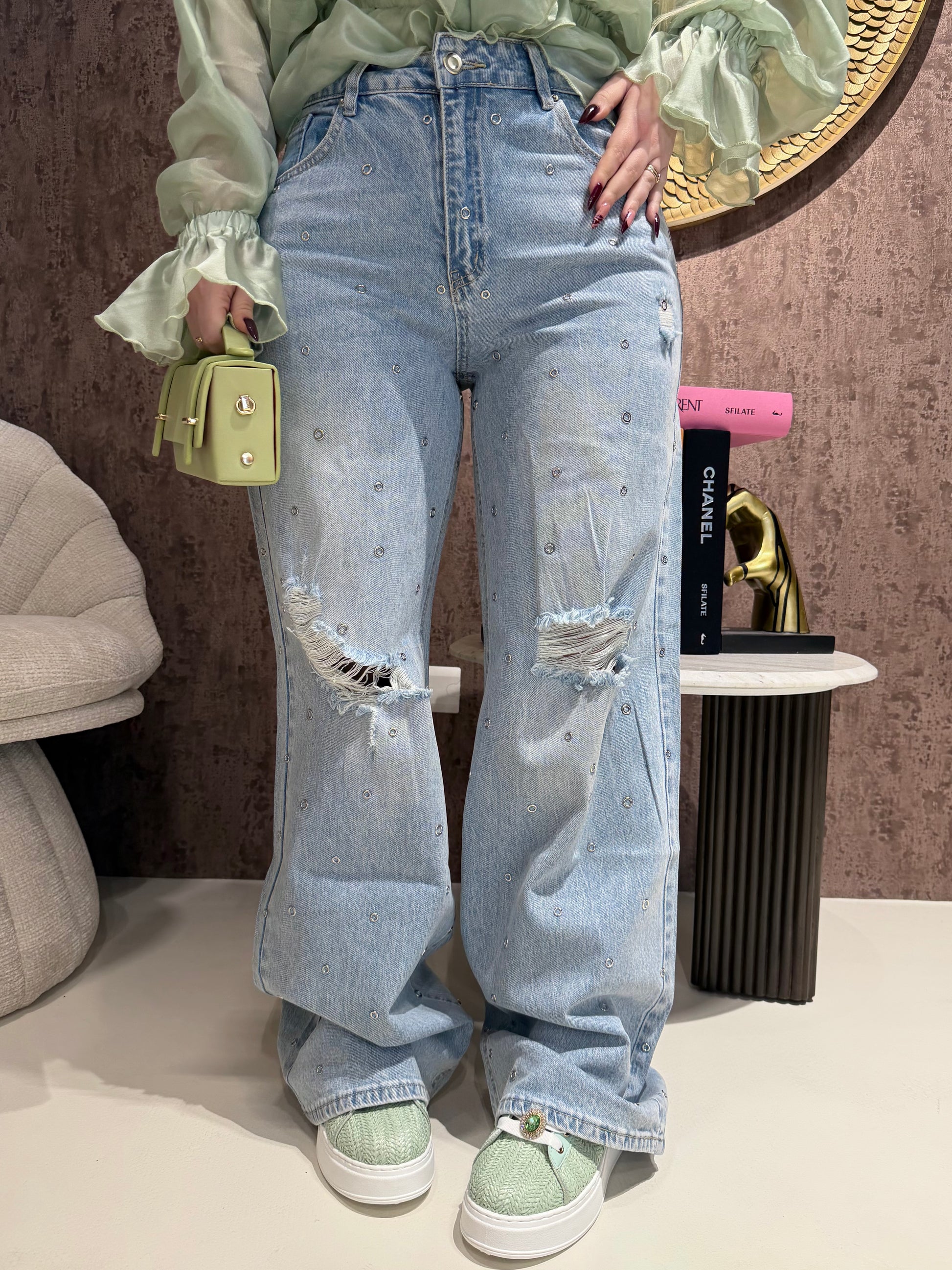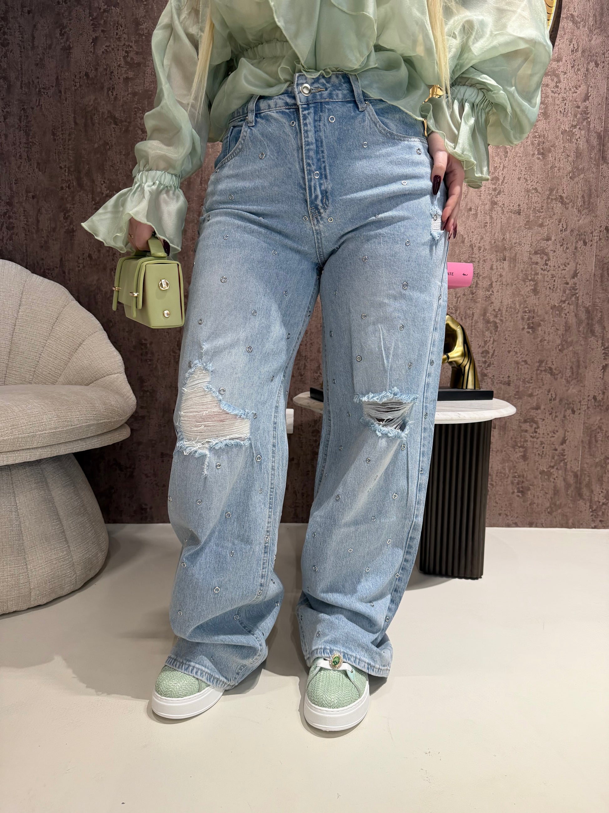 Jeans con strappi e borchiette