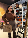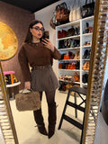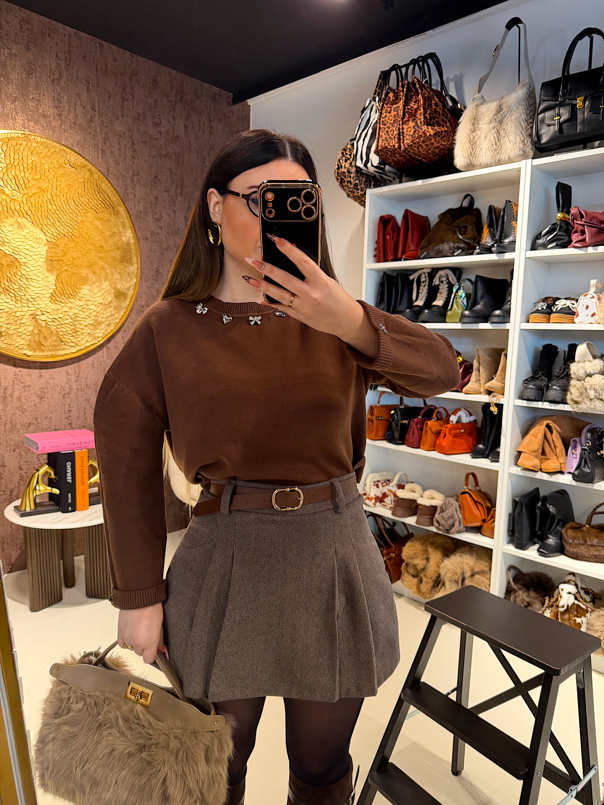 Maglione color cioccolato con decorazioni gioiello sullo scollo, perfetto per aggiungere un tocco luminoso al tuo look. Morbidissimo, caldo e chic, unisce eleganza e comfort in un unico capo. Ideale sia per il giorno che per la sera — firmato RA Boutique