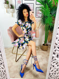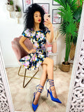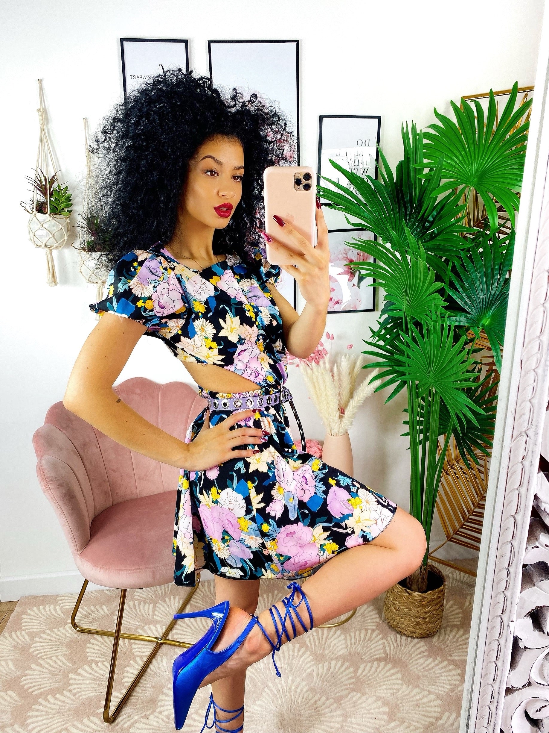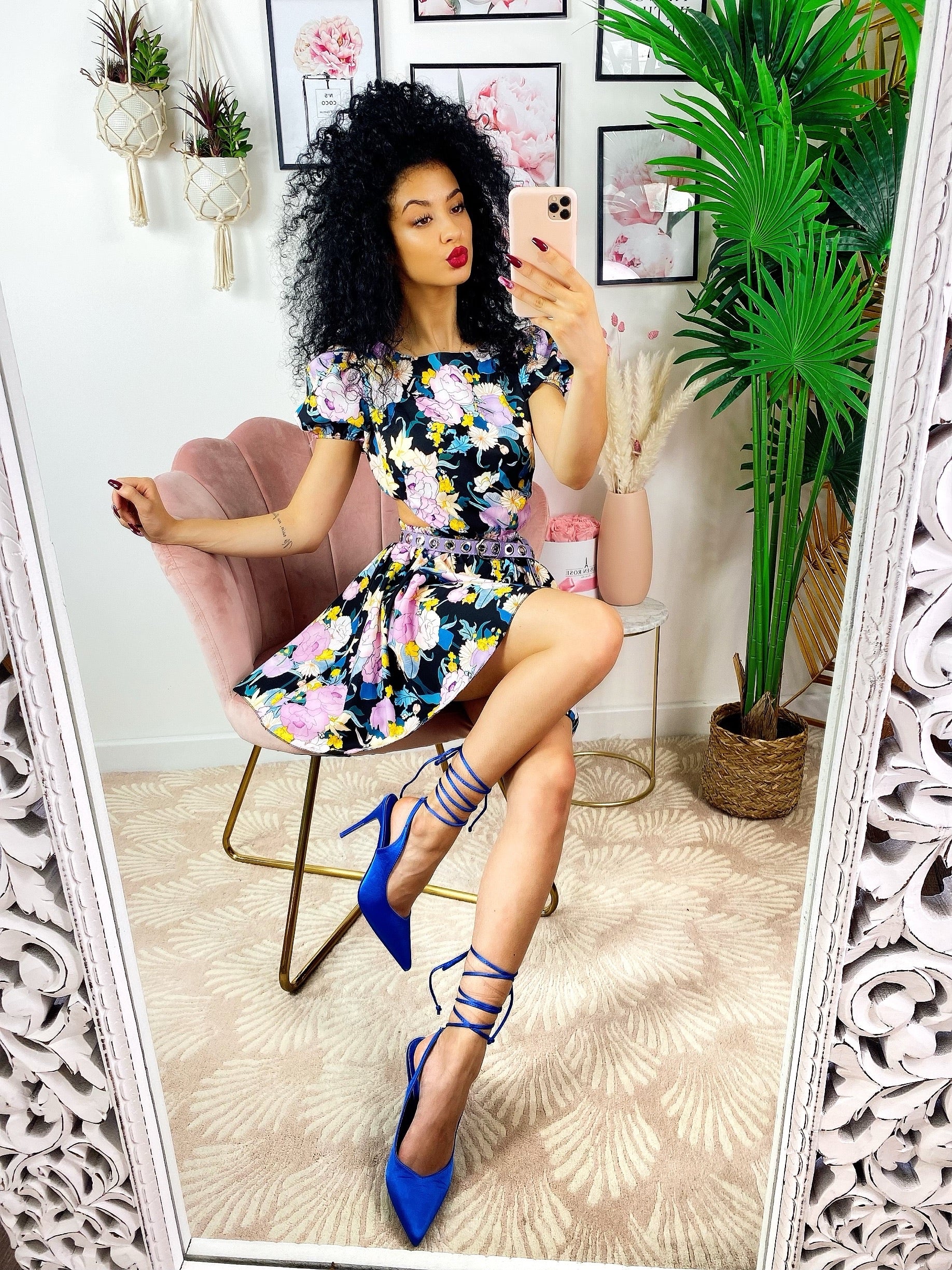 Liliowa sukienka w kwiaty z odkrytymi plecami. Na elastycznych ramiączkach, mocowanych na stałe i krzyżowanych. Kubki w zestawie