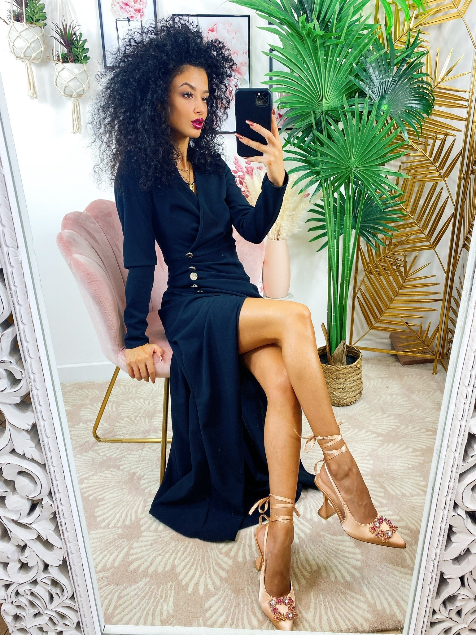 Dopasowana sukienka o kroju syreny, zapinana z tyłu na zamek. Plisy i guziki z przodu