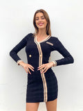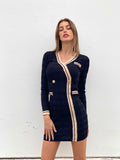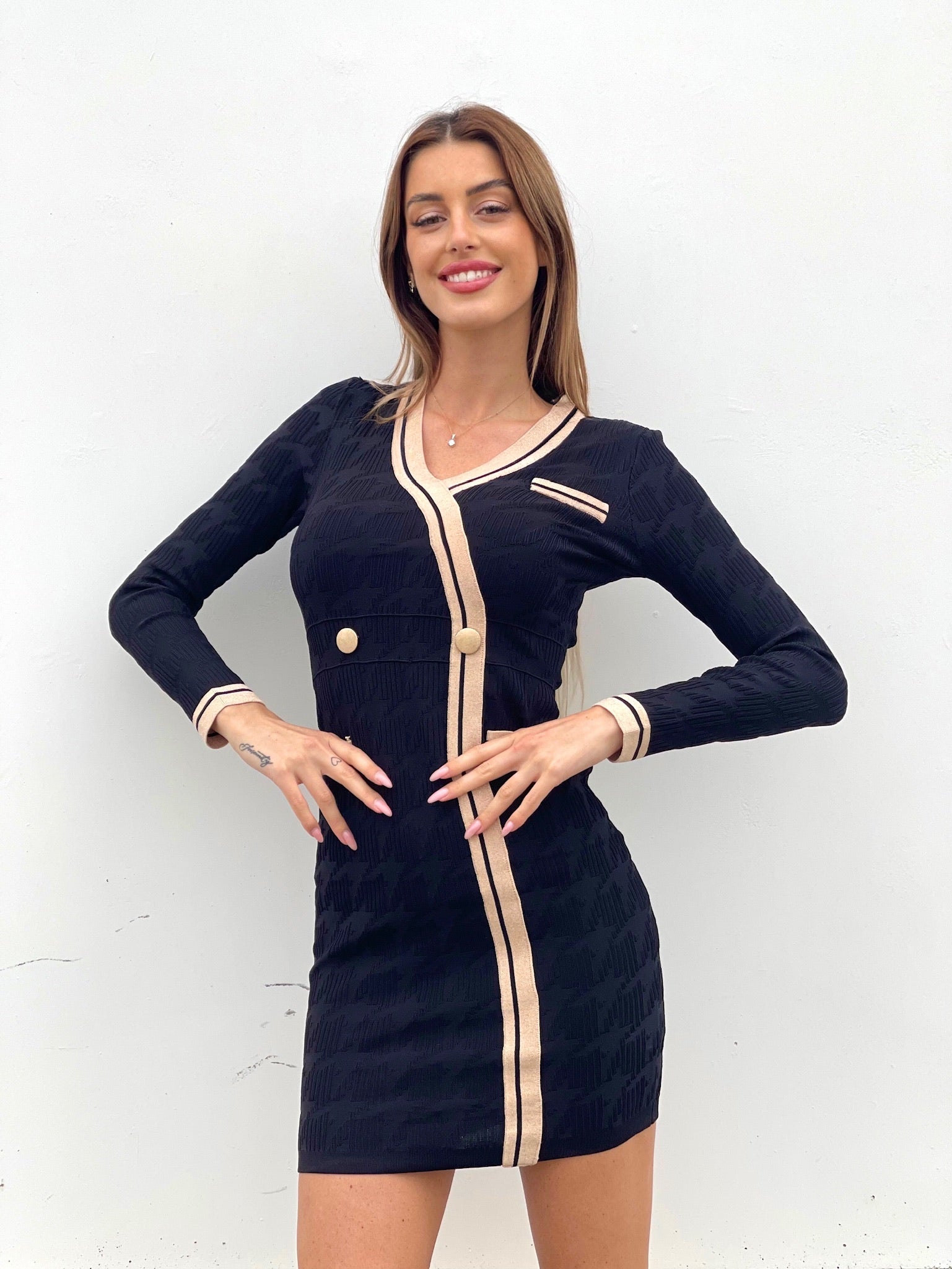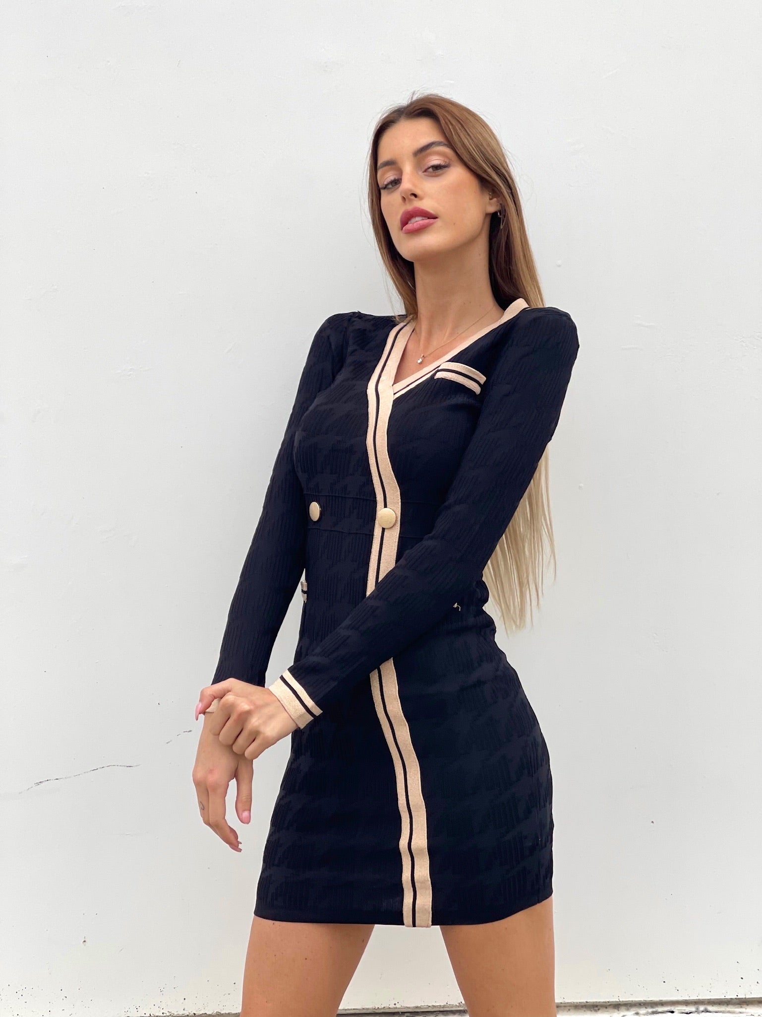 Dopasowana dzianinowa sukienka o fakturze pepitki ze złotym zapięciem na guziki. Elegancka i mega seksowna