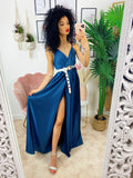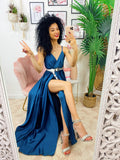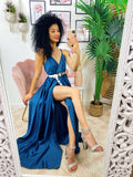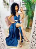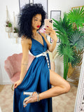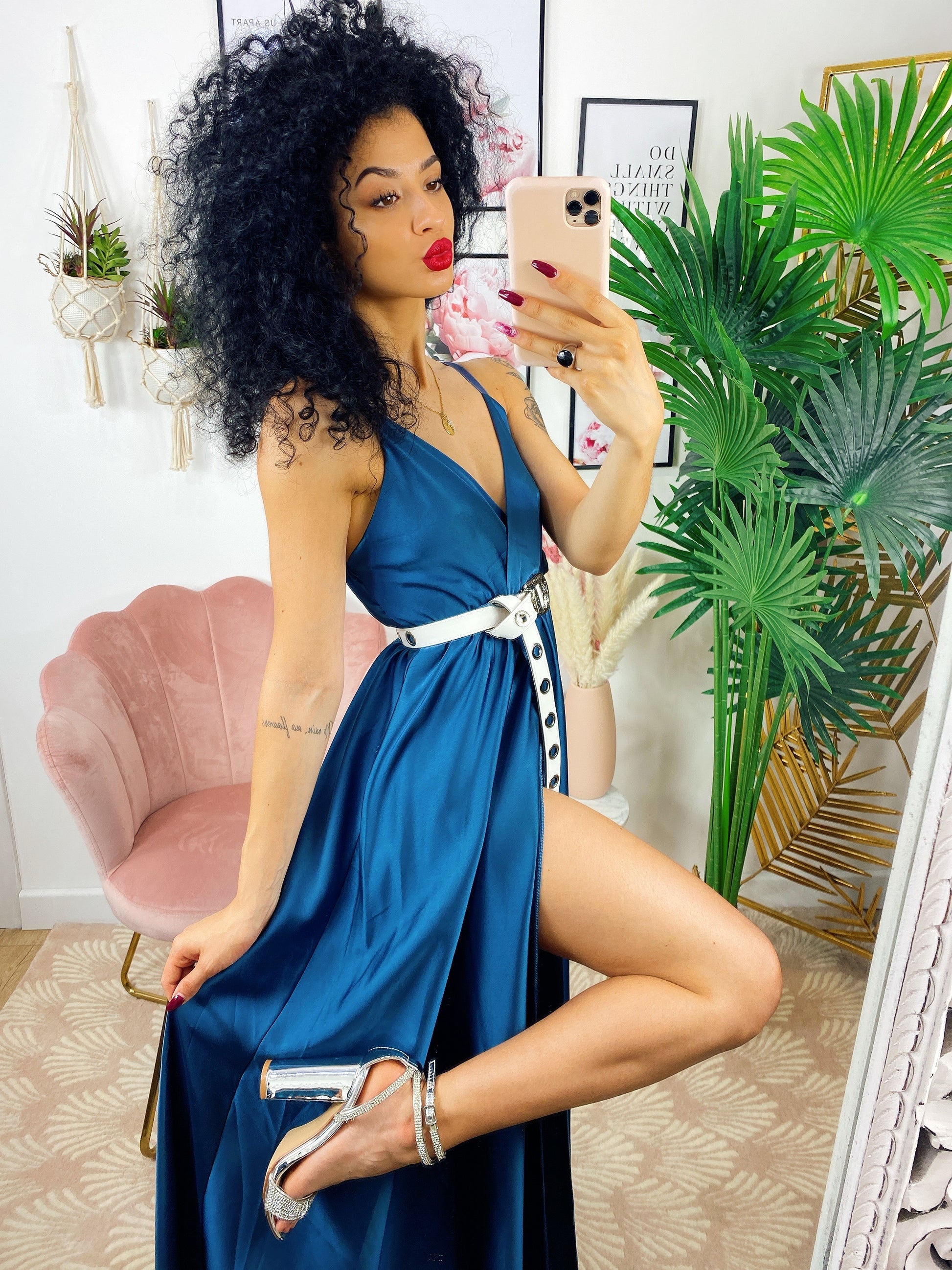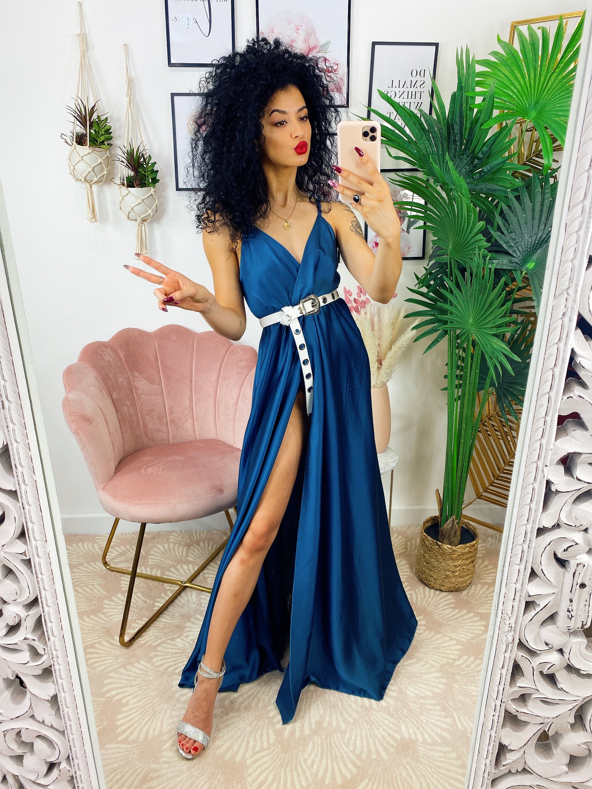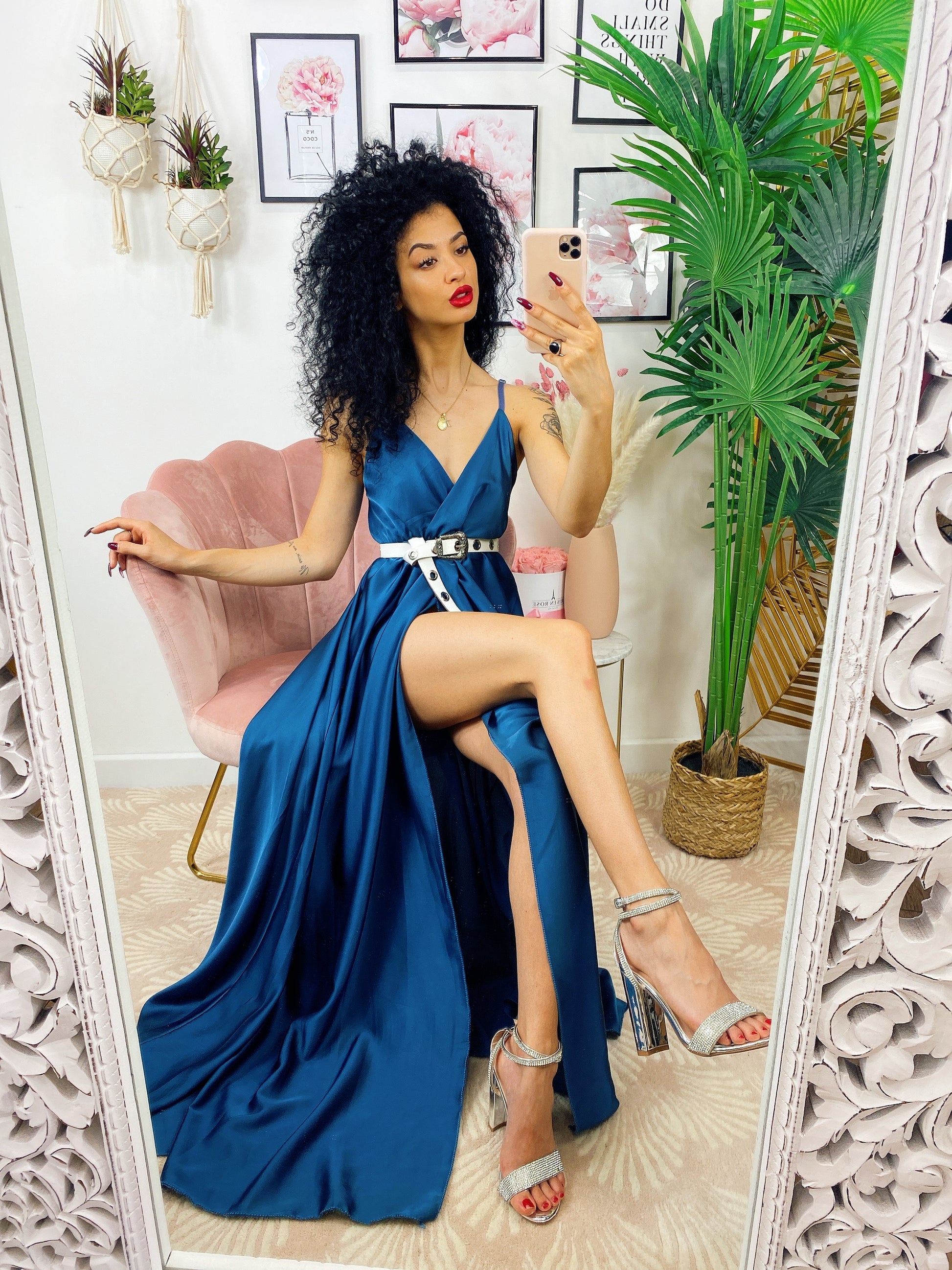 Satynowa sukienka z rozcięciem maxi w kolorze petrol