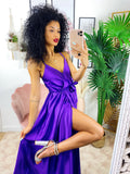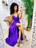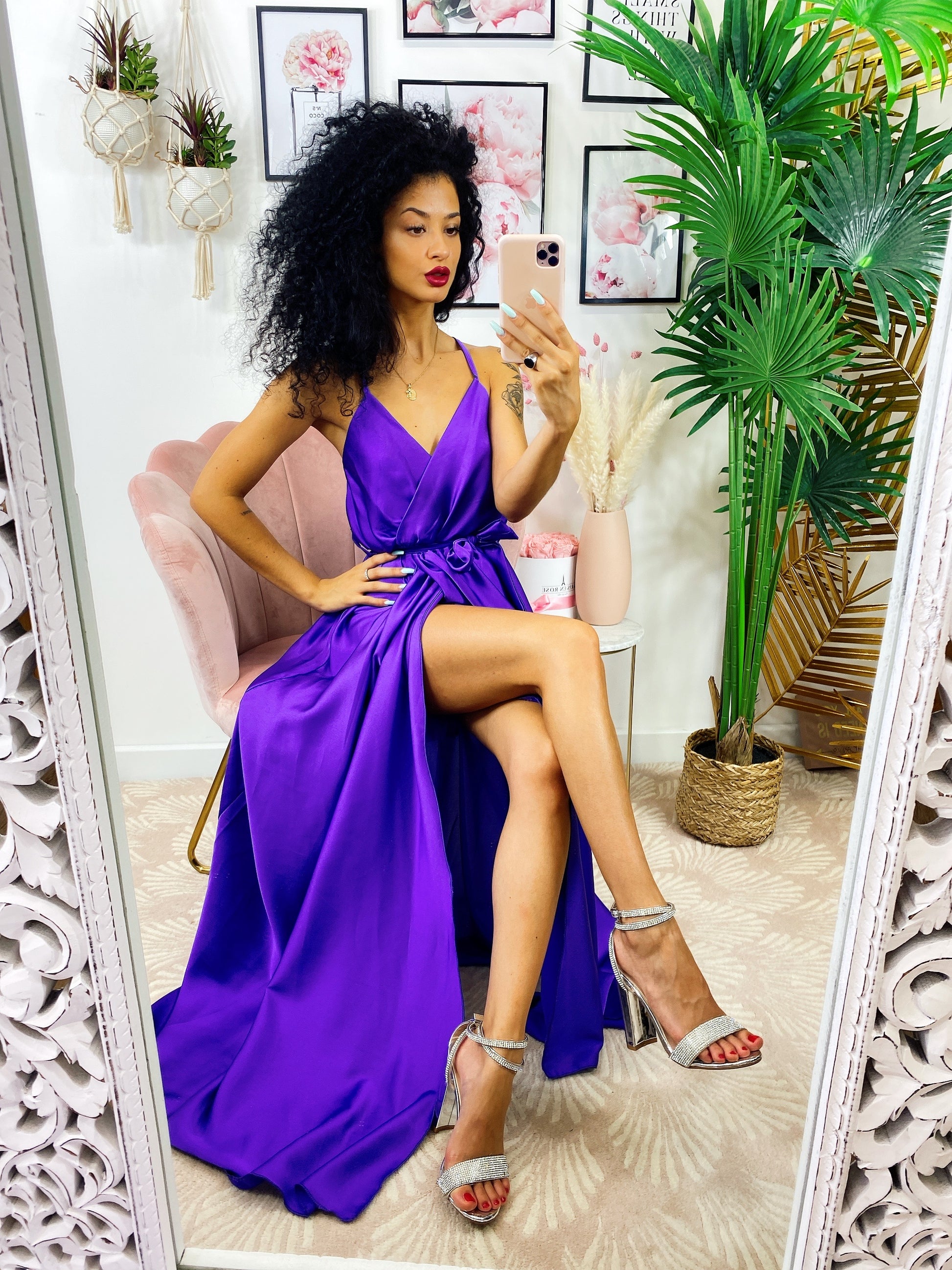 Wysokiej jakości satynowa sukienka z fioletowym rozcięciem maxi. Fantastyczna bardzo długa sukienka do noszenia z ładnym obcasem na najbardziej efektowne wieczory. Wydobądź swoją zmysłowość i pragnienie bycia kobietą, będziesz najbardziej kochaną wieczoru!!