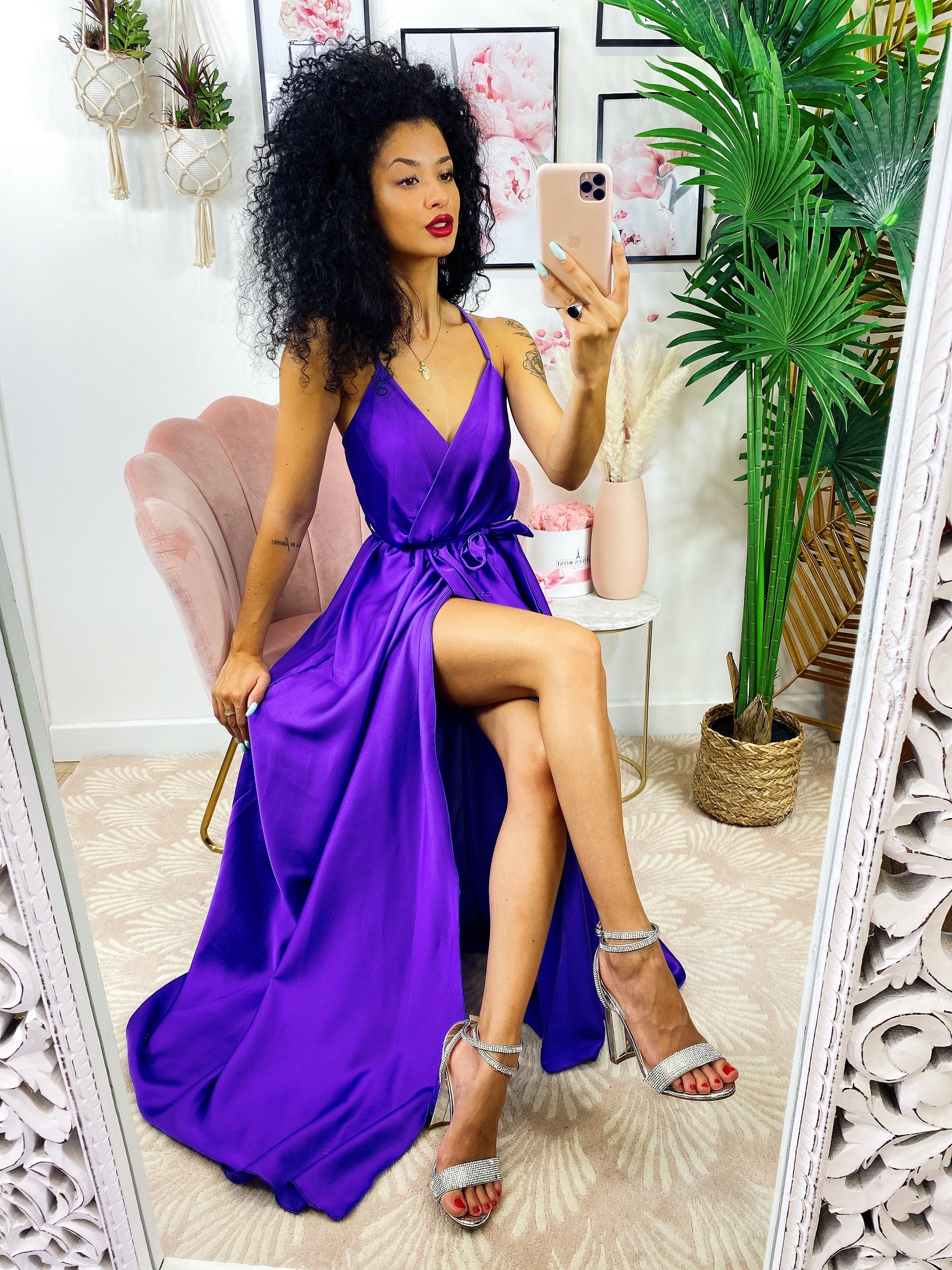 Satynowa sukienka z fioletowym rozcięciem maxi