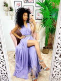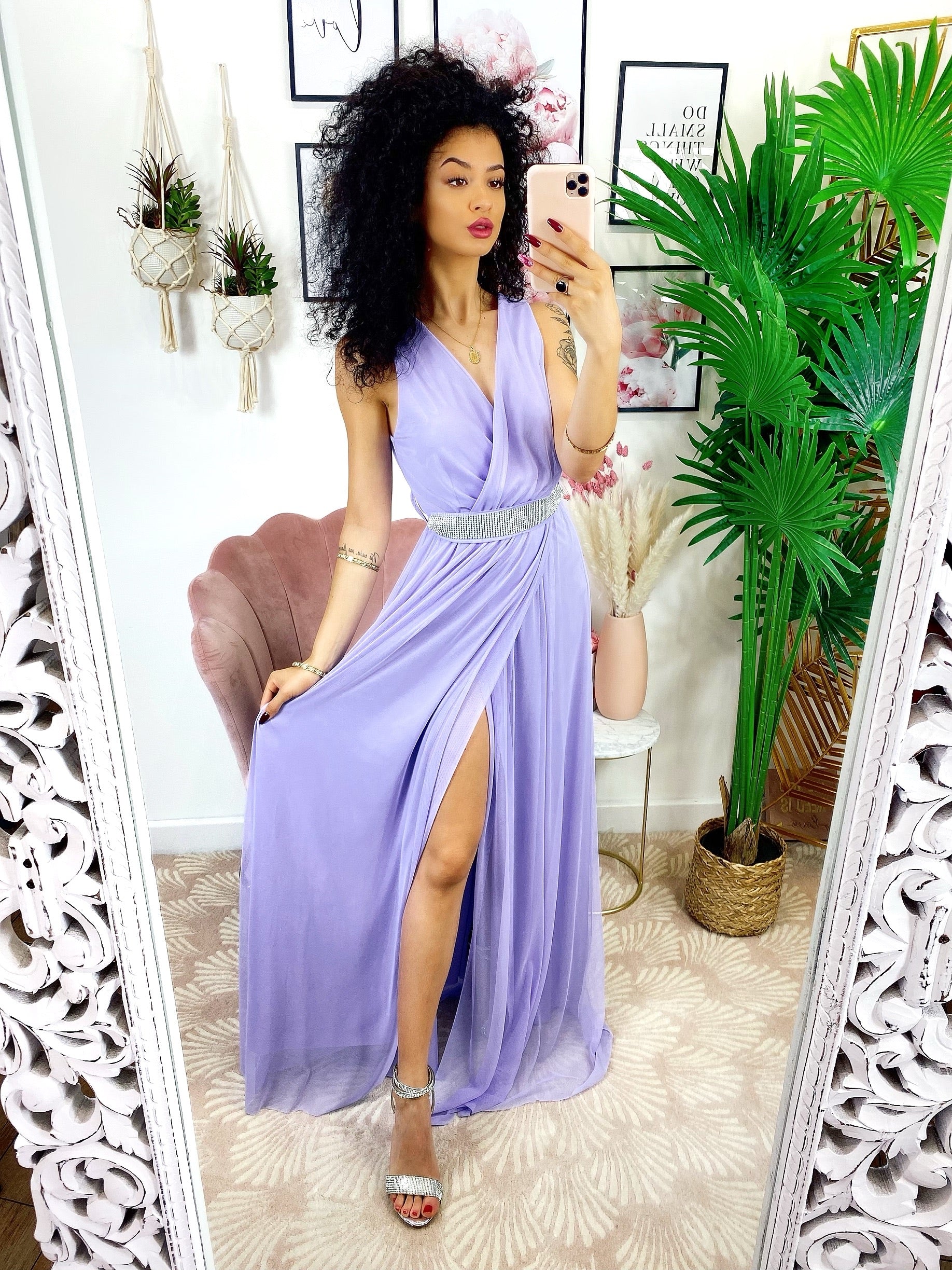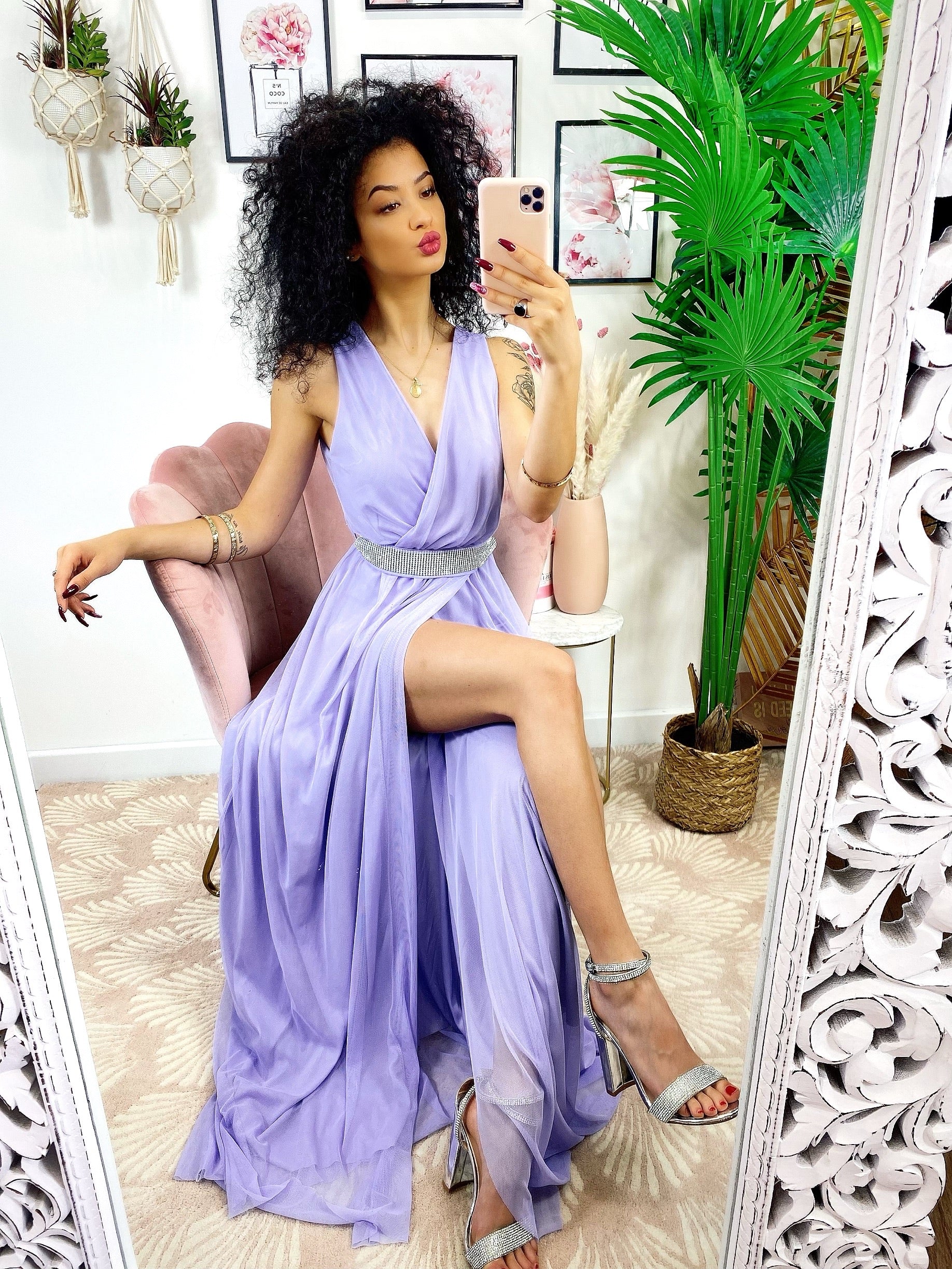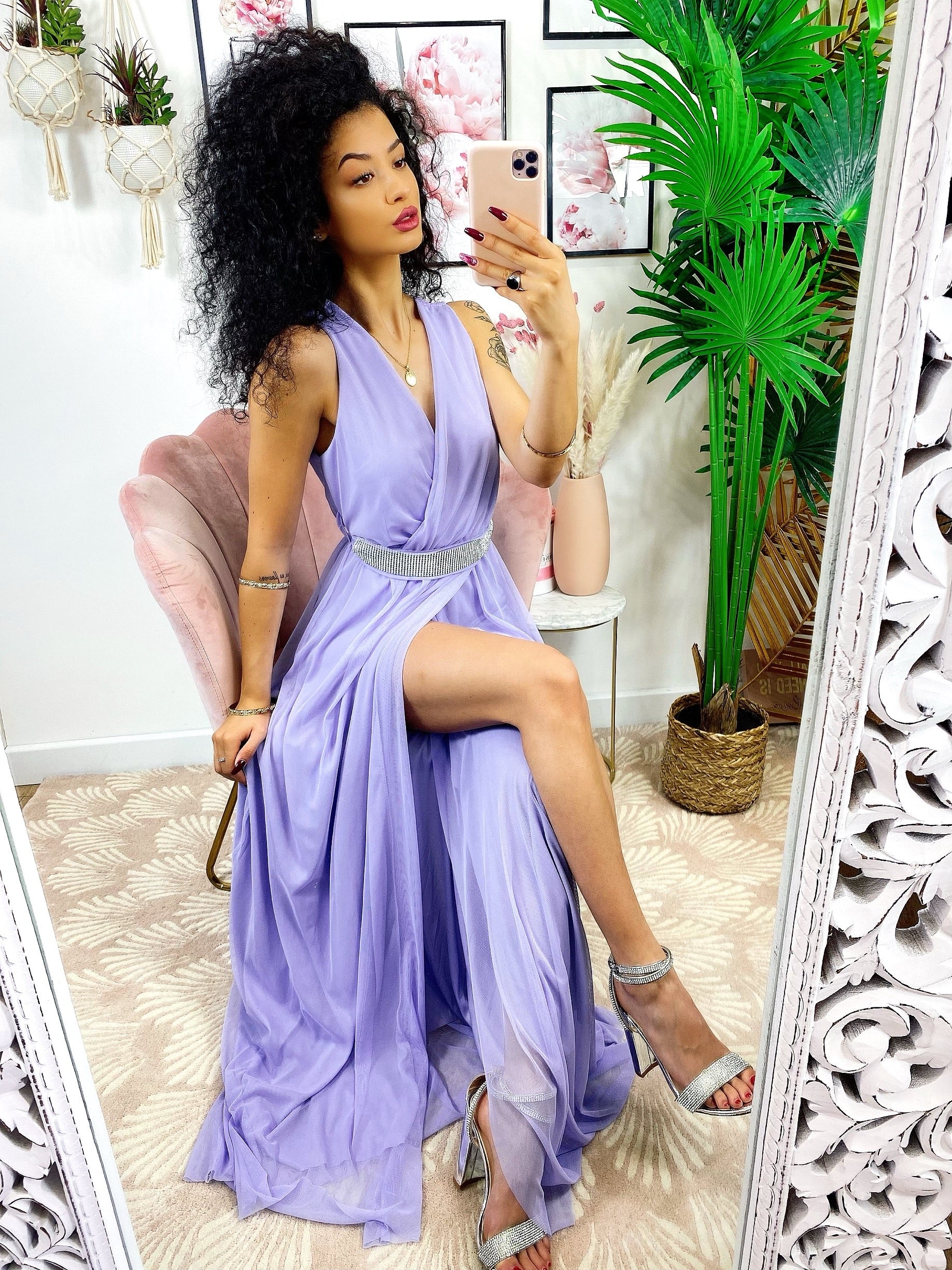 Liliowa tiulowa sukienka z paskiem z kryształków