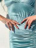 Aksamitna sukienka w kolorze turkusowo-zielonym ze wzmocnionymi ramiączkami.