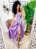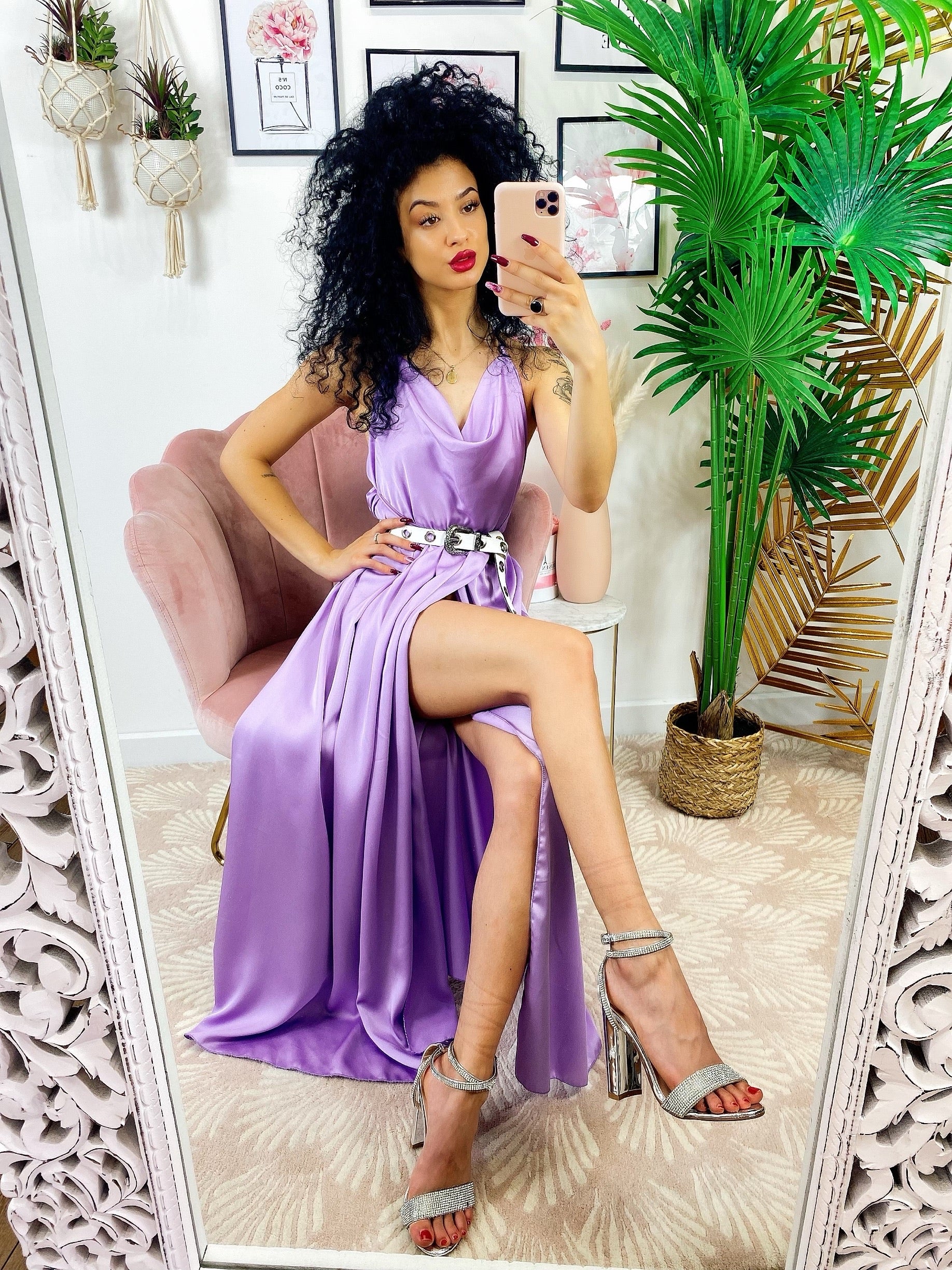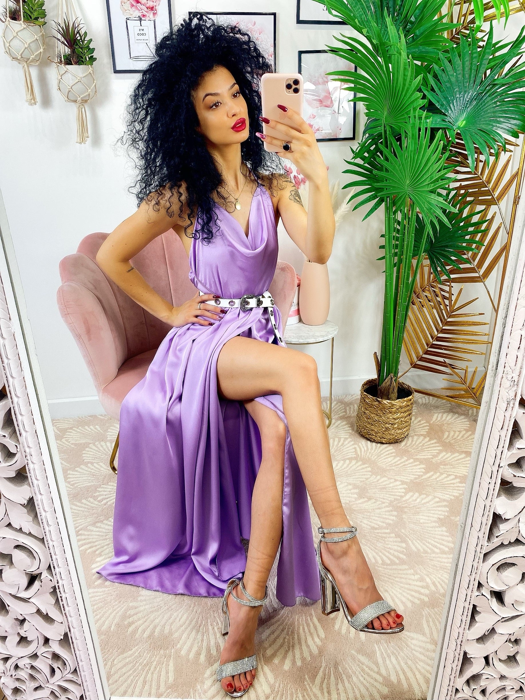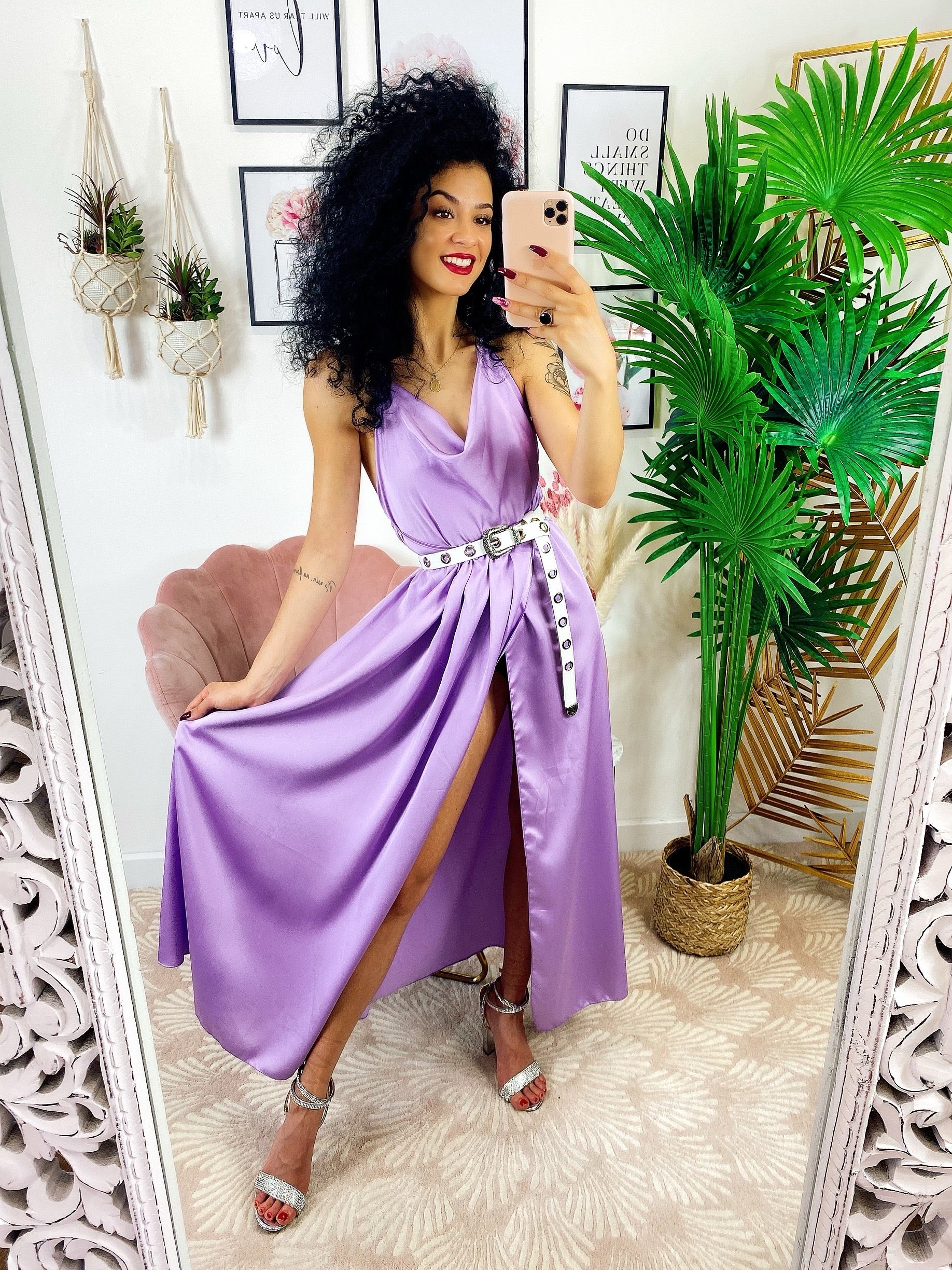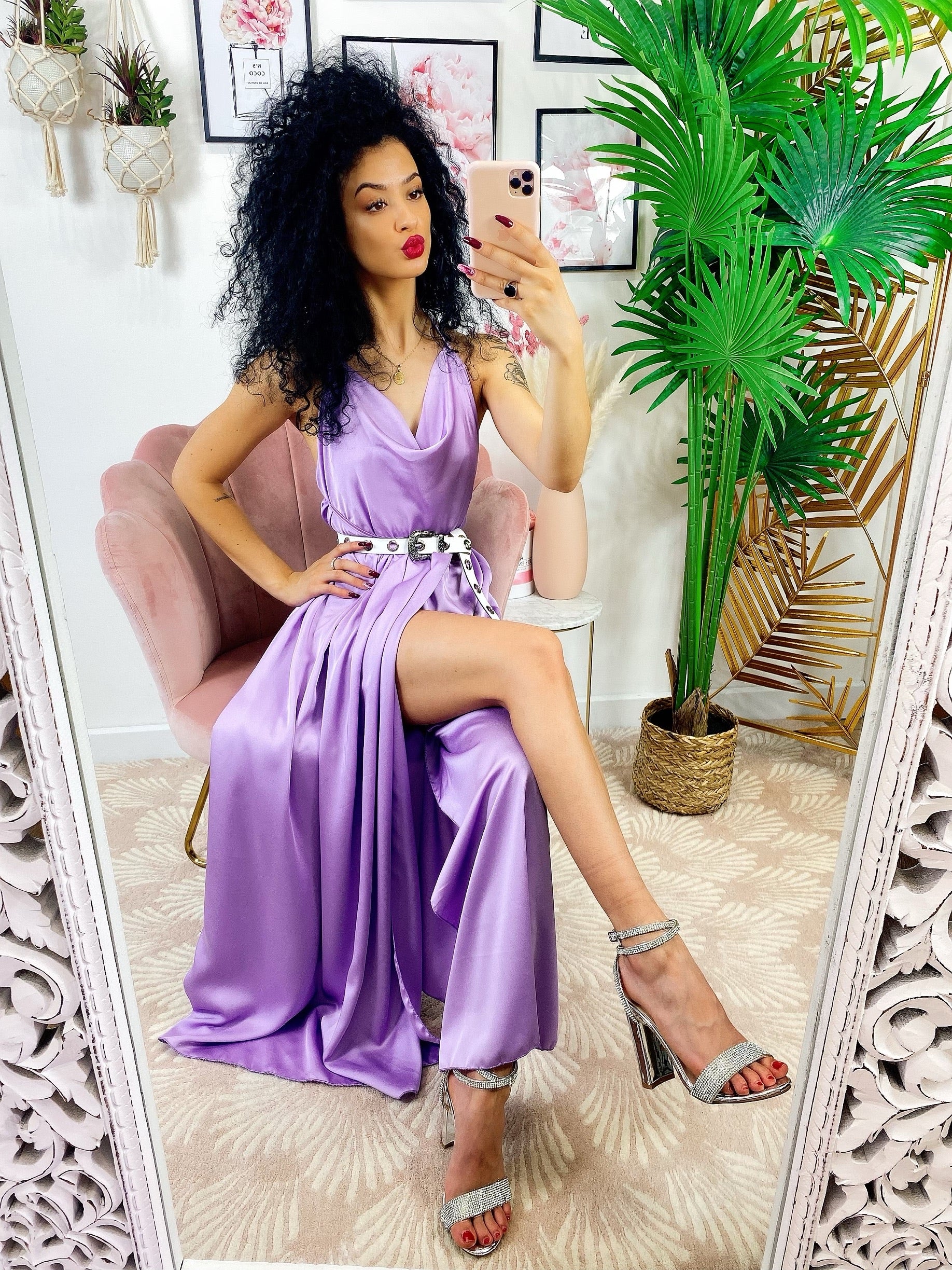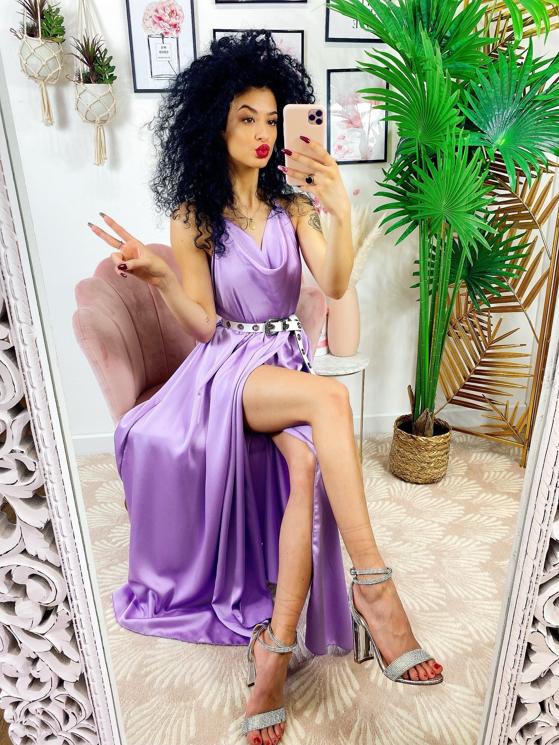 Satynowa sukienka midi z liliowym rozcięciem maxi