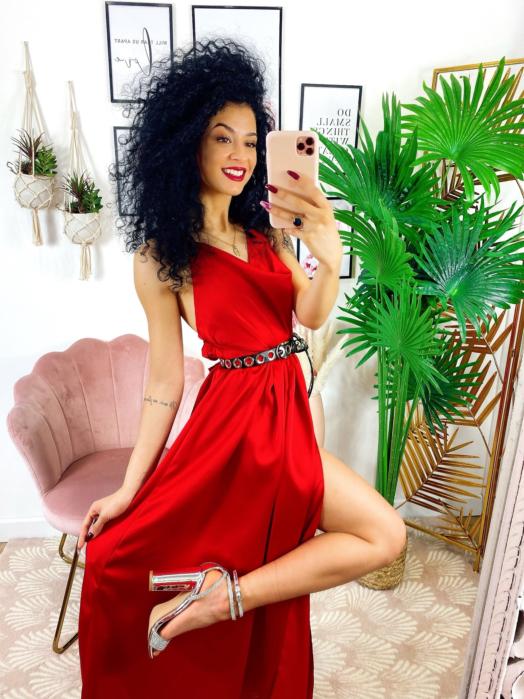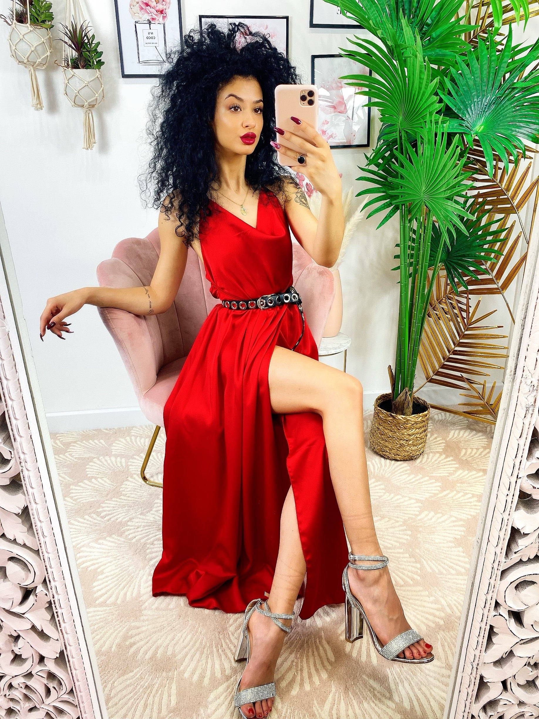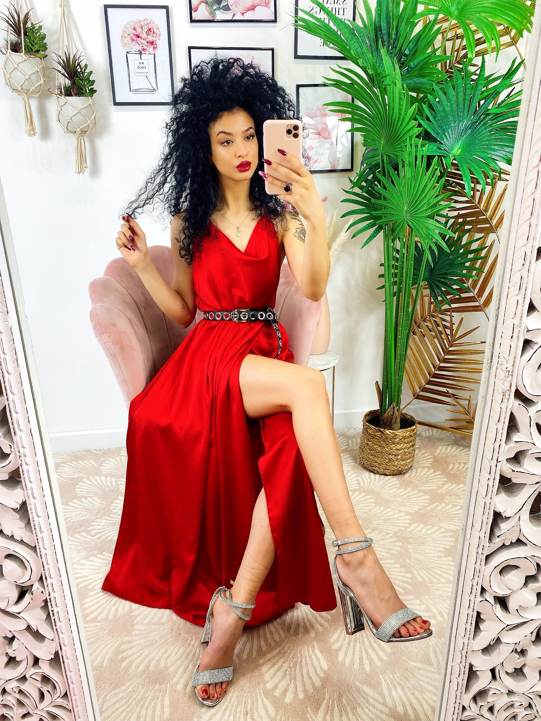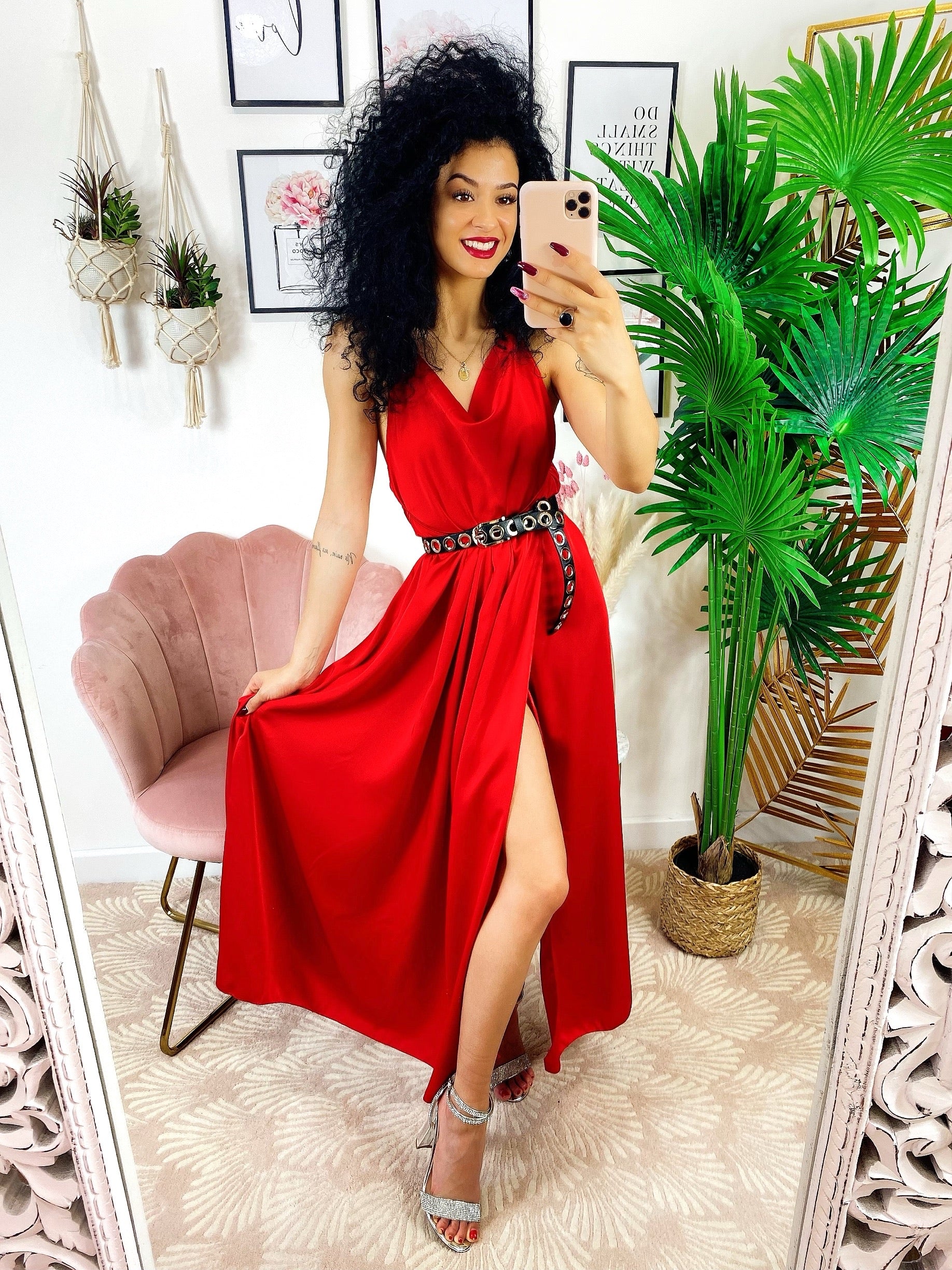 Satynowa sukienka midi z czerwonym rozcięciem maxi