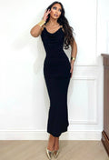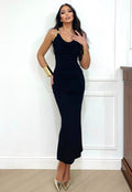 Abito in lycra aderente e elasticizzato con fodera, coppe e spalline con gioiello. Schiena incrociata