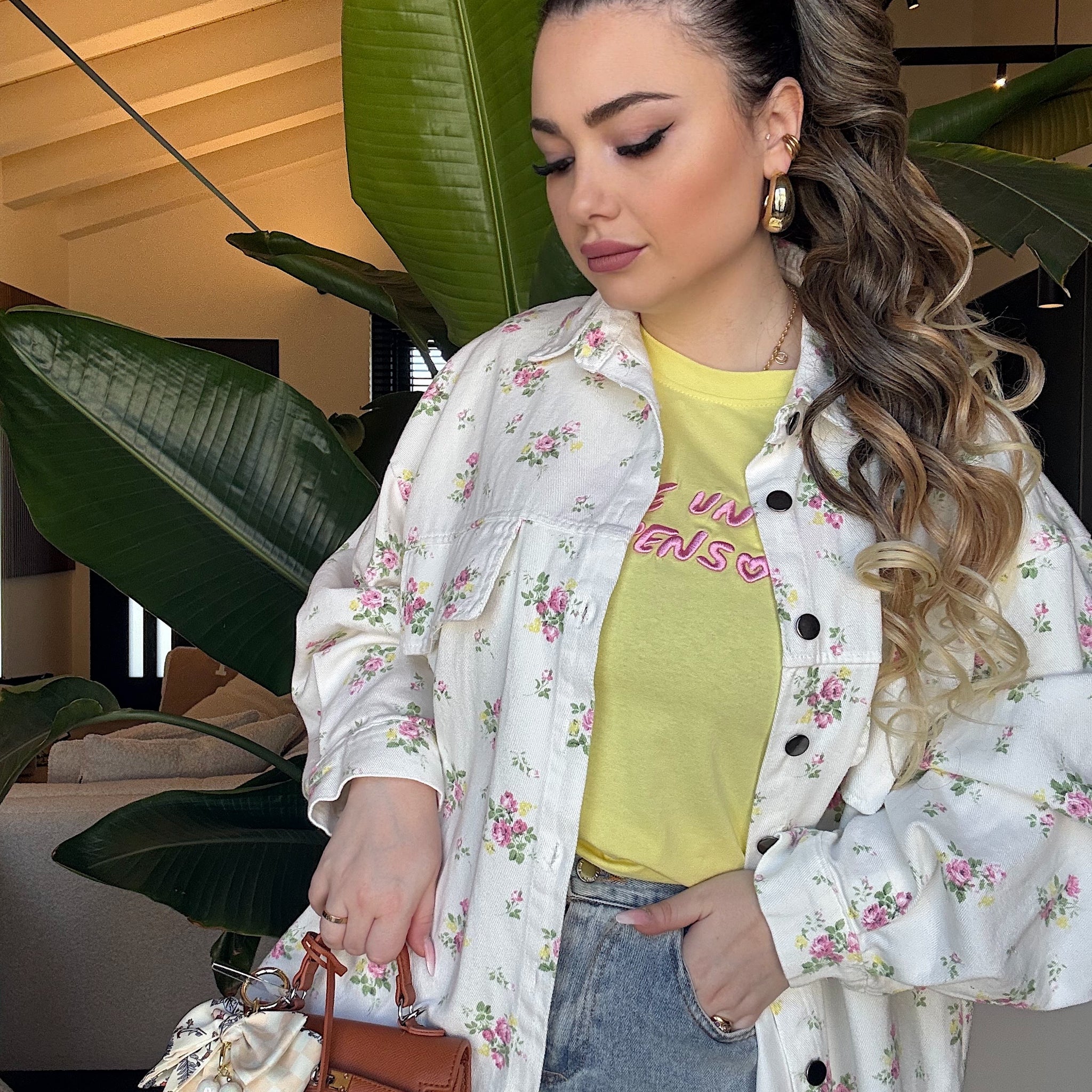 Camicia in denim vesribilota morbida con stampa a fiori